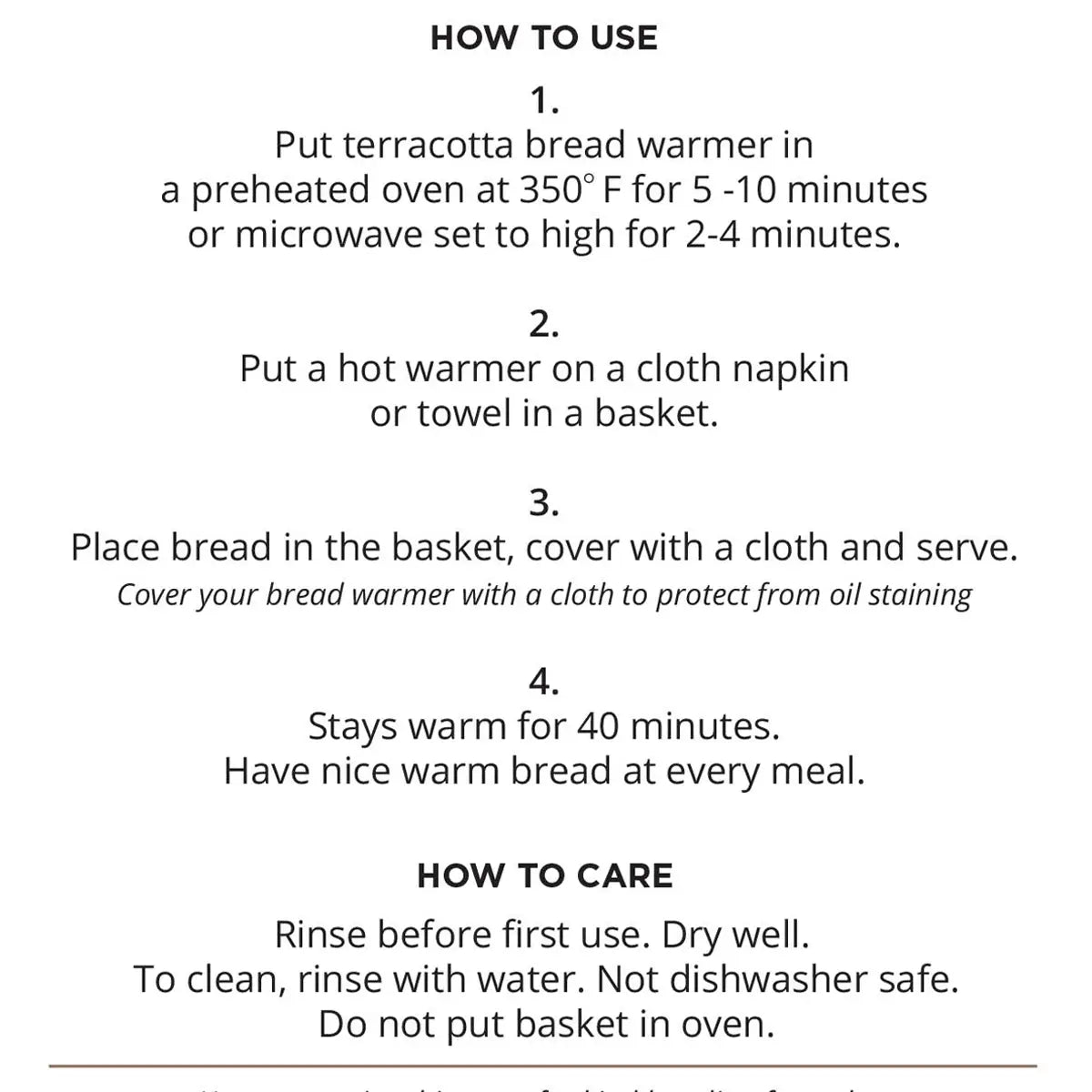- Bread warmer: Wipe stone clean with a damp cloth. Dry well. Not dishwasher safe.