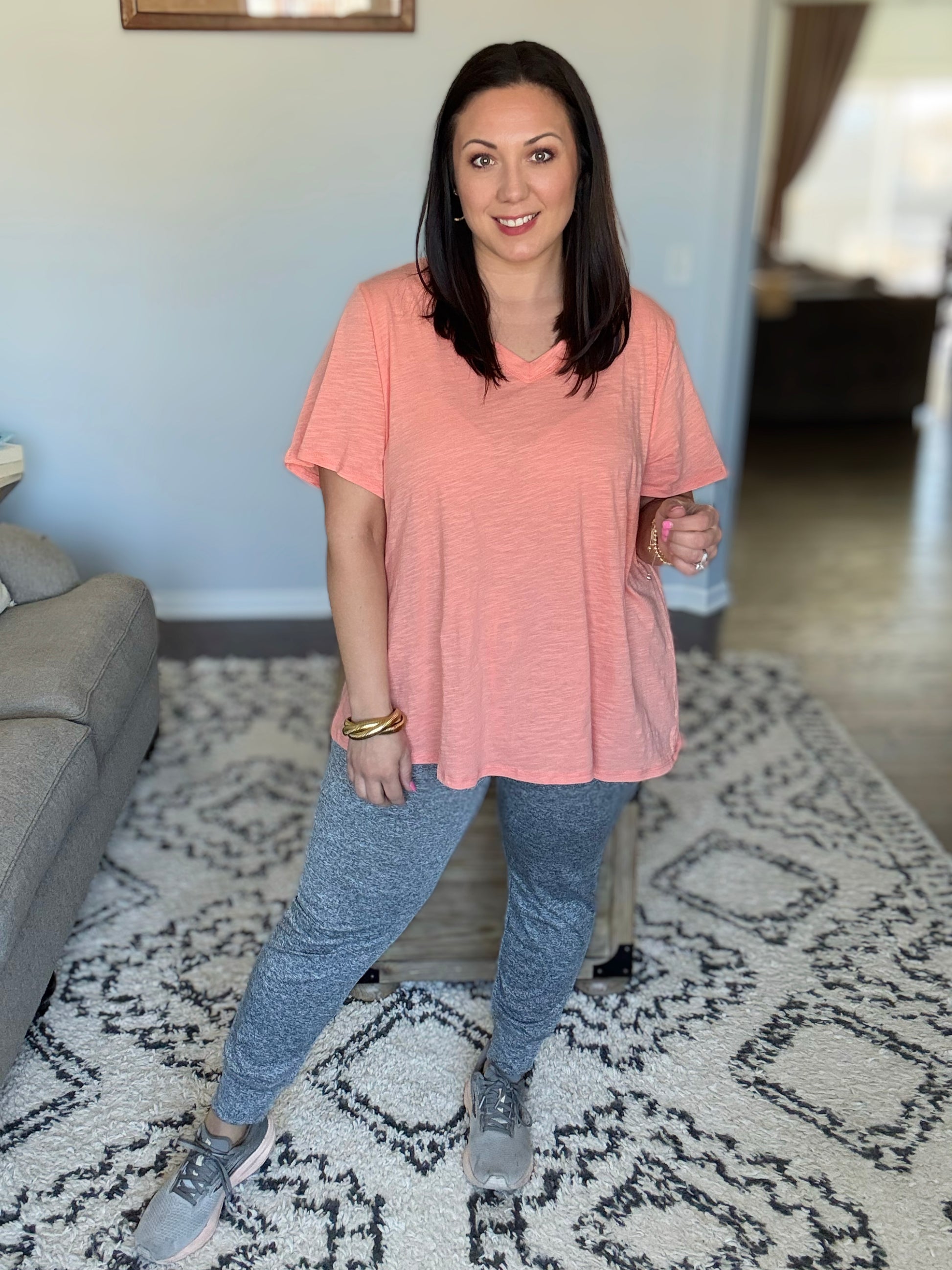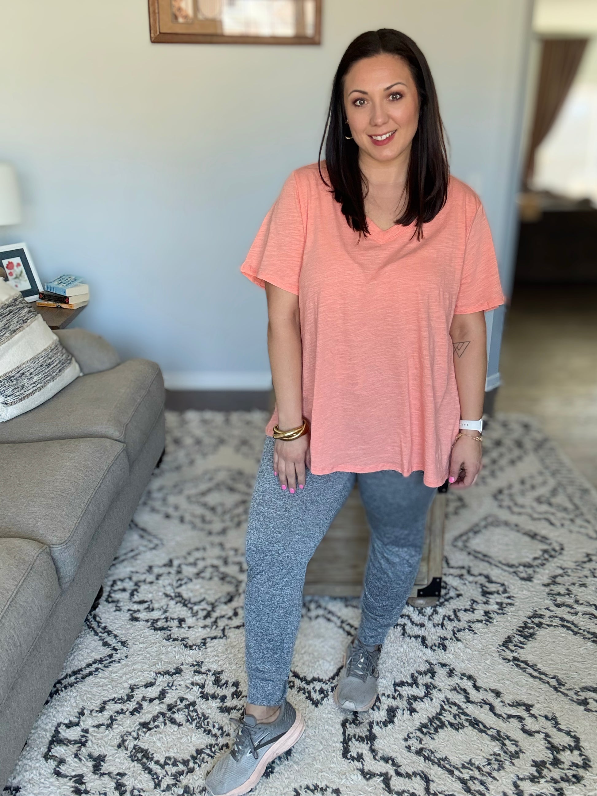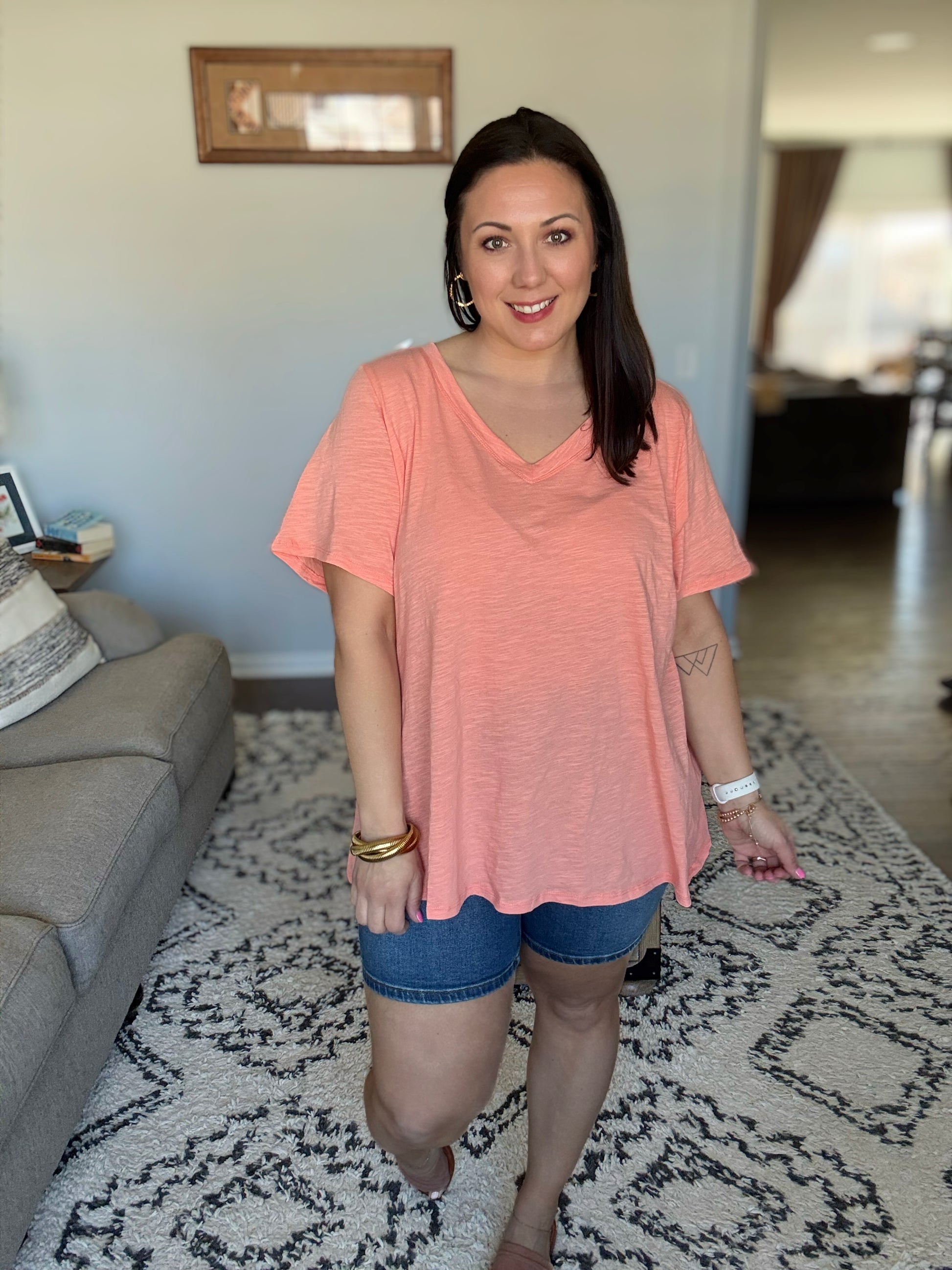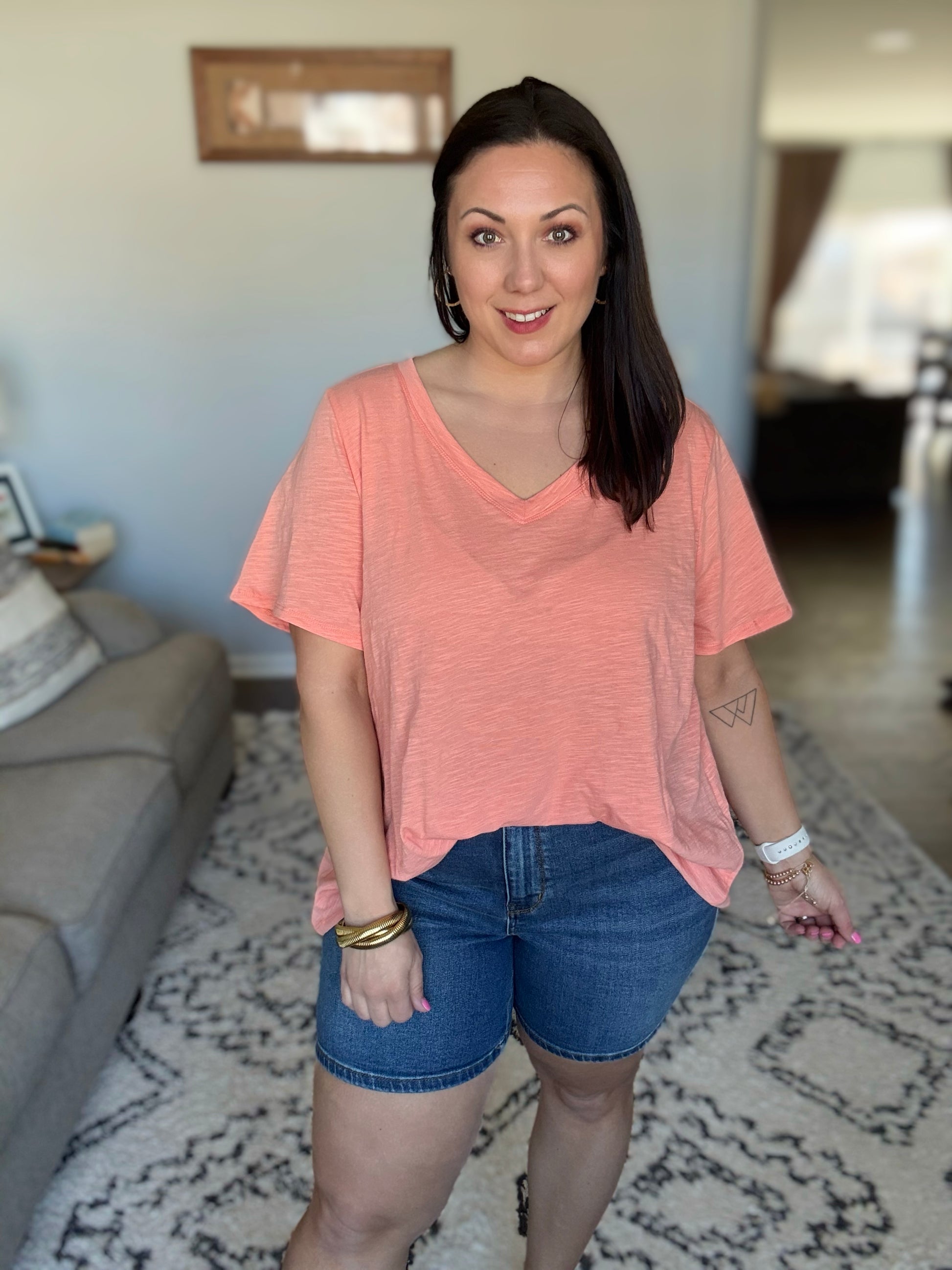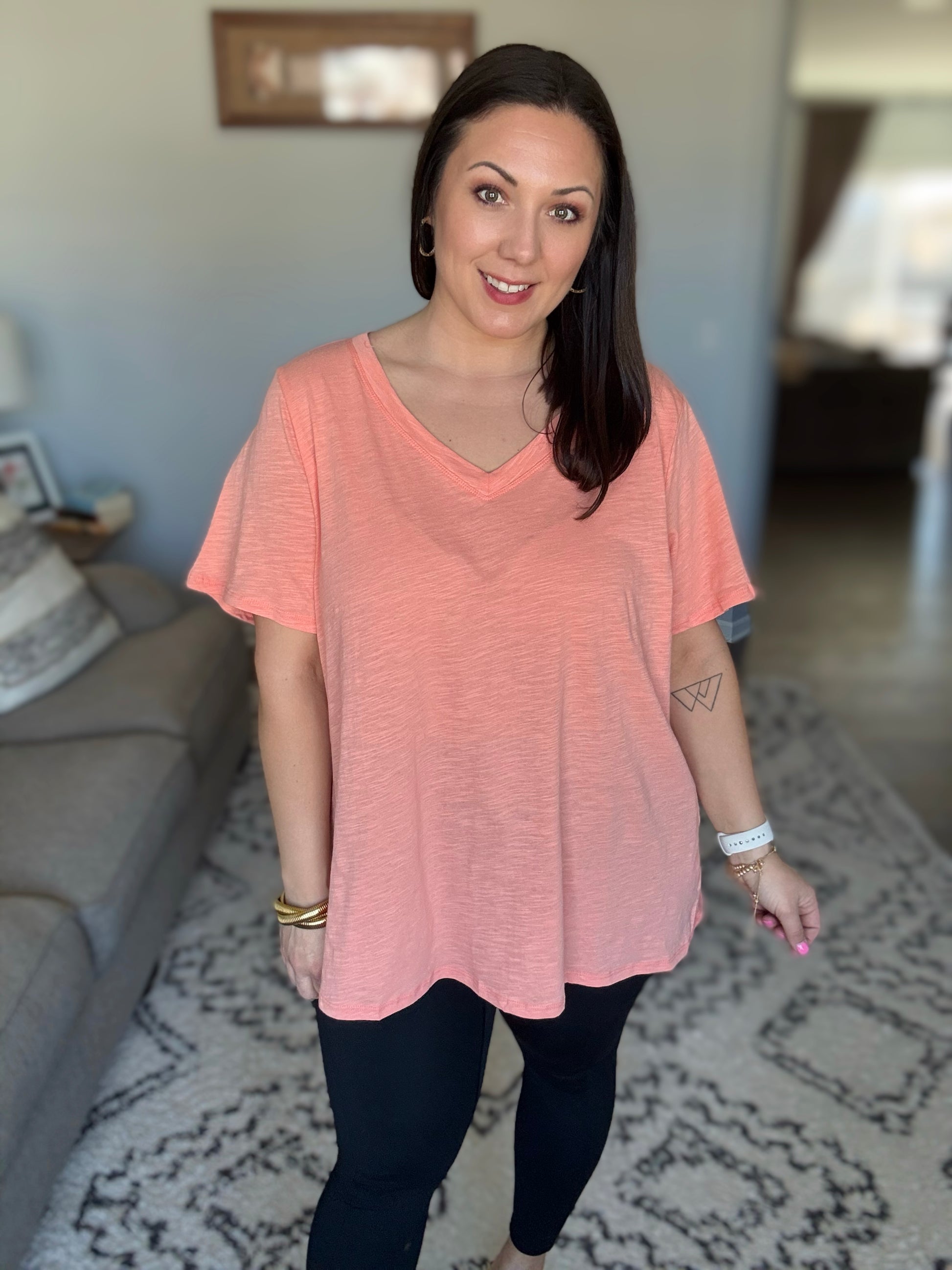 The I Don’t Have to Choose V-Neck Tee is the perfect combination of simplicity and style. Made from lightweight woven fabric, this tee features a flattering banded V-neckline that adds a subtle touch of sophistication. Its relaxed fit makes it a versatile choice for layering or wearing on its own, offering endless outfit possibilities without the need to choose!