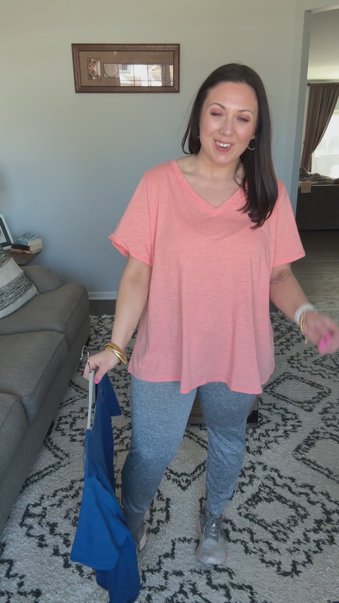 Amanda is wearing large in navy and 1X in apricot ice
