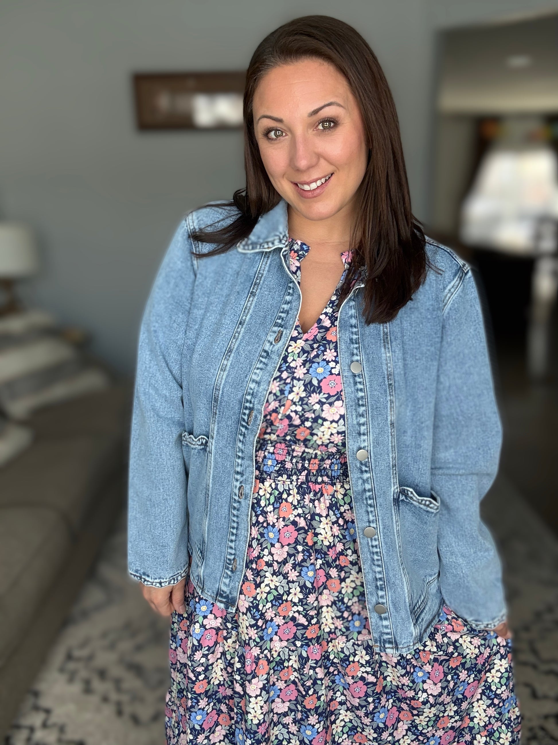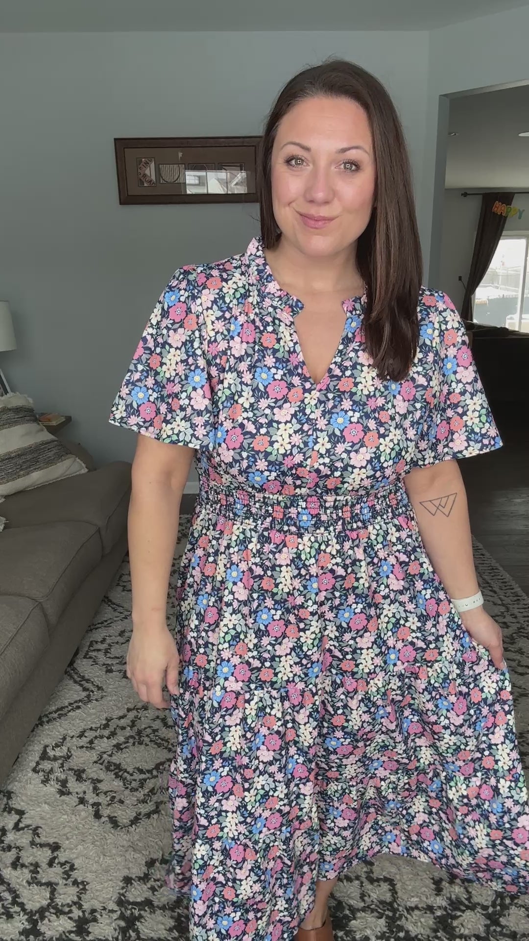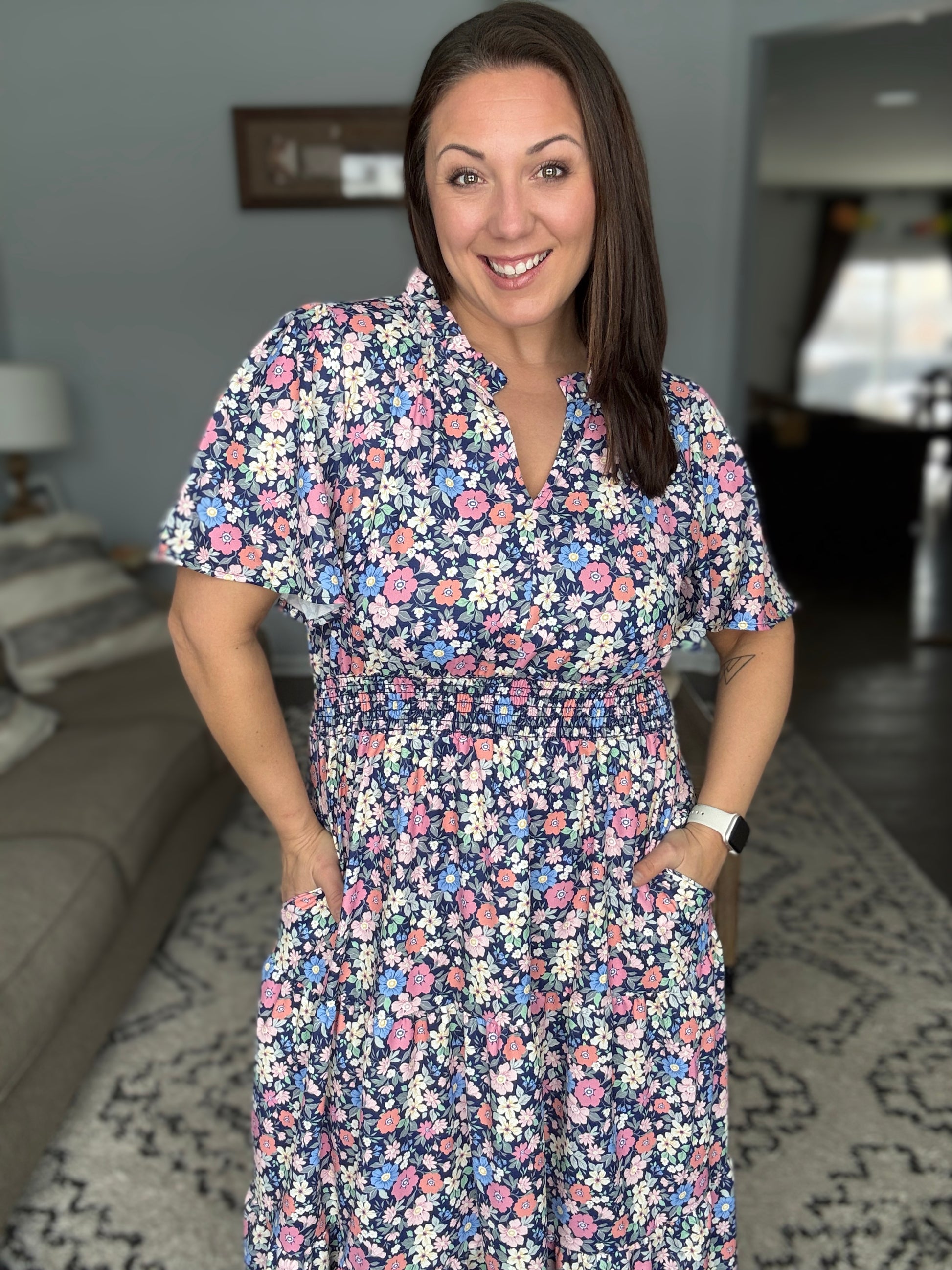 The I Wanna Talk Notch Neck Midi Dress features a charming woven construction with a distinctive notch neckline accented by delicate neck ruffles. Flutter sleeves add movement and elegance, while the smocked elastic waist provides comfortable shaping. Gathered tiers create a flattering silhouette that flows beautifully down the midi length. Functional side pockets offer practical convenience, and the structured no-stretch fabric ensures a polished, tailored look all day long.