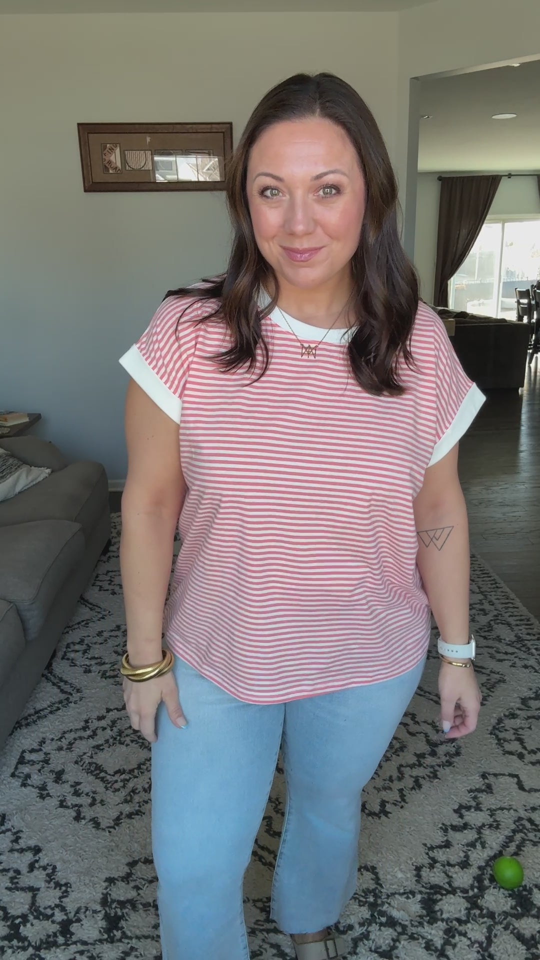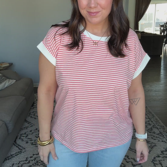 Zenana Full Size Contrast Trim Cap Sleeve Stripe Tee in Coral