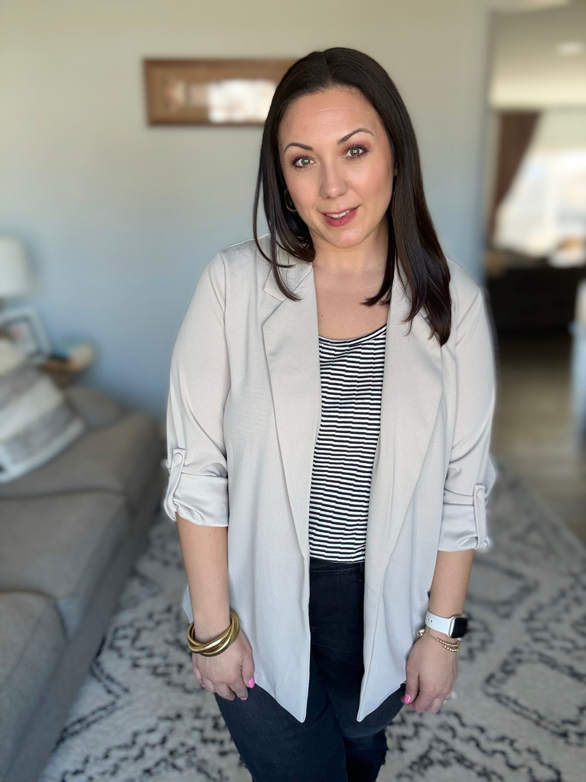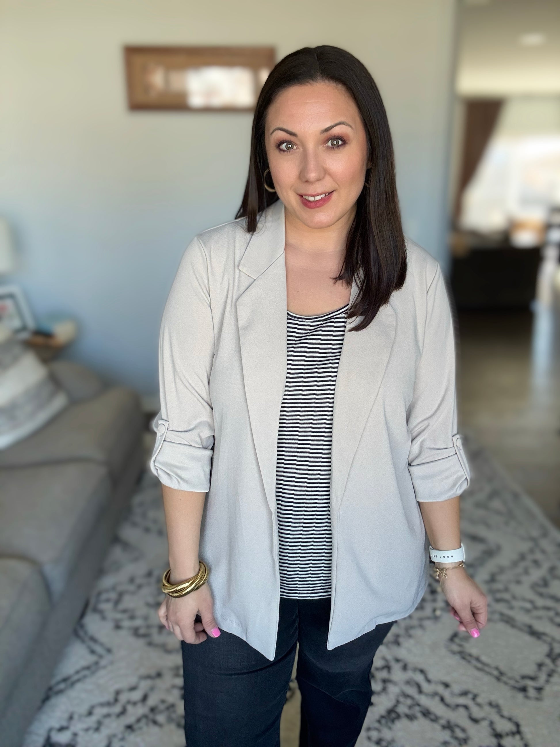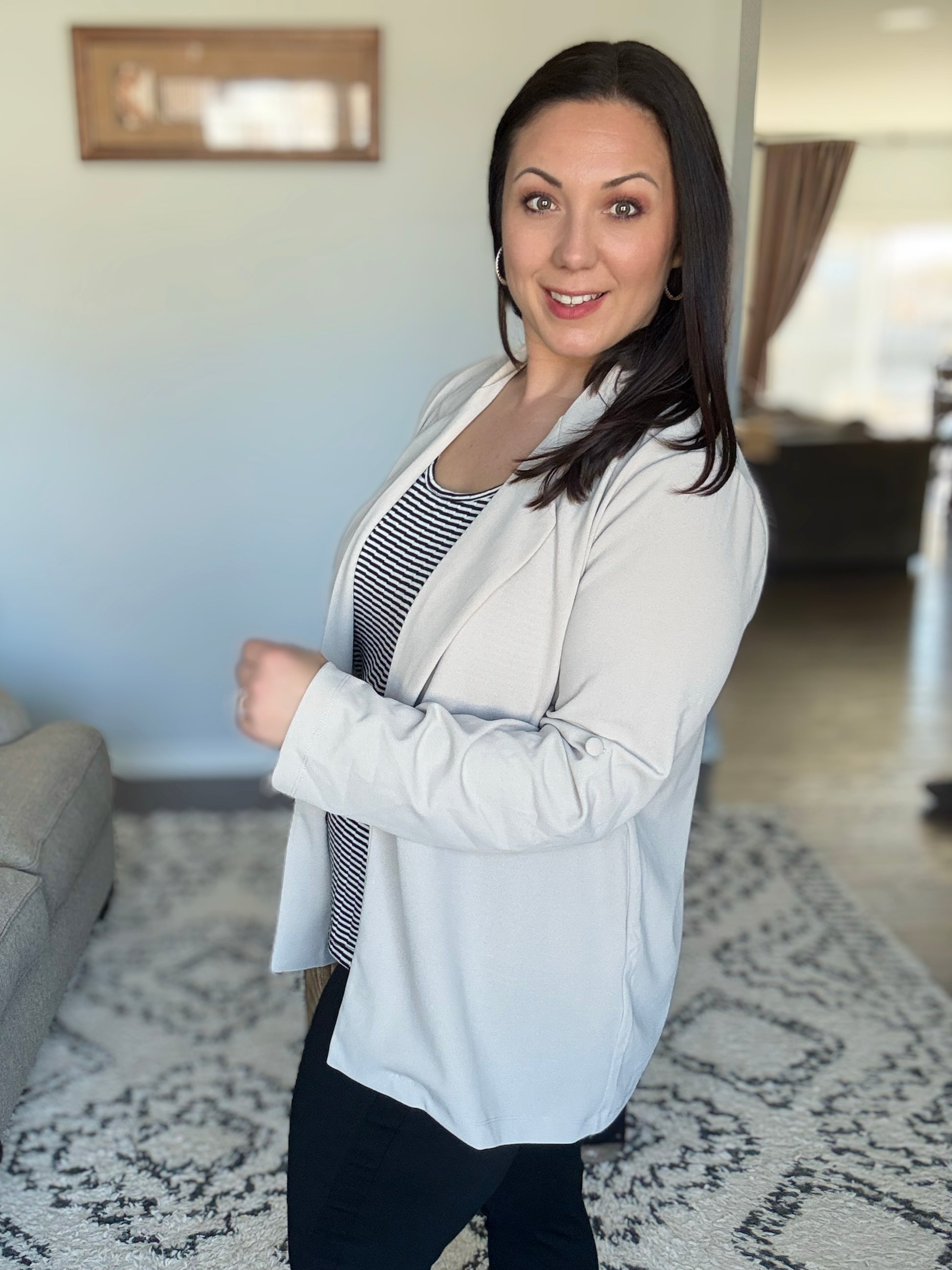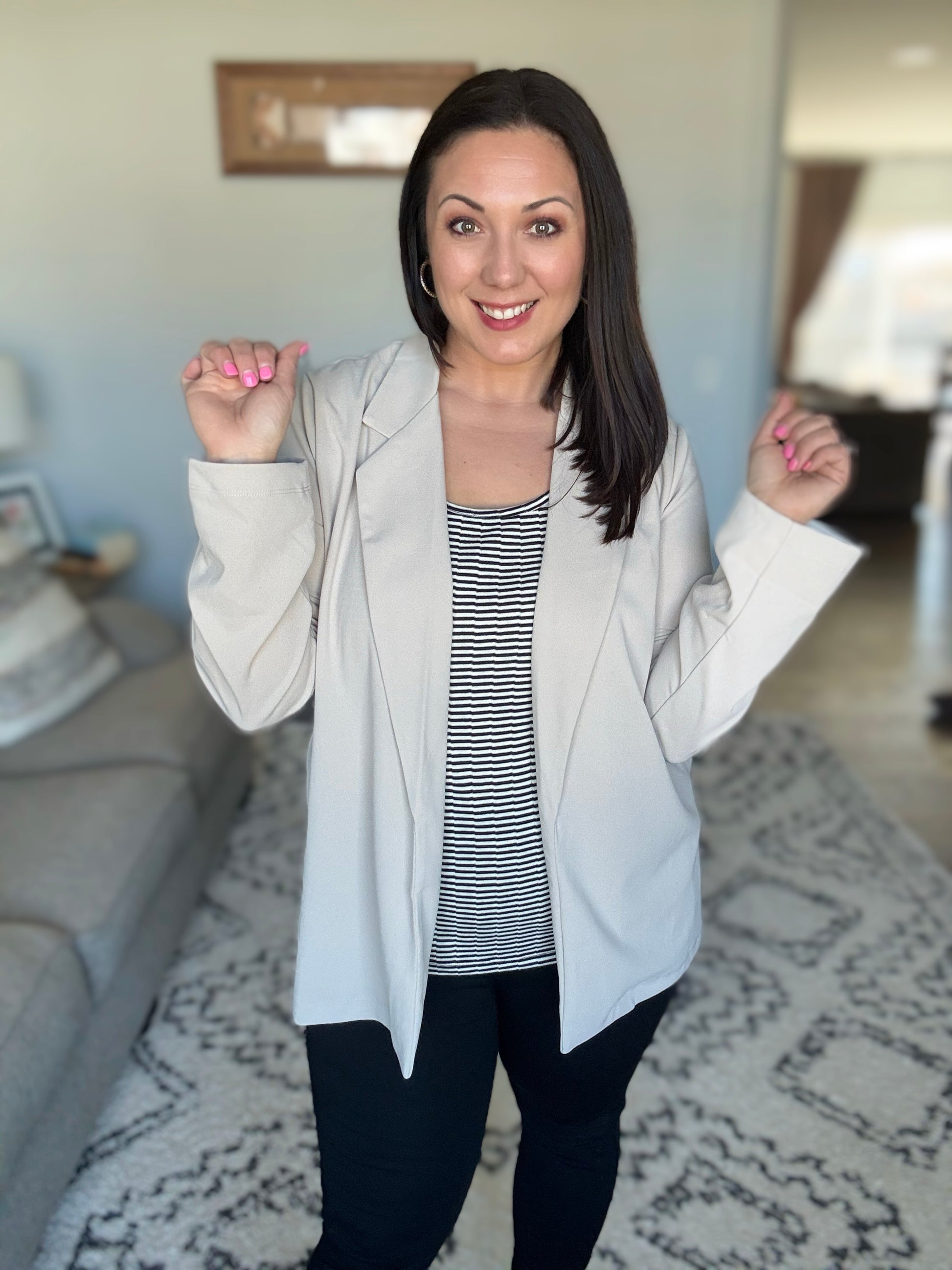 The I'm Really That Gal Open Front Blazer is the ultimate statement piece for any wardrobe. Crafted from sleek polyester crepe, this blazer features a classic collared design with an open front that exudes effortless sophistication. The fabric is lightweight, has perfect flow and subtle stretch, Functional side pockets add practicality, while the sleeve tab detail offers a subtle touch of style. The button on the sleeve tab is fully functional and can be undone to reveal a full length sleeve. Whether you're dressing up for a meeting or pairing it with jeans for a chic, casual look, this blazer will quickly become your go-to for polished, modern style.