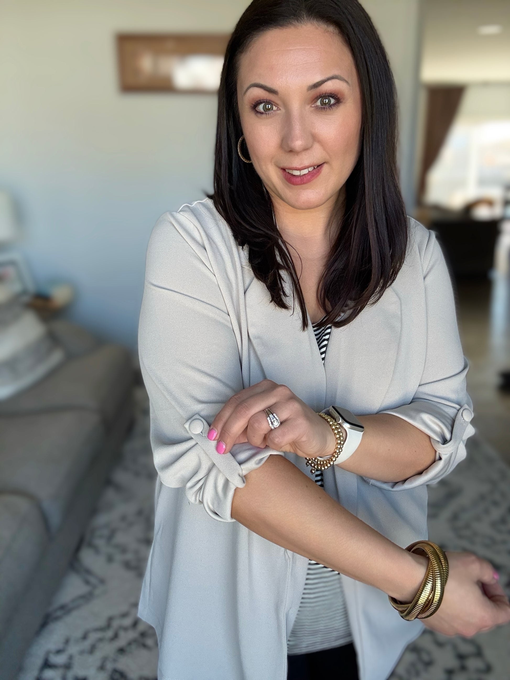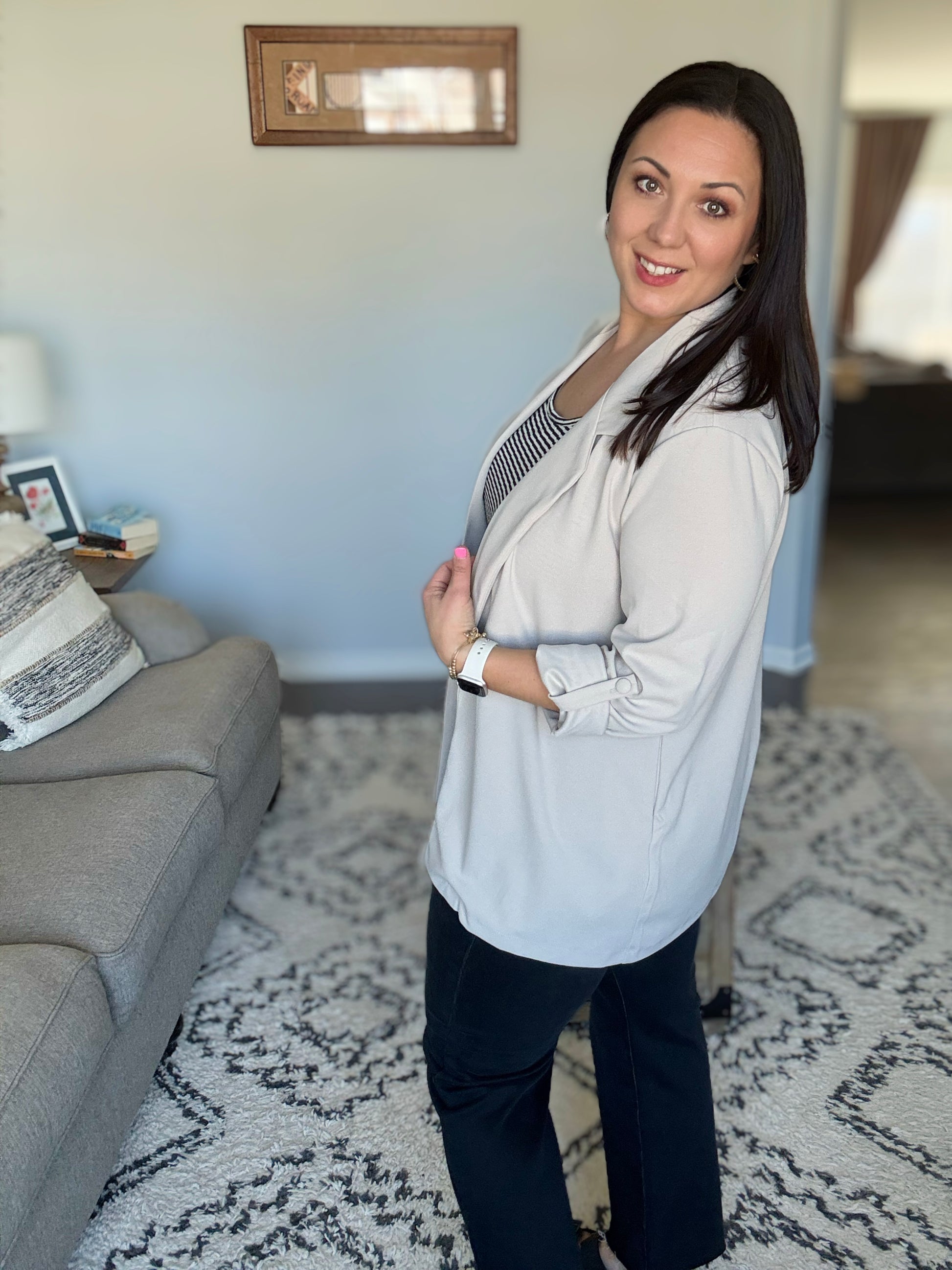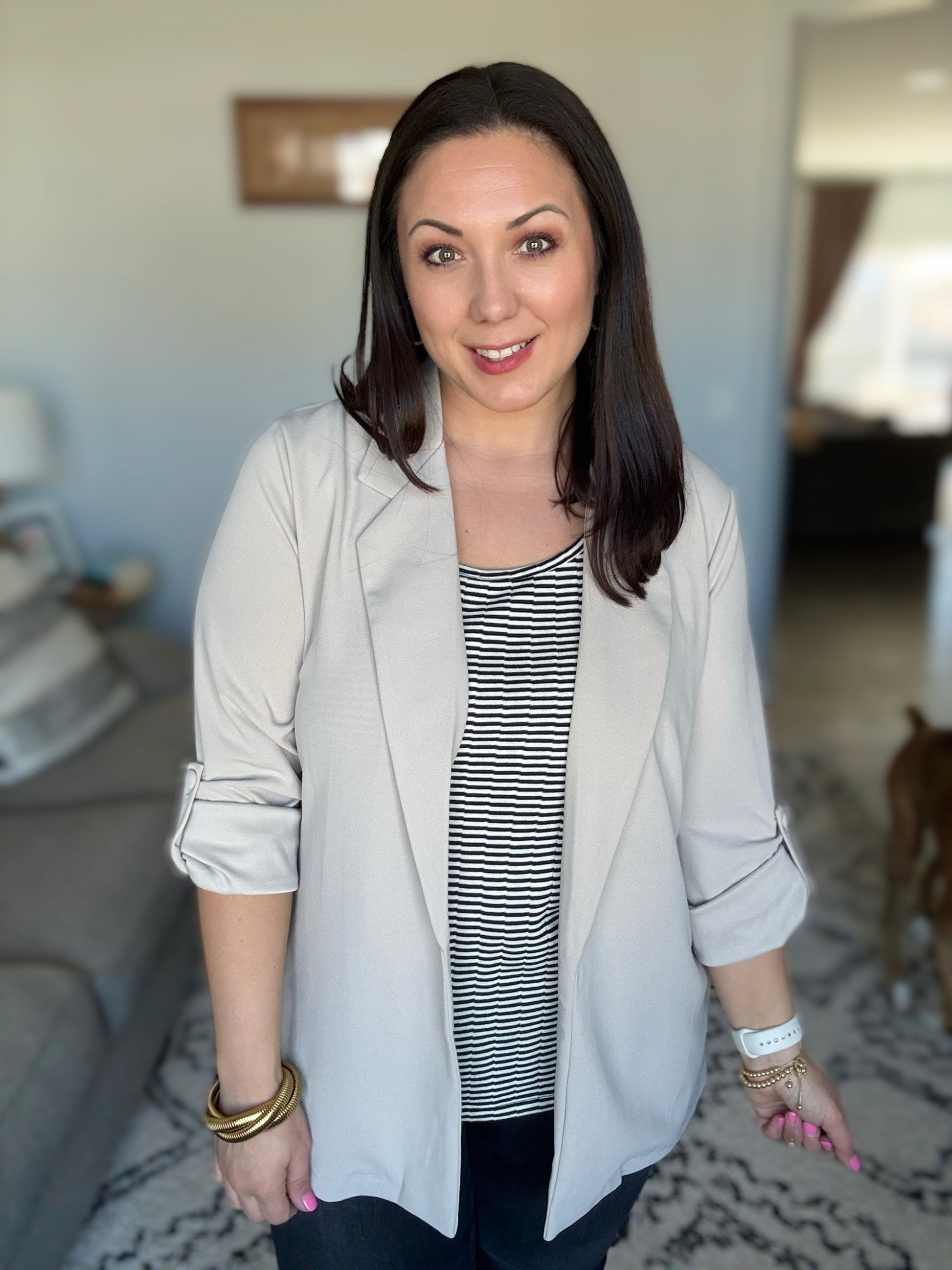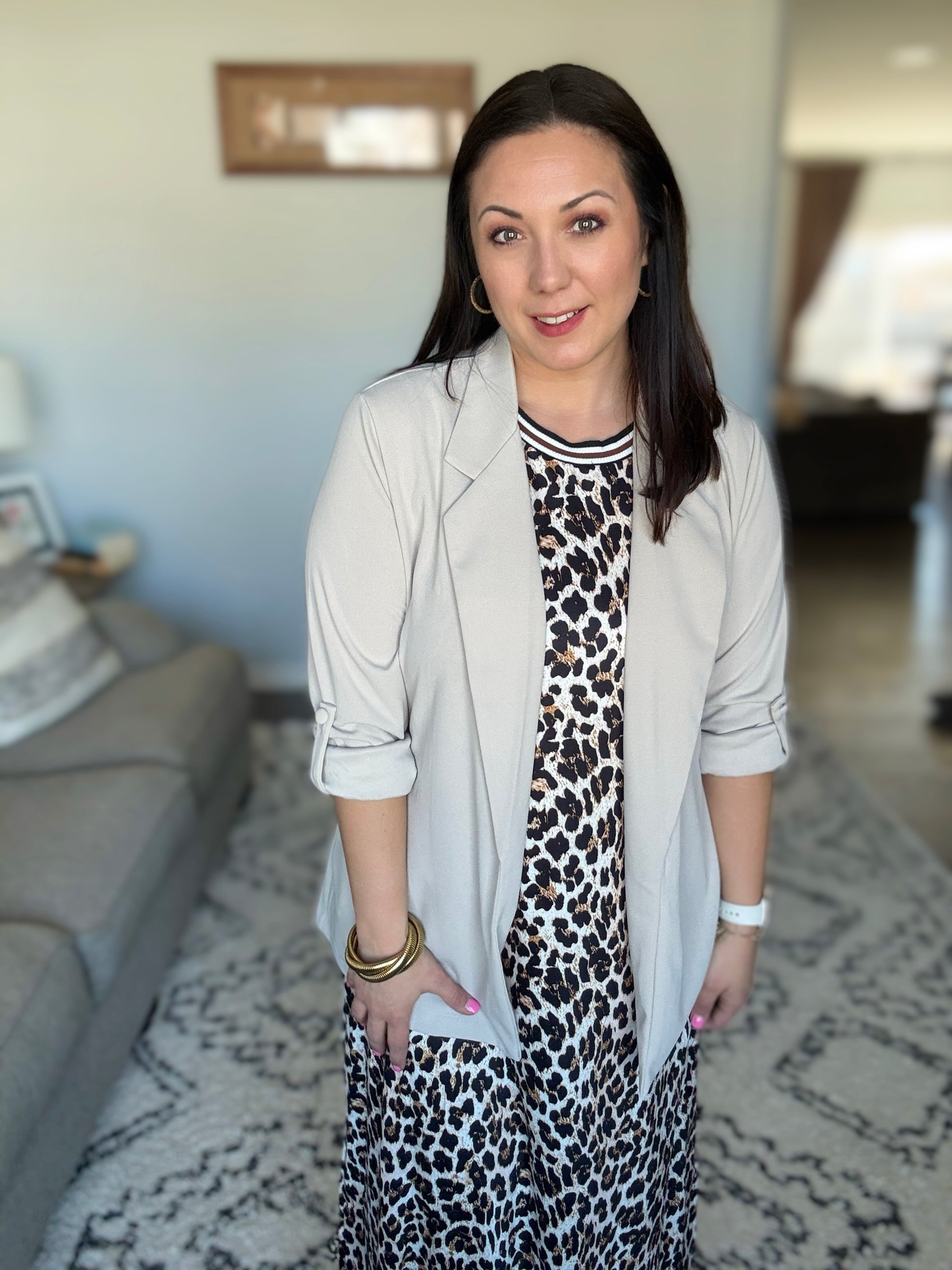 The I'm Really That Gal Open Front Blazer is the ultimate statement piece for any wardrobe. Crafted from sleek polyester crepe, this blazer features a classic collared design with an open front that exudes effortless sophistication. The fabric is lightweight, has perfect flow and subtle stretch, Functional side pockets add practicality, while the sleeve tab detail offers a subtle touch of style. The button on the sleeve tab is fully functional and can be undone to reveal a full length sleeve. Whether you're dressing up for a meeting or pairing it with jeans for a chic, casual look, this blazer will quickly become your go-to for polished, modern style.