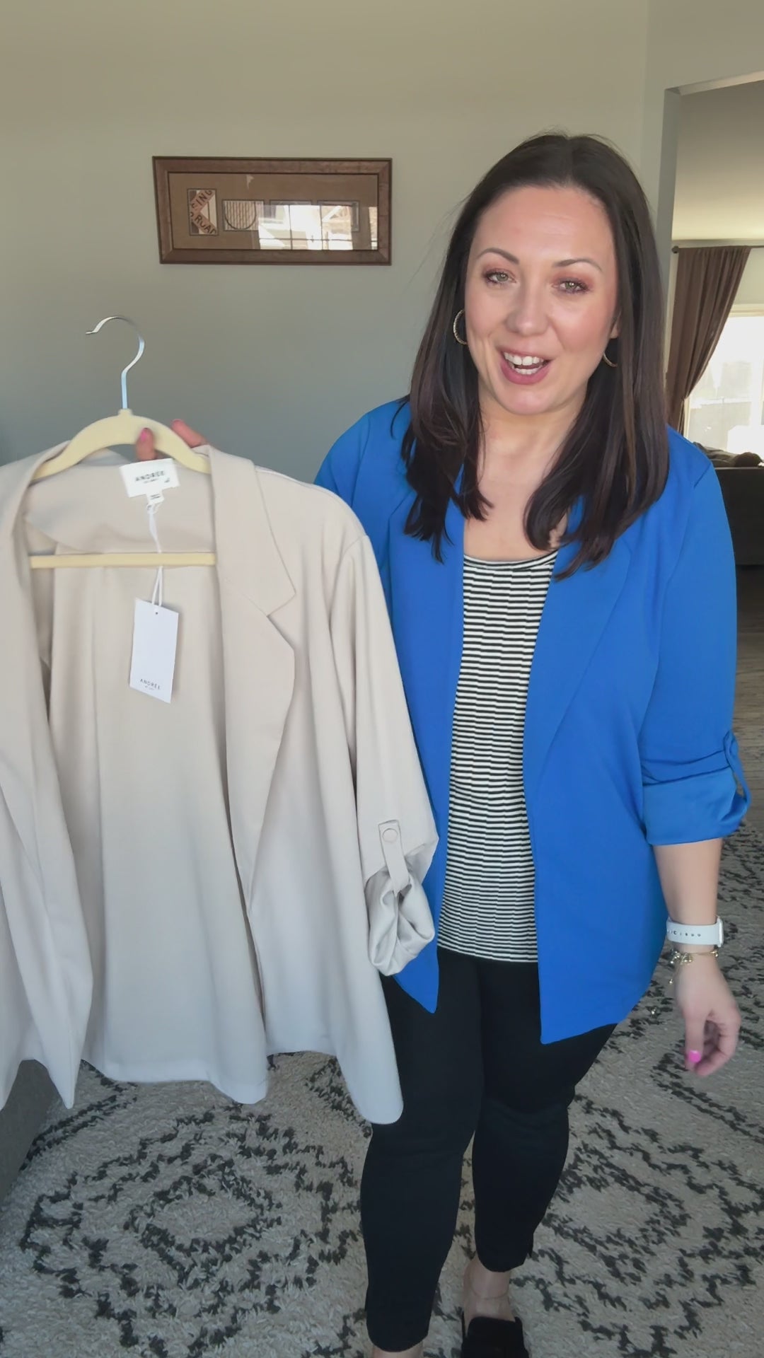 The I'm Really That Gal Open Front Blazer is the ultimate statement piece for any wardrobe. Crafted from sleek polyester crepe, this blazer features a classic collared design with an open front that exudes effortless sophistication. The fabric is lightweight, has perfect flow and subtle stretch, Functional side pockets add practicality, while the sleeve tab detail offers a subtle touch of style. The button on the sleeve tab is fully functional and can be undone to reveal a full length sleeve. Whether you're dressing up for a meeting or pairing it with jeans for a chic, casual look, this blazer will quickly become your go-to for polished, modern style.