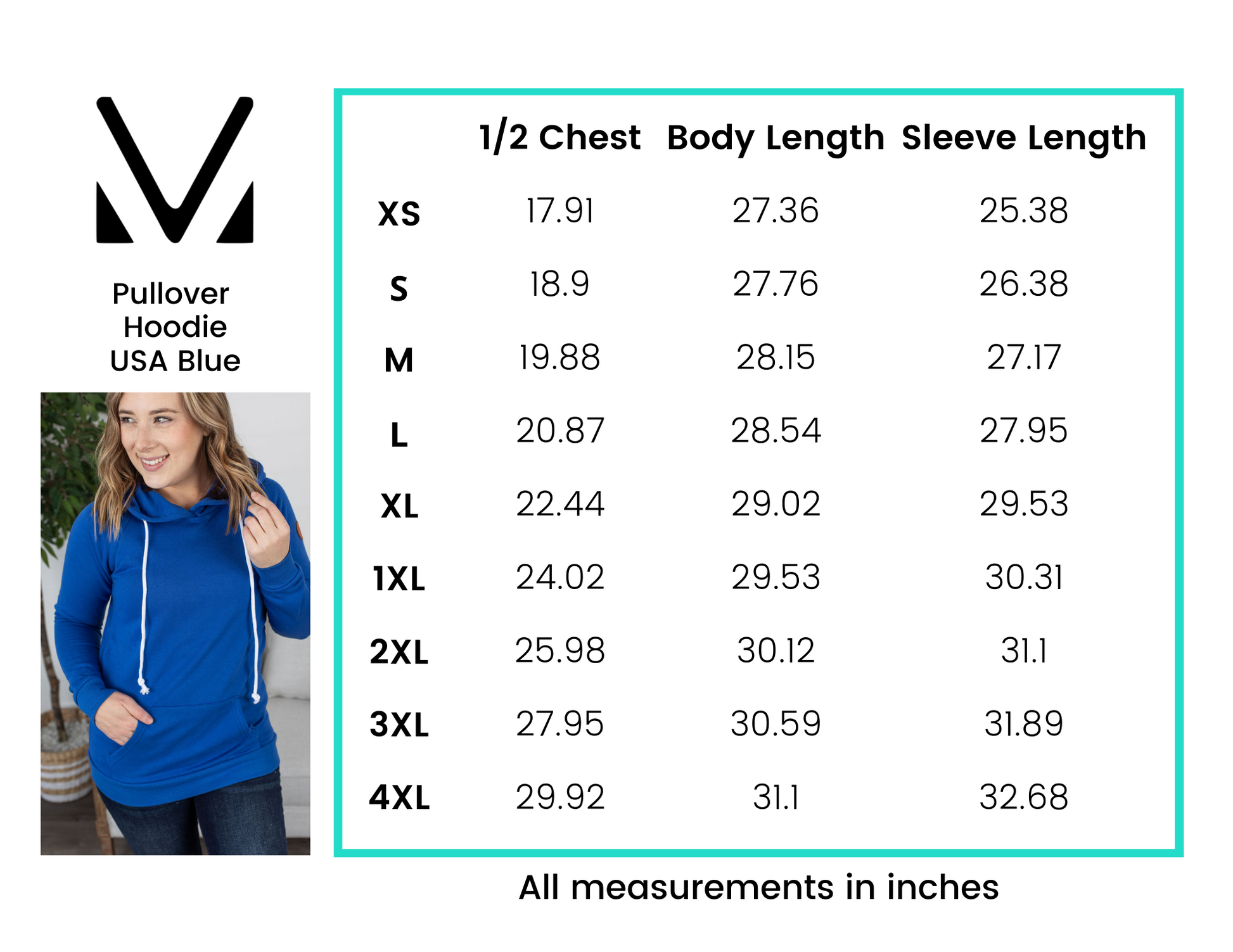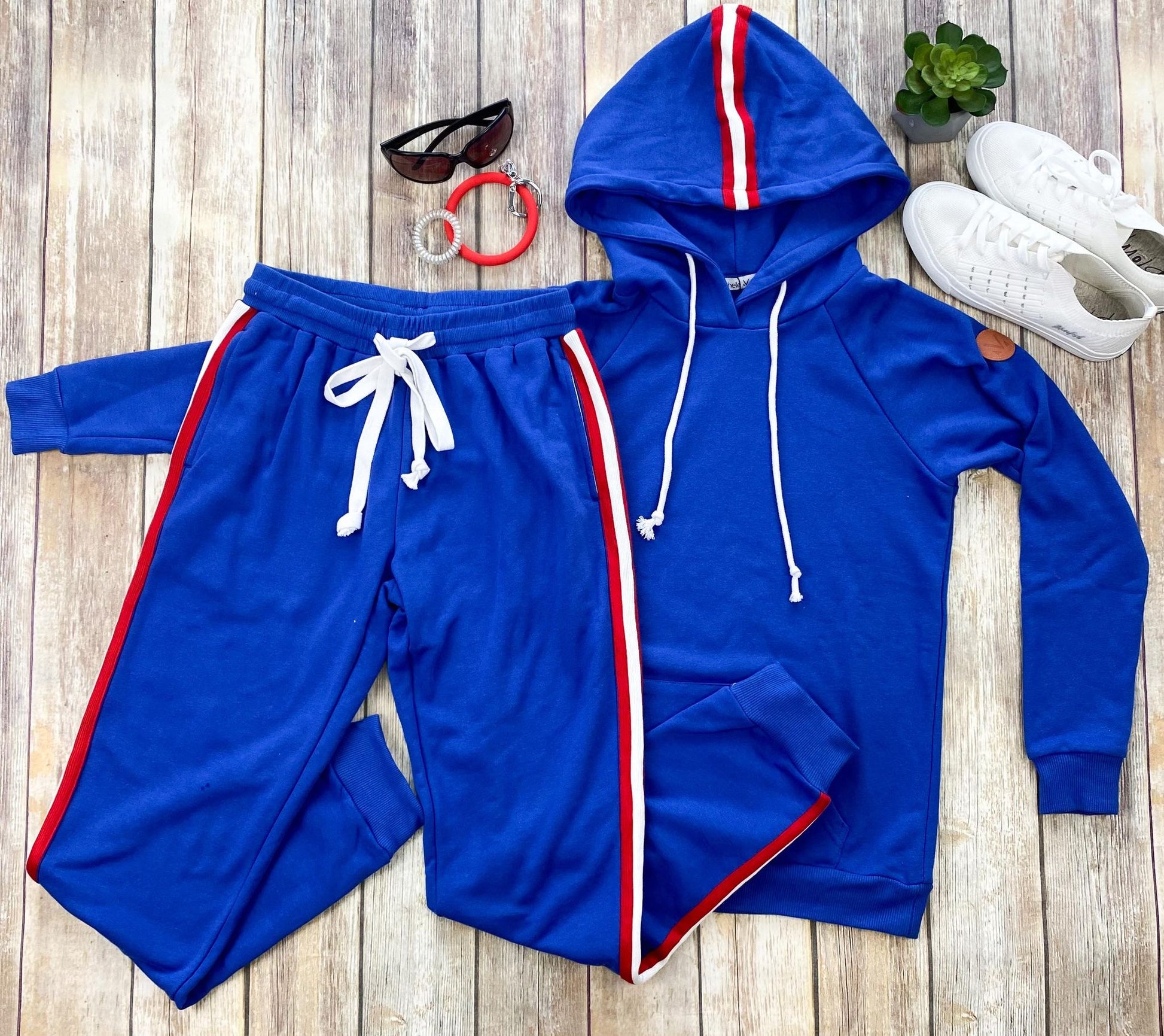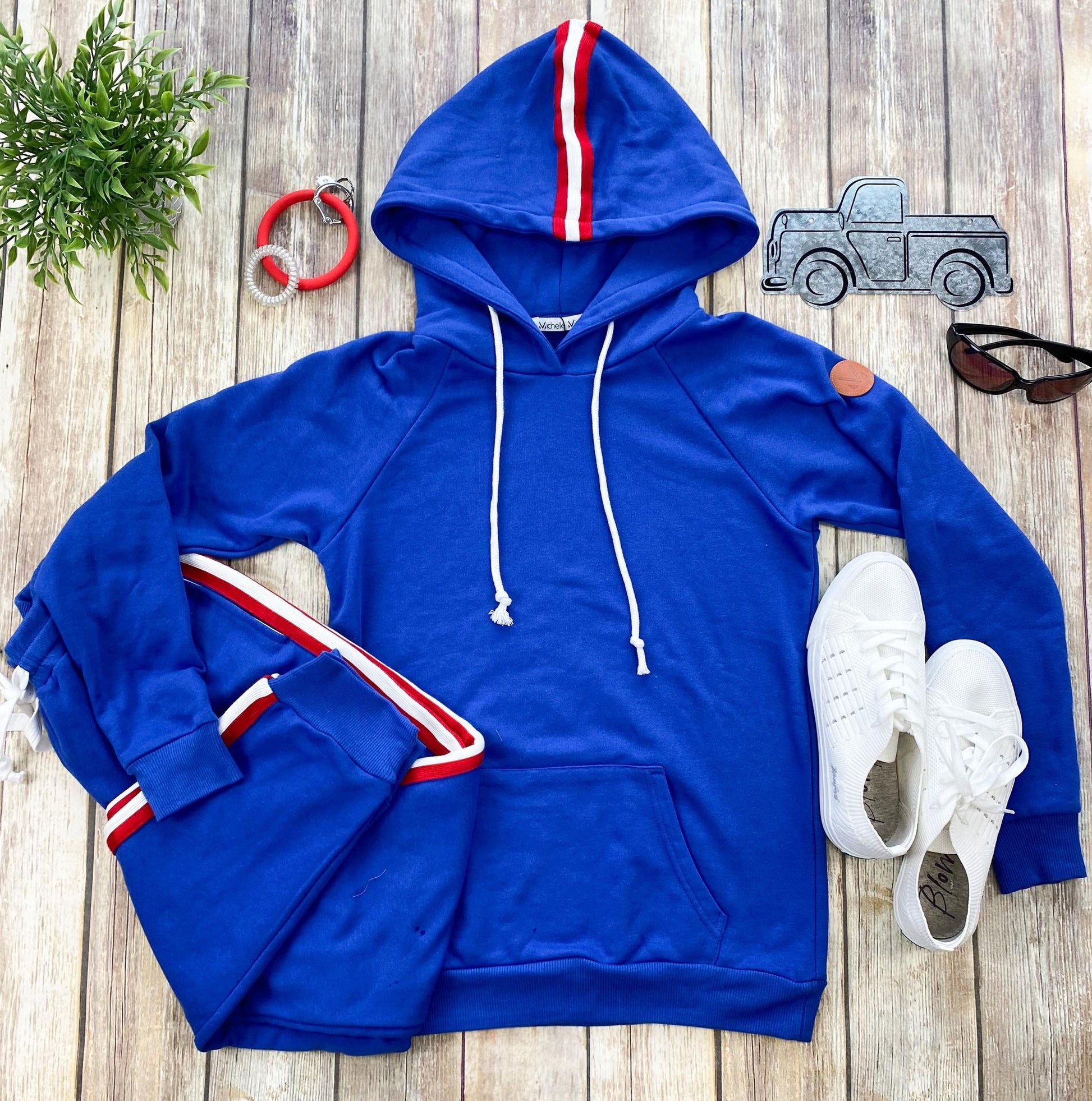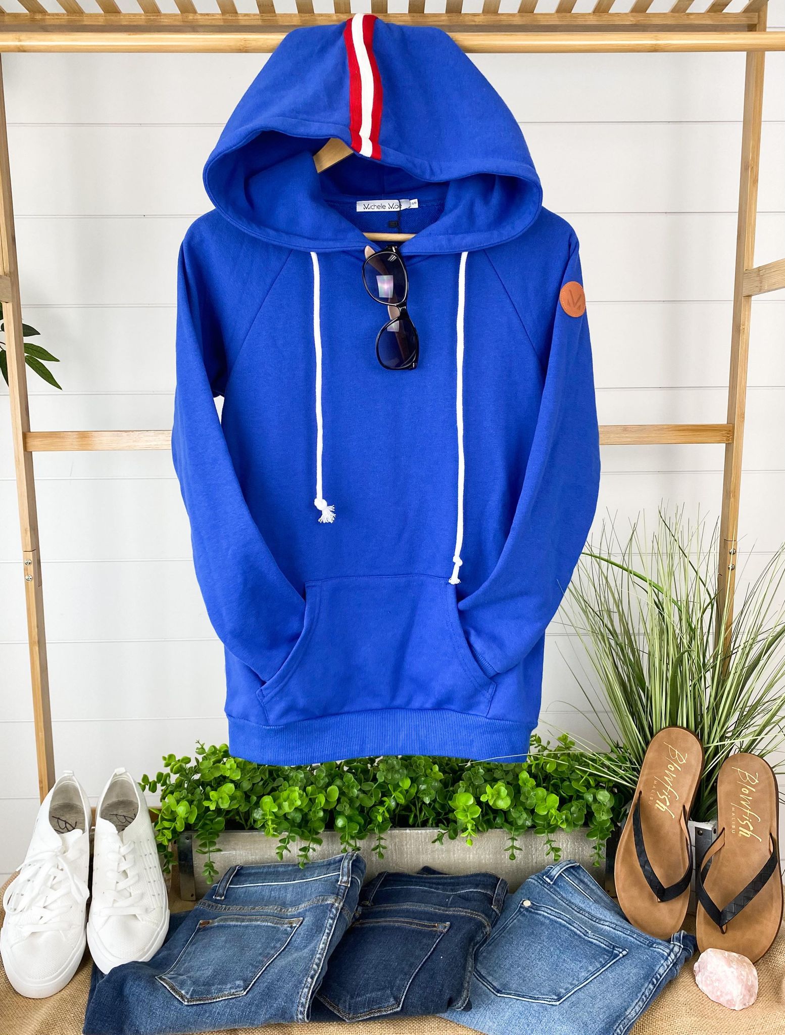 This hoodie fabric is super cozy! We love the classic blue with red and white stripe along the hood. Classic kangaroo front pocket and classic wrist cuffs for an overall classic but classy hoodie.