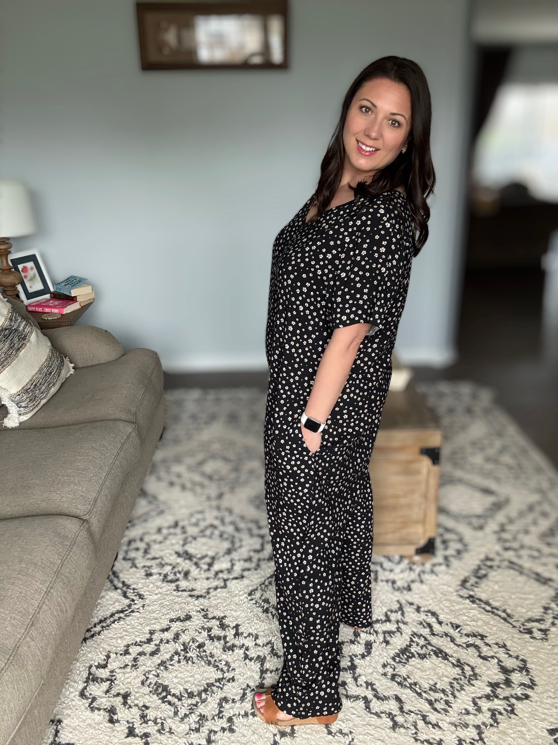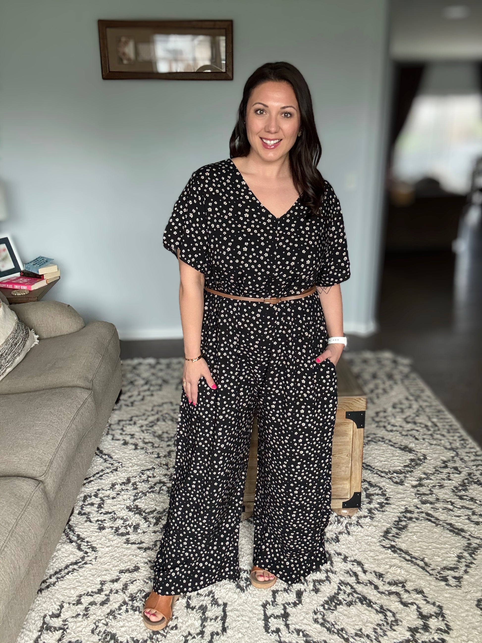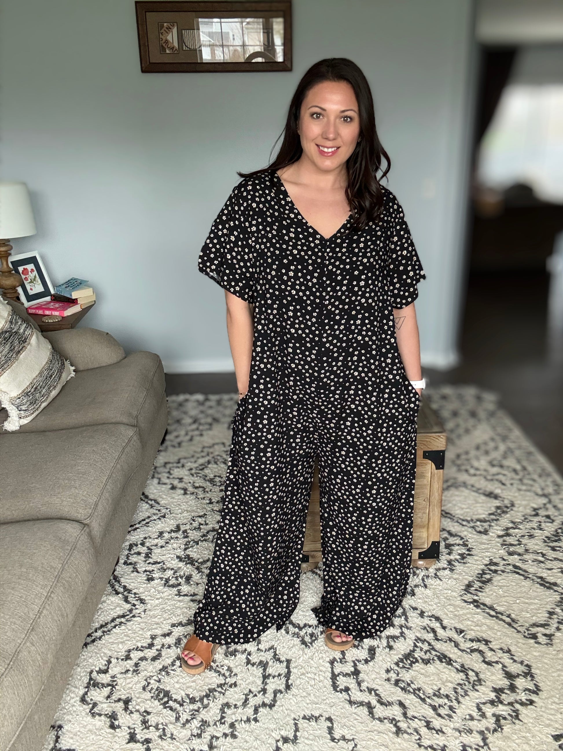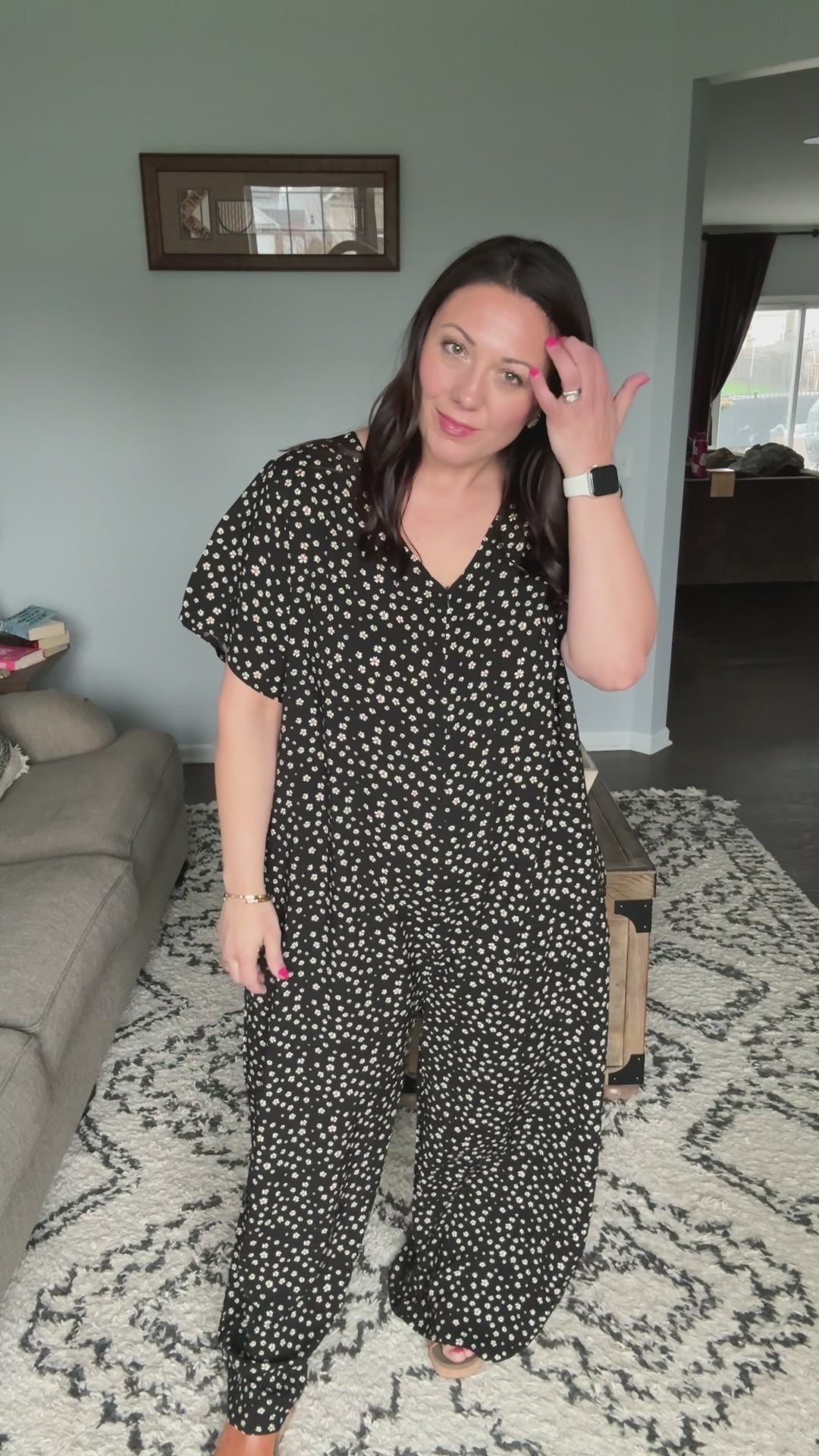 Make a statement in our Jasmine Jumpsuit Blossoms! This woven jumpsuit features a flattering V-neckline, a convenient front zipper closure, and a relaxed fit for maximum comfort. The wide leg adds a chic touch, while the functional side pockets provide practicality. Perfect for any occasion! (Zip into style!)