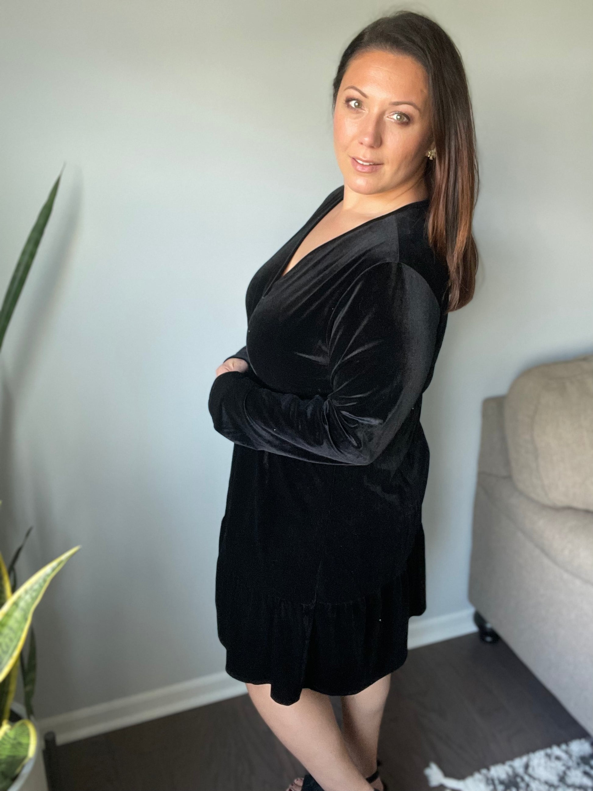 Enter the room in style in the Jentsyn Velvet V-Neck Dress In Black! Soft, luxe velvet shapes this gorgeous dress that features a flirty surplice neckline, framed by long sleeves. A fitted elasticated waist tops a flowy A-line skirt that falls to a ruffle hem.