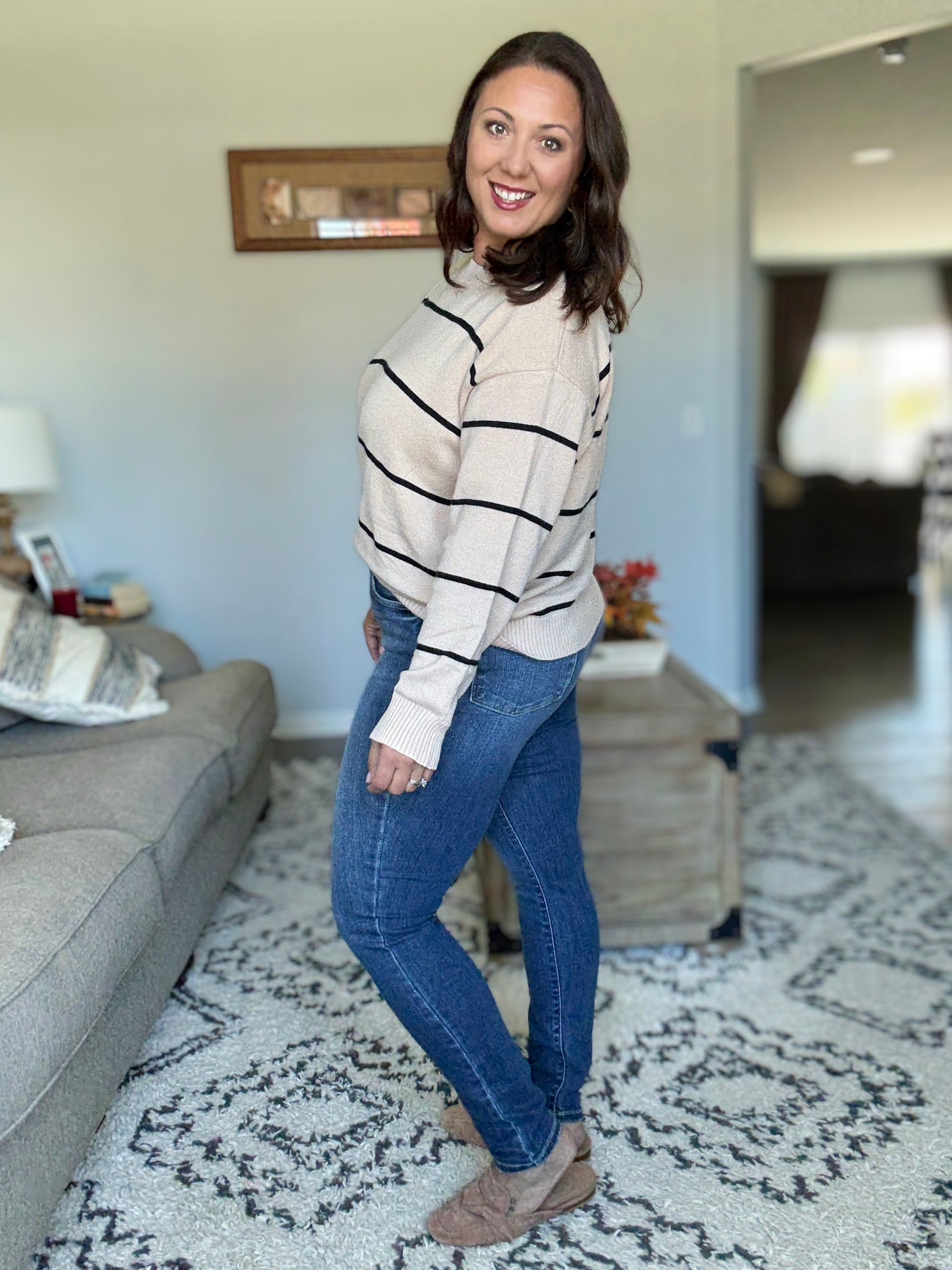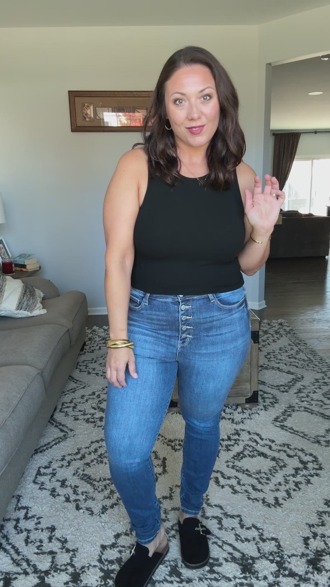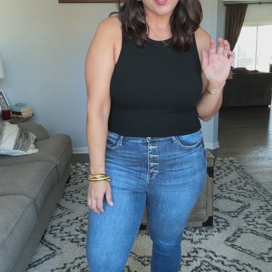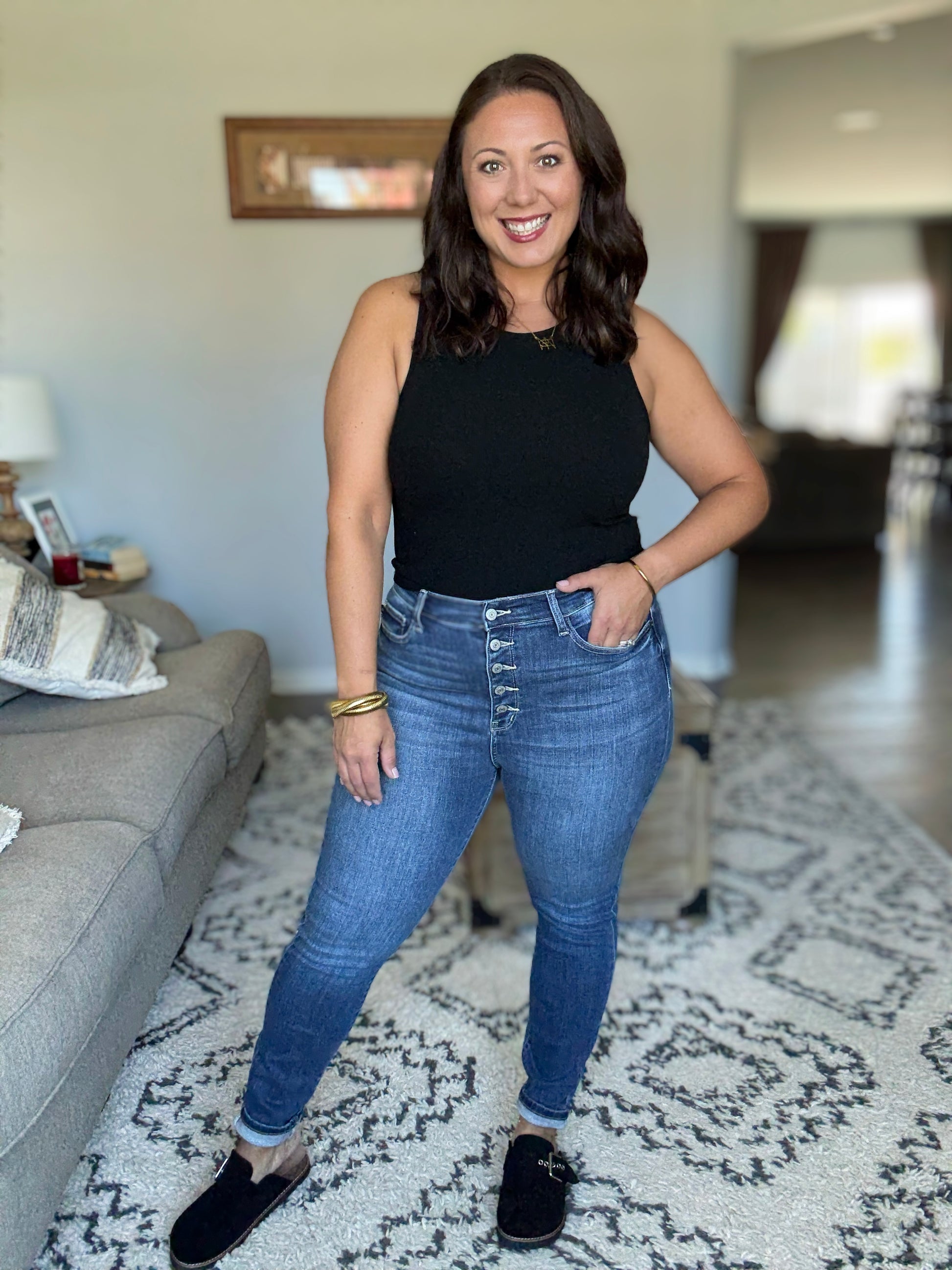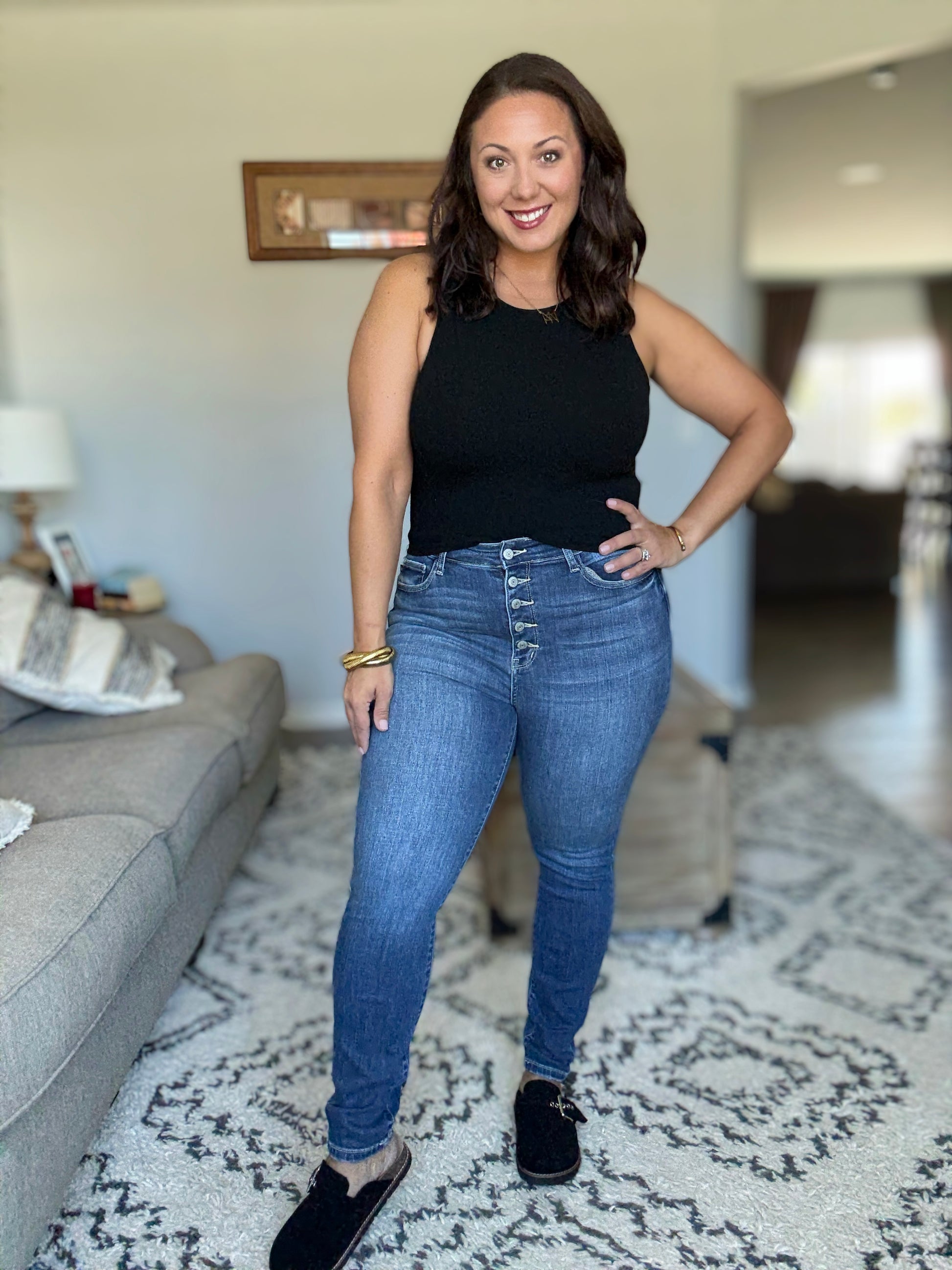 These High Rise Button Fly Skinny Jeans are the perfect jeans to pair with all of your fall booties. We love this wash for year-round wear along with the high rise and button fly details that are going to hold it all in. These jeans have no holes and only the slightly distressing on the front pocket area and can be worn from work to weekend to everywhere in between. Dress them up or down for multiple looks. Can easily cuff the bottom to make them ankle length or adjust for your footwear. These jeans are soft stretchy, and so comfortable! Add them to your cart before they are gone!