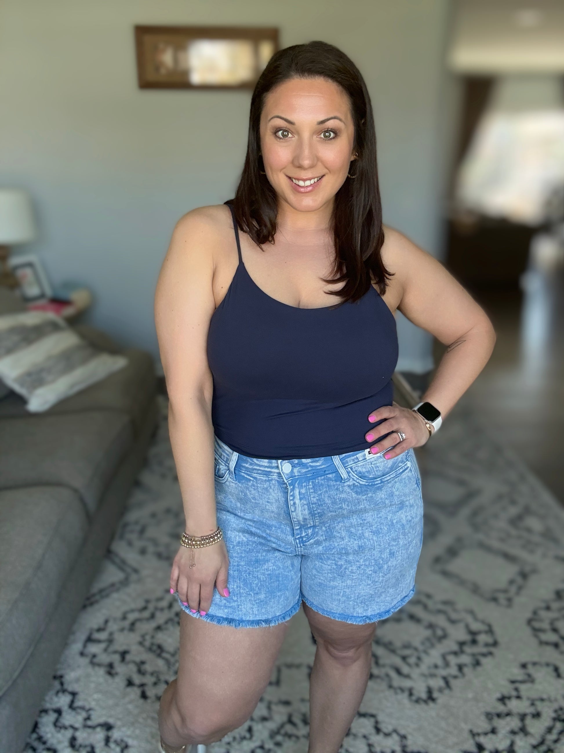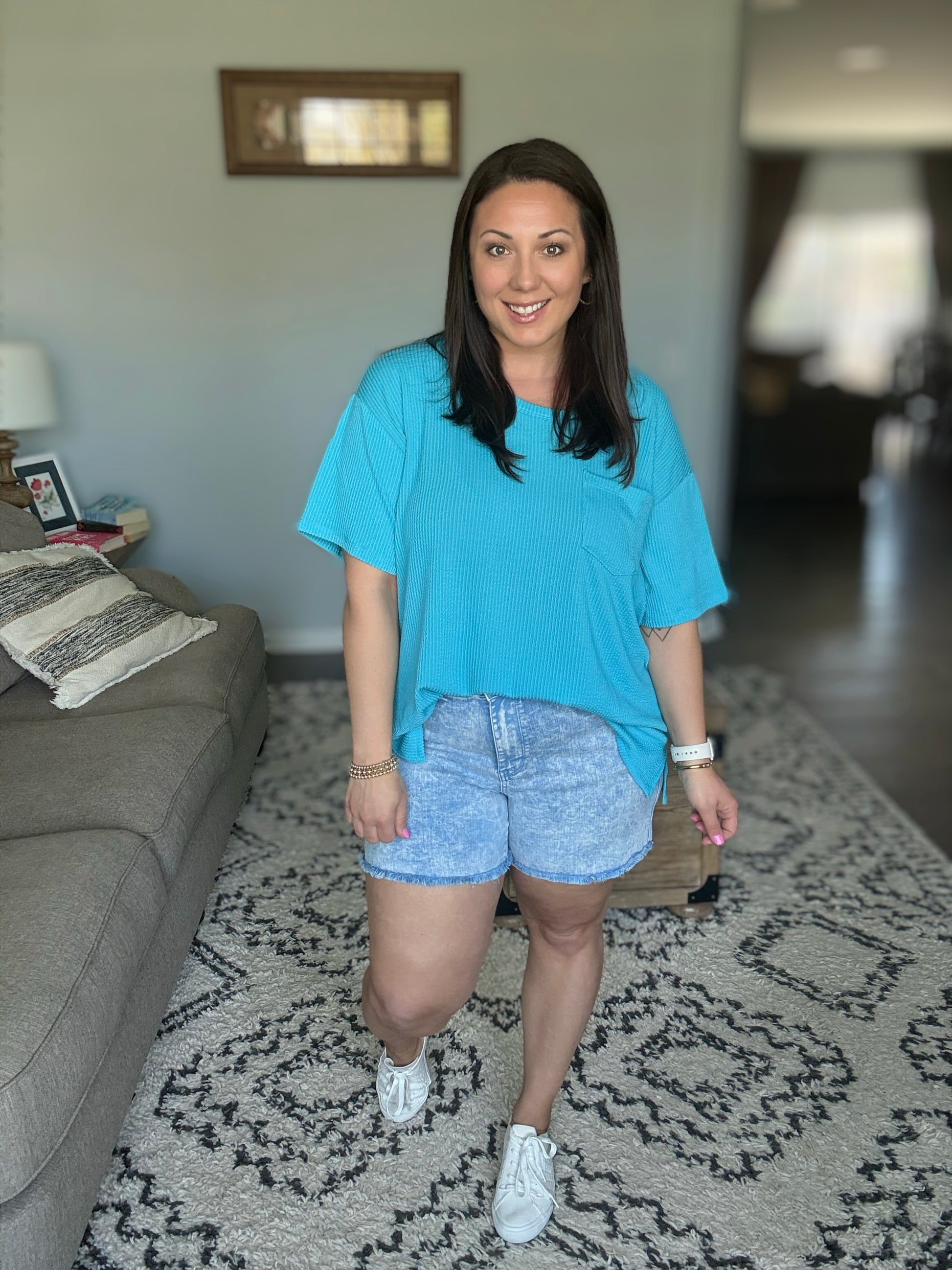 Add a pop of color to you summer wardrobe with these Cyan garment dyed Judy Blue shorts. The mid-rise waistline offers a comfortable and flattering fit that sits just below the natural waist. The garment dyeing process gives the denim shorts a unique color, with a vintage acid wash look. The material has amazing stretch like we have come to know and love with Judy Blue. They feature a raw fray hem with stay stitch so tehy won't fray any further up and maintain the inseam. Whether you're heading to the beach or a casual outing, these shorts are a great choice.