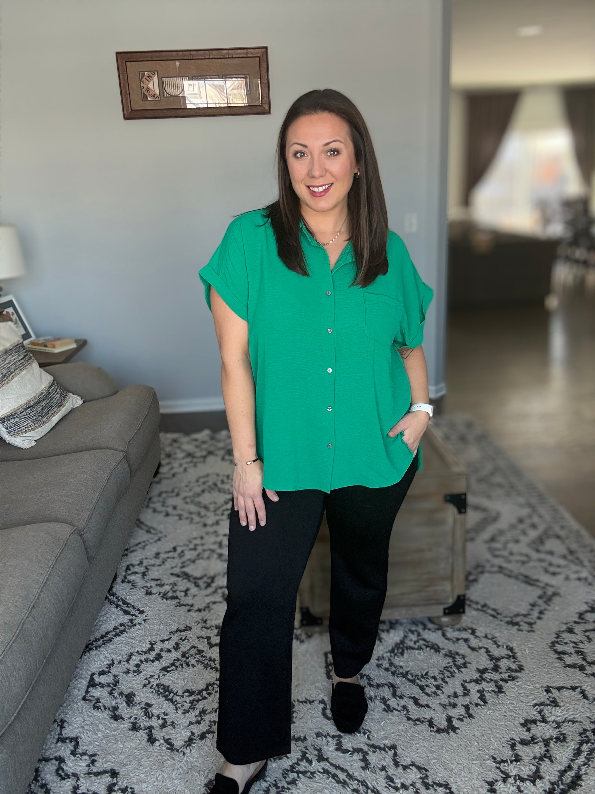 The Keep Up Collared Button Down is your new go-to for effortless style. This crinkle woven shirt features a crisp collared neckline and full front button-down closure for easy layering. Practical front pockets keep your essentials within reach, while side slits and a stepped hem add movement and visual interest. Perfect for casual days when you want to look put-together without trying too hard.