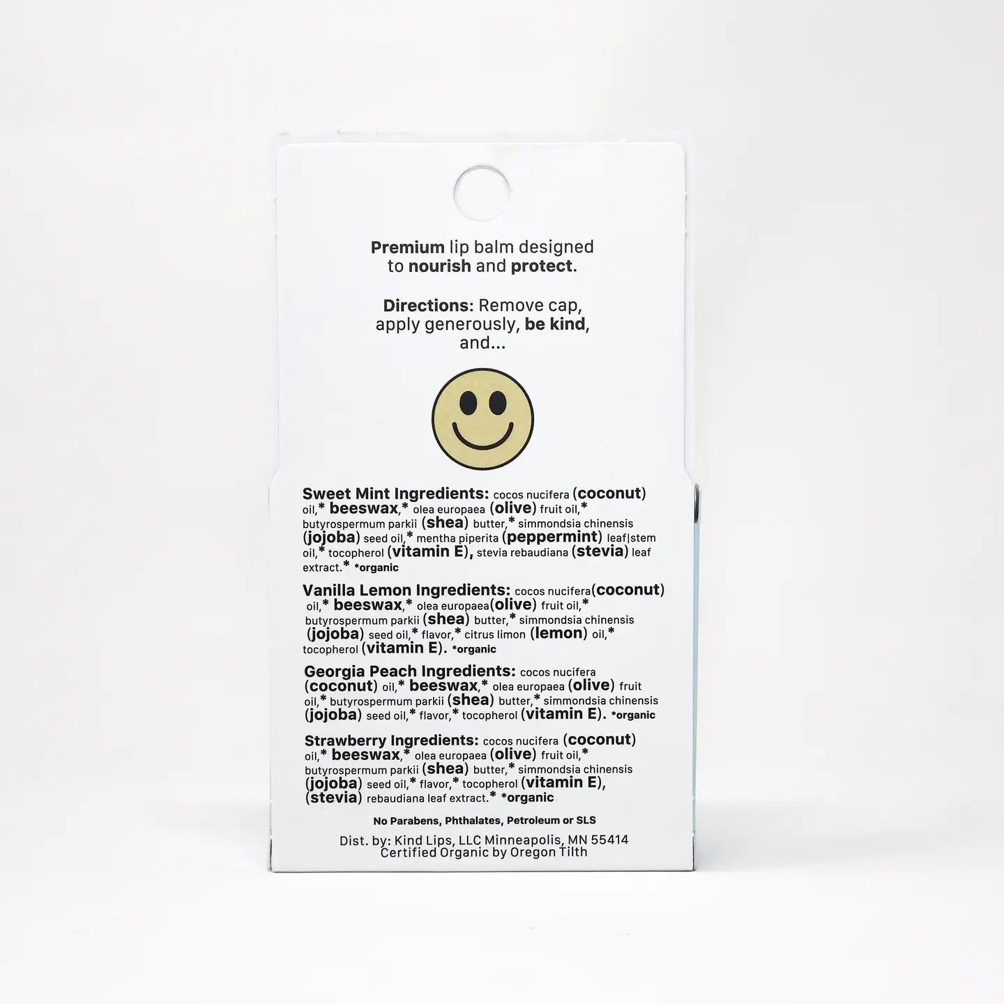 Get your customers in the holiday spirit with the Kind Lips Variety 4-Pack Organic Lip Balm, the perfect stocking stuffer! This delightful collection features four unique flavors, allowing everyone to find their favorite while keeping their lips hydrated and nourished. Crafted from 100% natural ingredients, this organic lip balm is designed for those who care about quality and sustainability.