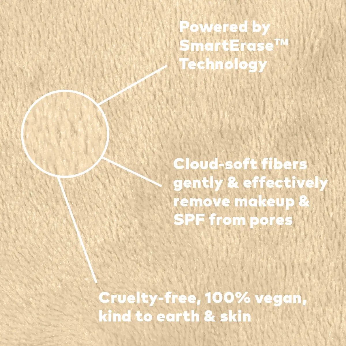 Erase all makeup with JUST WATER™ including waterproof. Our patented, water-activated makeup remover uses cloud-soft fibers to gently & easily remove all cosmetics & sunscreen from pores. 2 in 1 benefit: one side removes makeup & one side exfoliates.