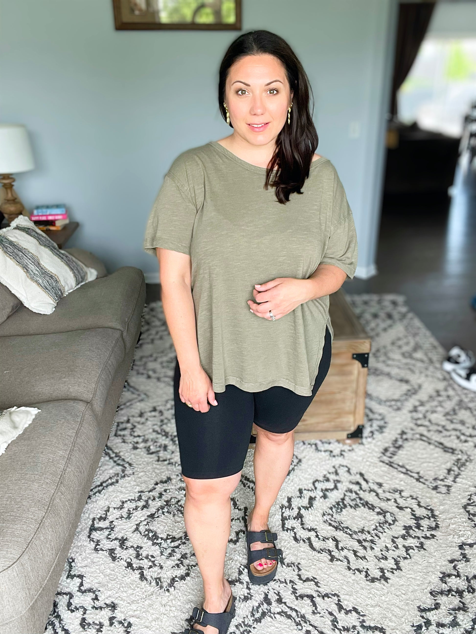 Try the Let Me Live Relaxed Tee in Army for a lightweight and relaxed fit. Featuring a boat neckline, drop shoulder, and stepped hem with side slit, this tee is perfect for lounging or casual outings. The exposed seams and faux back tag add a unique touch.