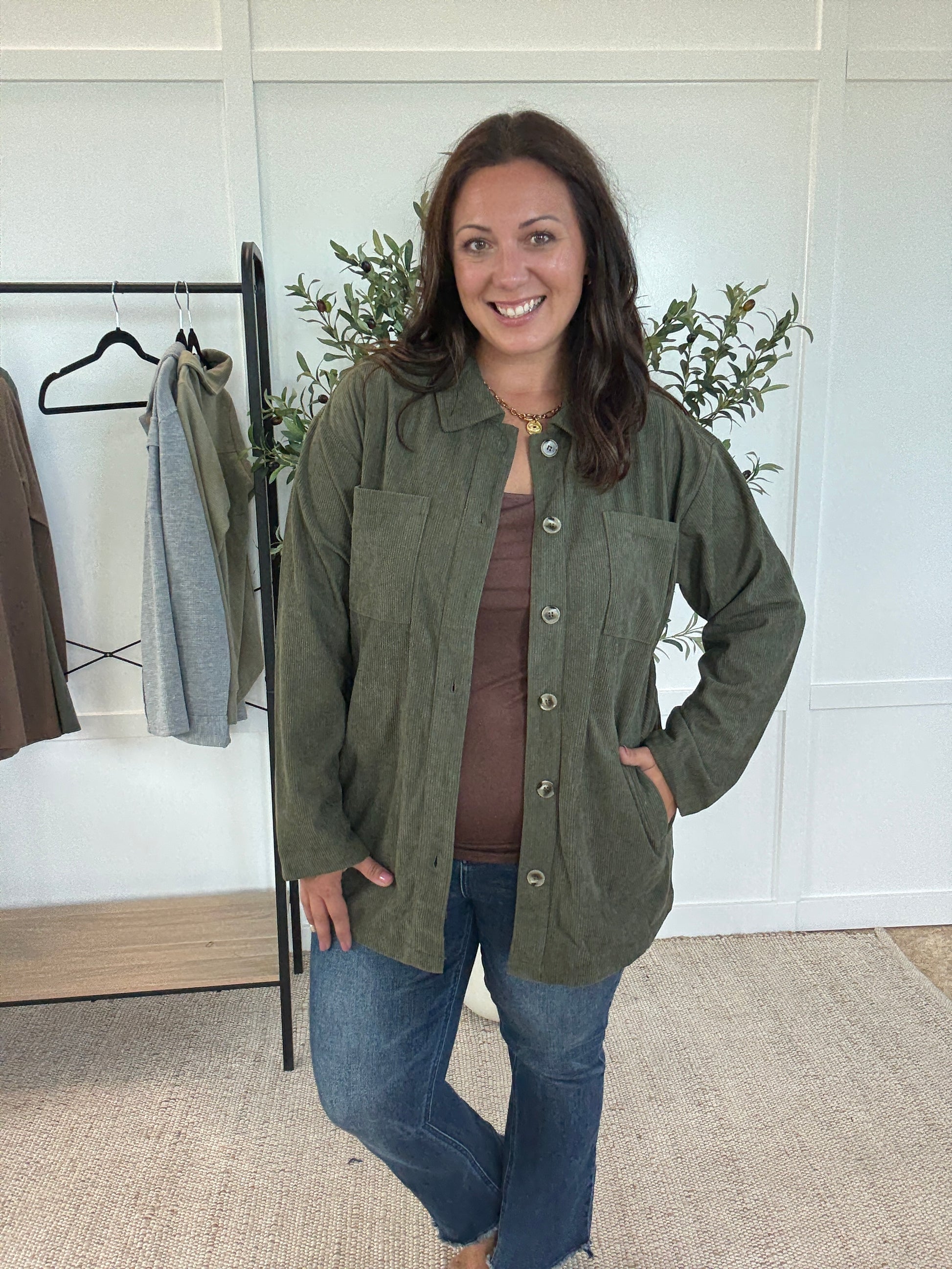 Stay cozy all fall long with our Lightweight Corduroy Button Down in Olive. Features include breast and hidden pockets, making it both functional and fashionable. The perfect addition to your fall wardrobe, pair it with your favorite booties for a complete look.