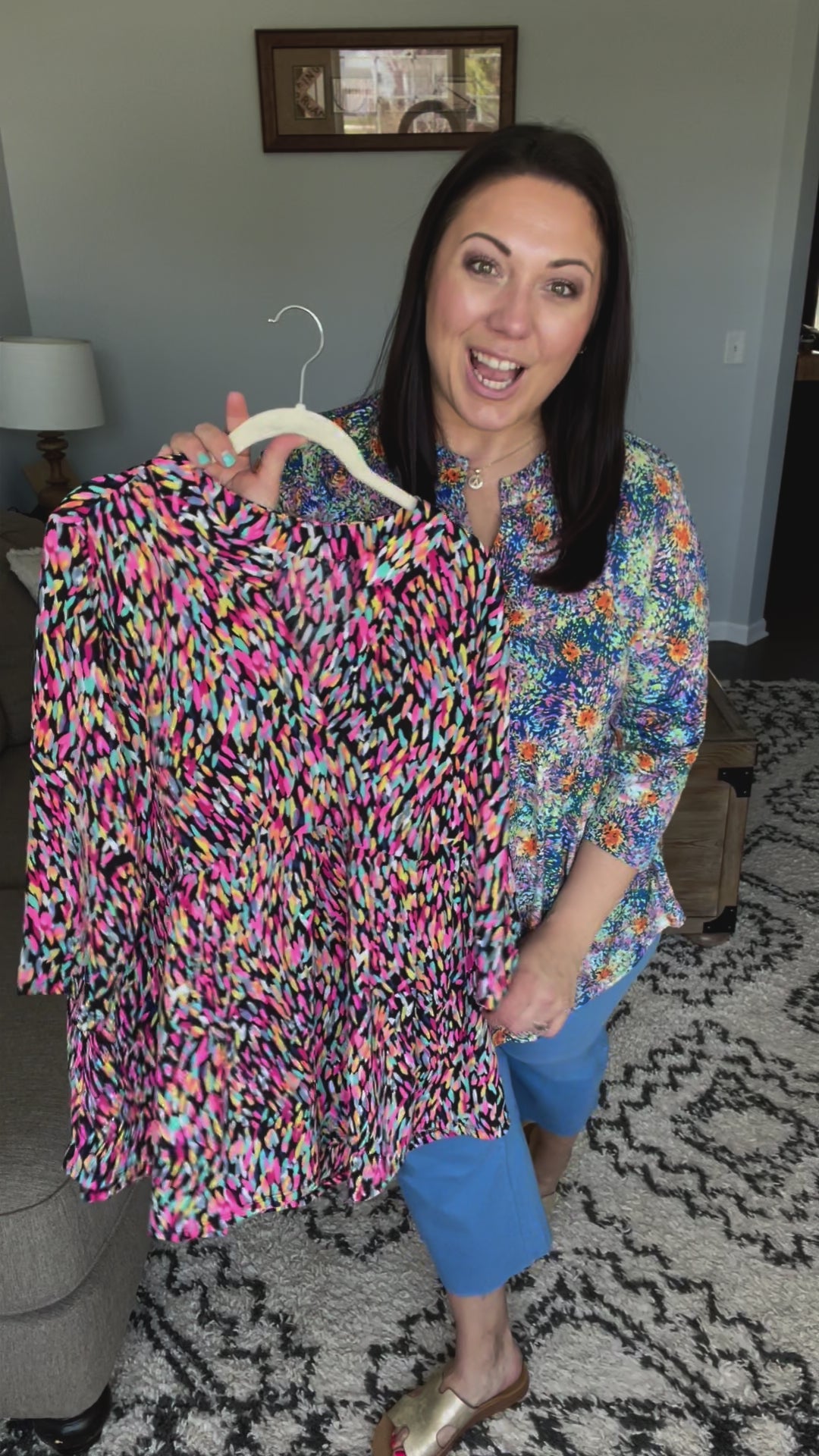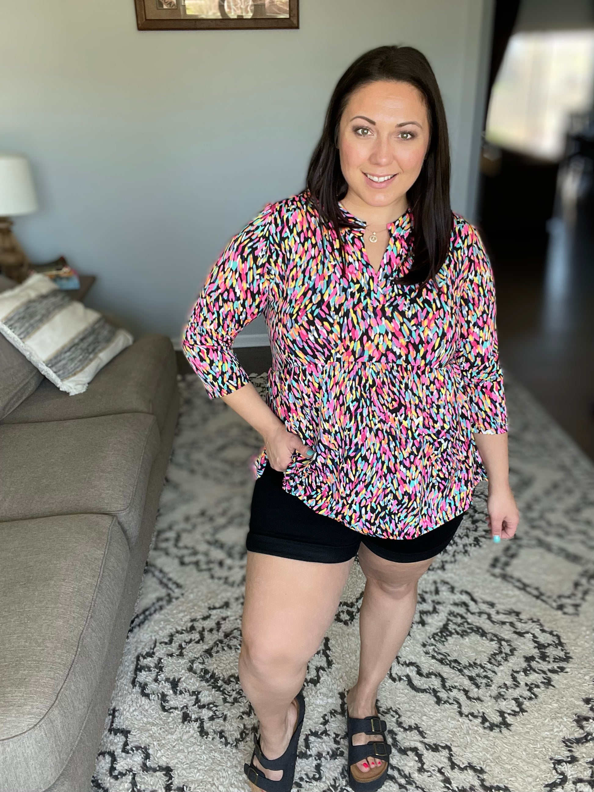 Introducing the Lizzy Babydoll Top - the perfect combination of style and convenience! Made with wrinkle-free bulgari fabric, this babydoll style top is perfect for any occasion. The v-neckline and gathered babydoll silhouette create a flattering look, while the 3/4 length sleeve adds a touch of elegance. And with its fun pattern, you're sure to stand out in a crowd.