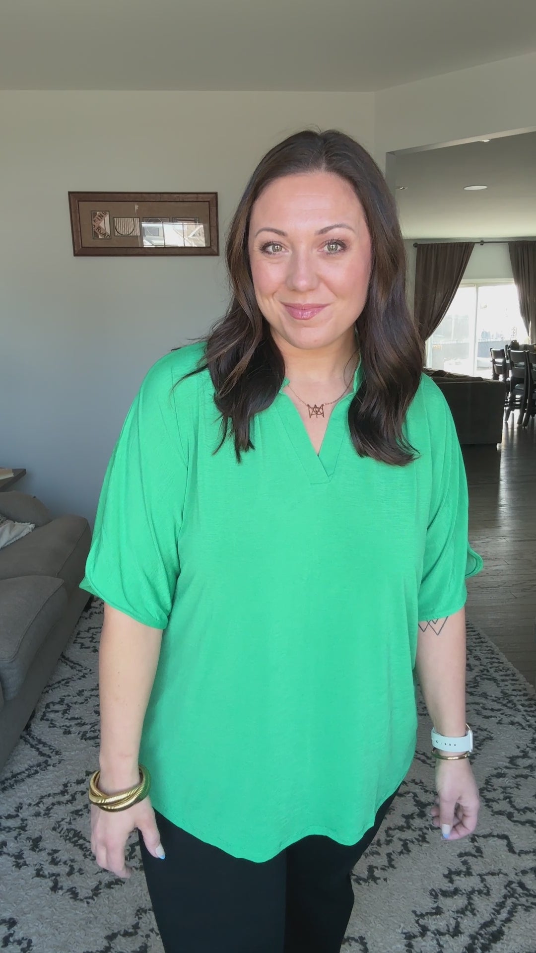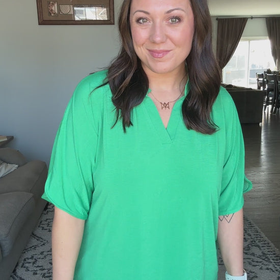 Meet the Lizzy Breeze Top—a breezy escape wrapped in green comfort. This loose-fit wonder features a chic banded split neck and flowy dolman sleeves with playful splits that let your style breathe. High-stretch fabric moves with you effortlessly, while gathered details and a center back seam create flattering dimension. Whether you're heading to brunch or a casual hangout, this top brings relaxed elegance with just the right amount of flair.