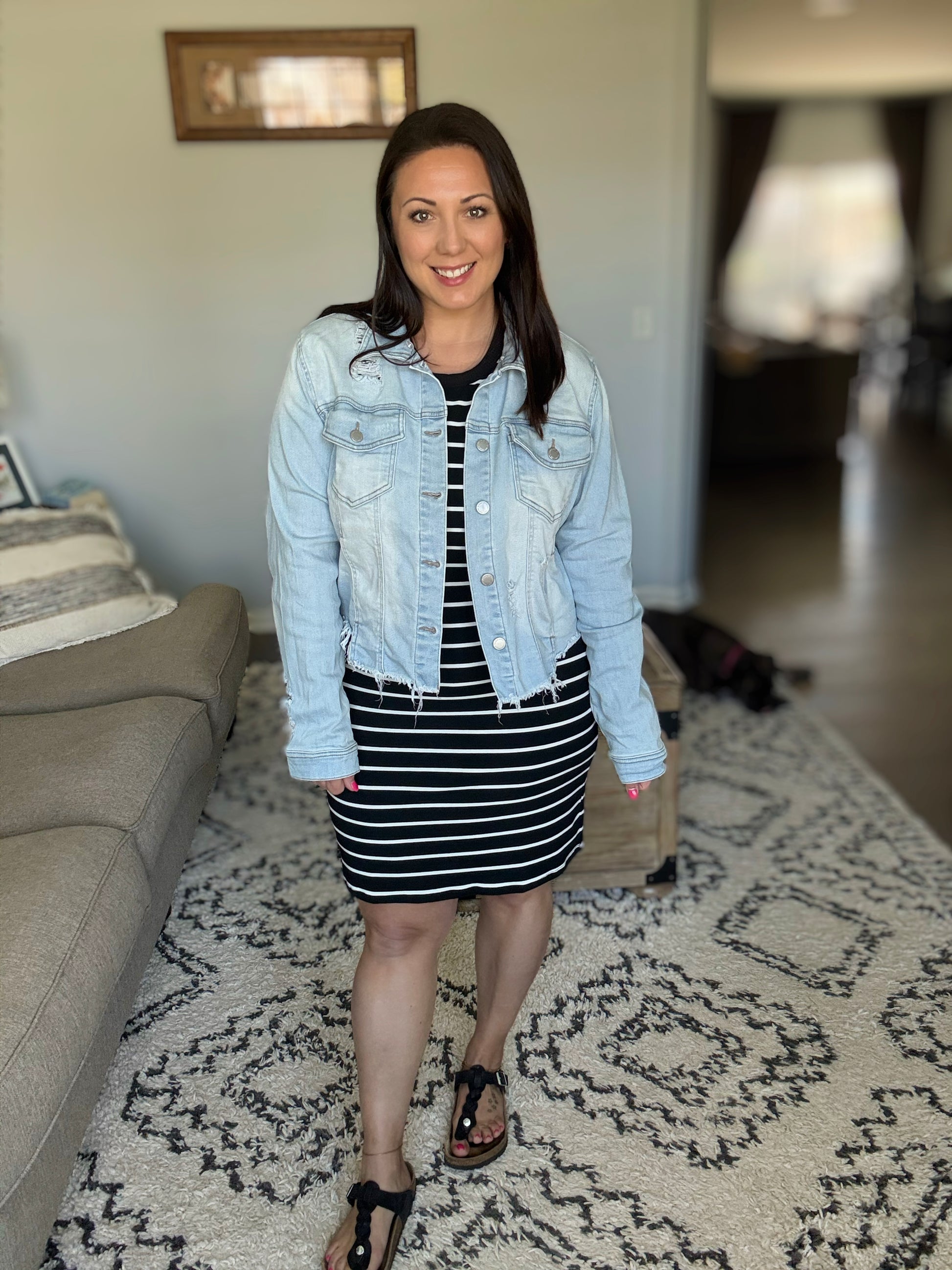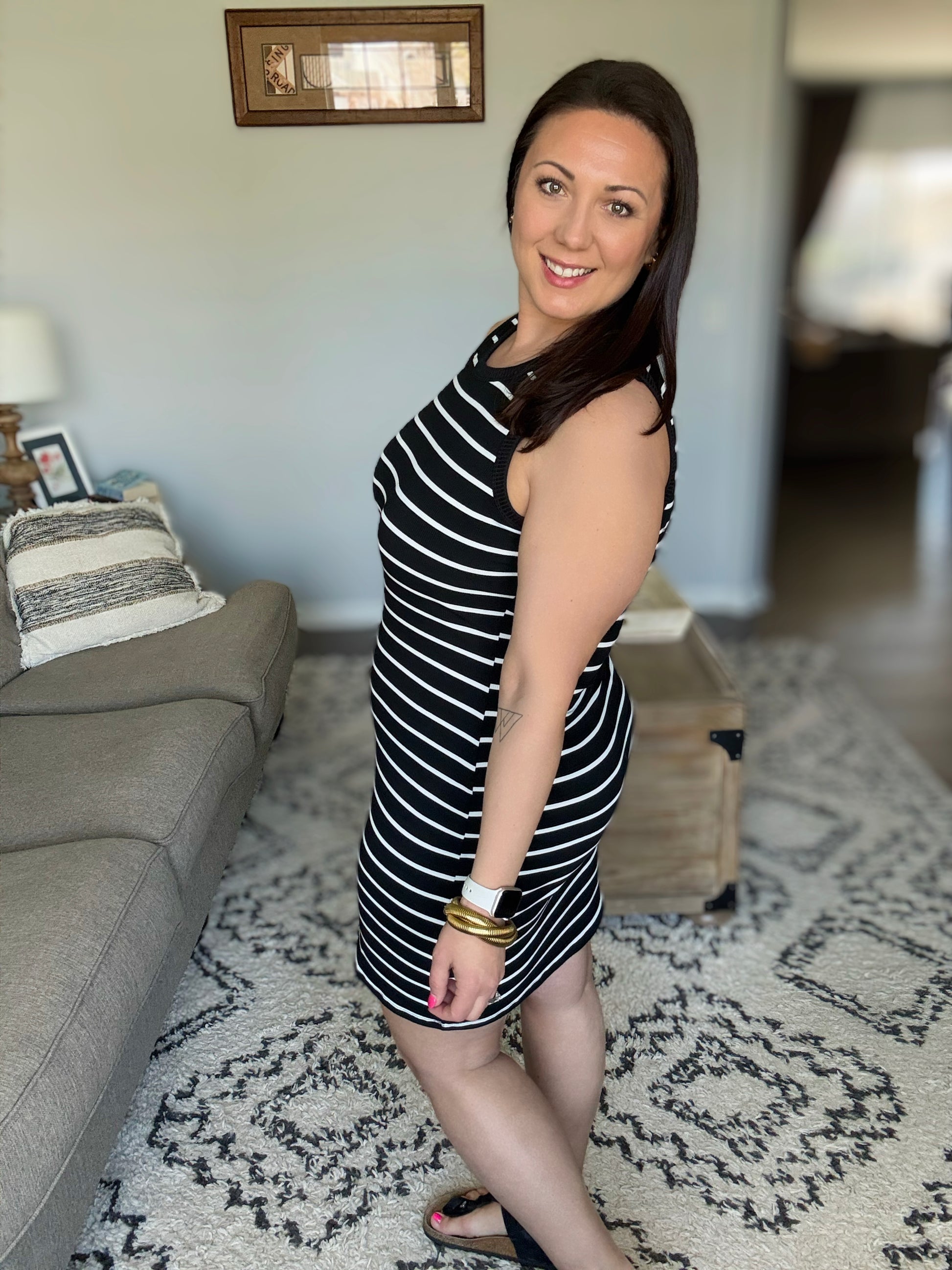 Get ready to have some fun in our Mariah Ribbed Dress! This dress features a form-fitting ribbed design with stylish black stripes, perfect to wear to girls trip at the winery, concerts, and date night . Complete the look with sandals or boots and you're ready to go!