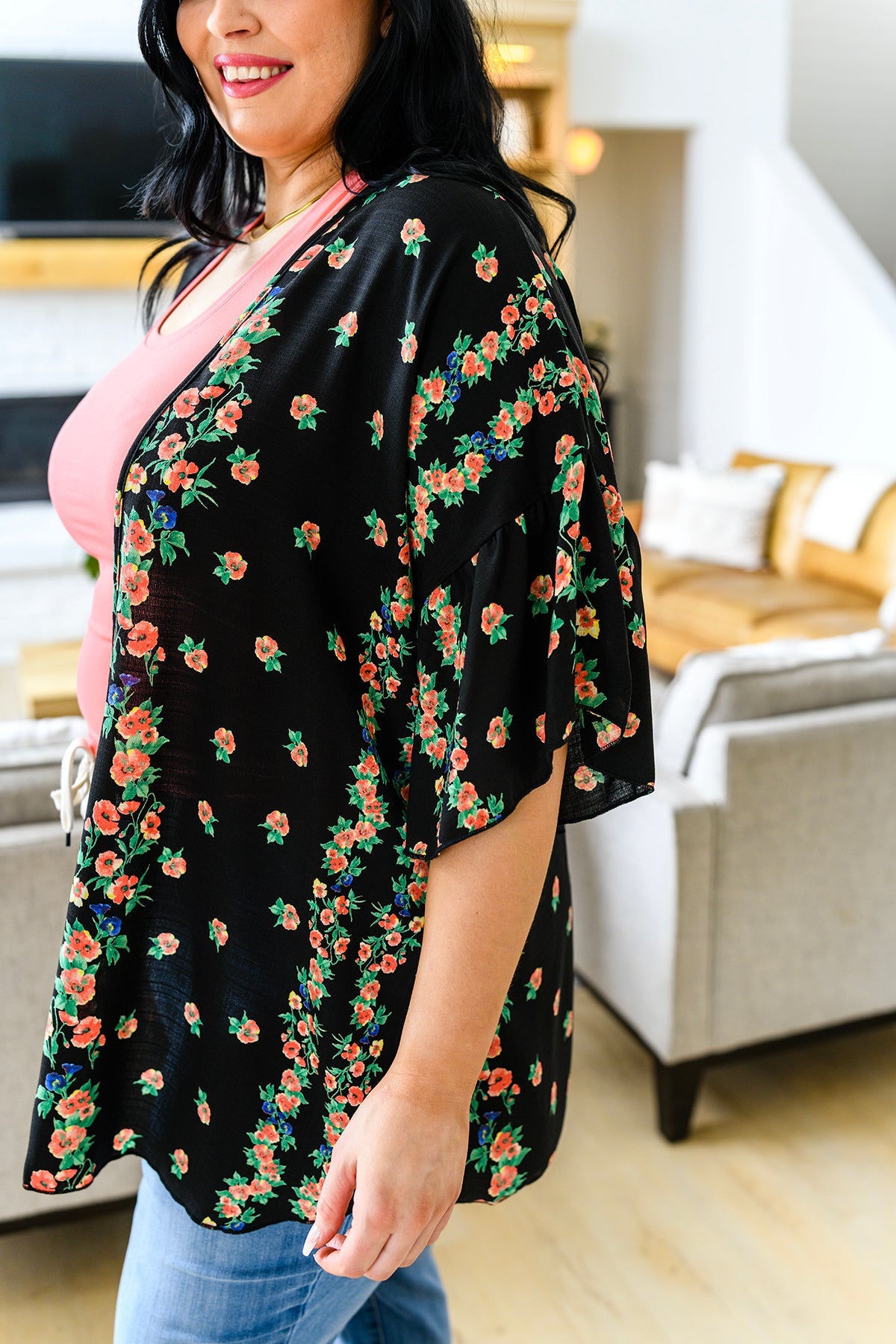 Stay up to date with this season's current trends with the Moment In Time Kimono! What's not to love about this piece!? Featuring a pink and blue floral print on sheer black fabric, an open front, dramatic gathered sleeves, and a flowy silhouette. Pair with denim and a tank or throw it over a dress, either way you're going to look stunning!