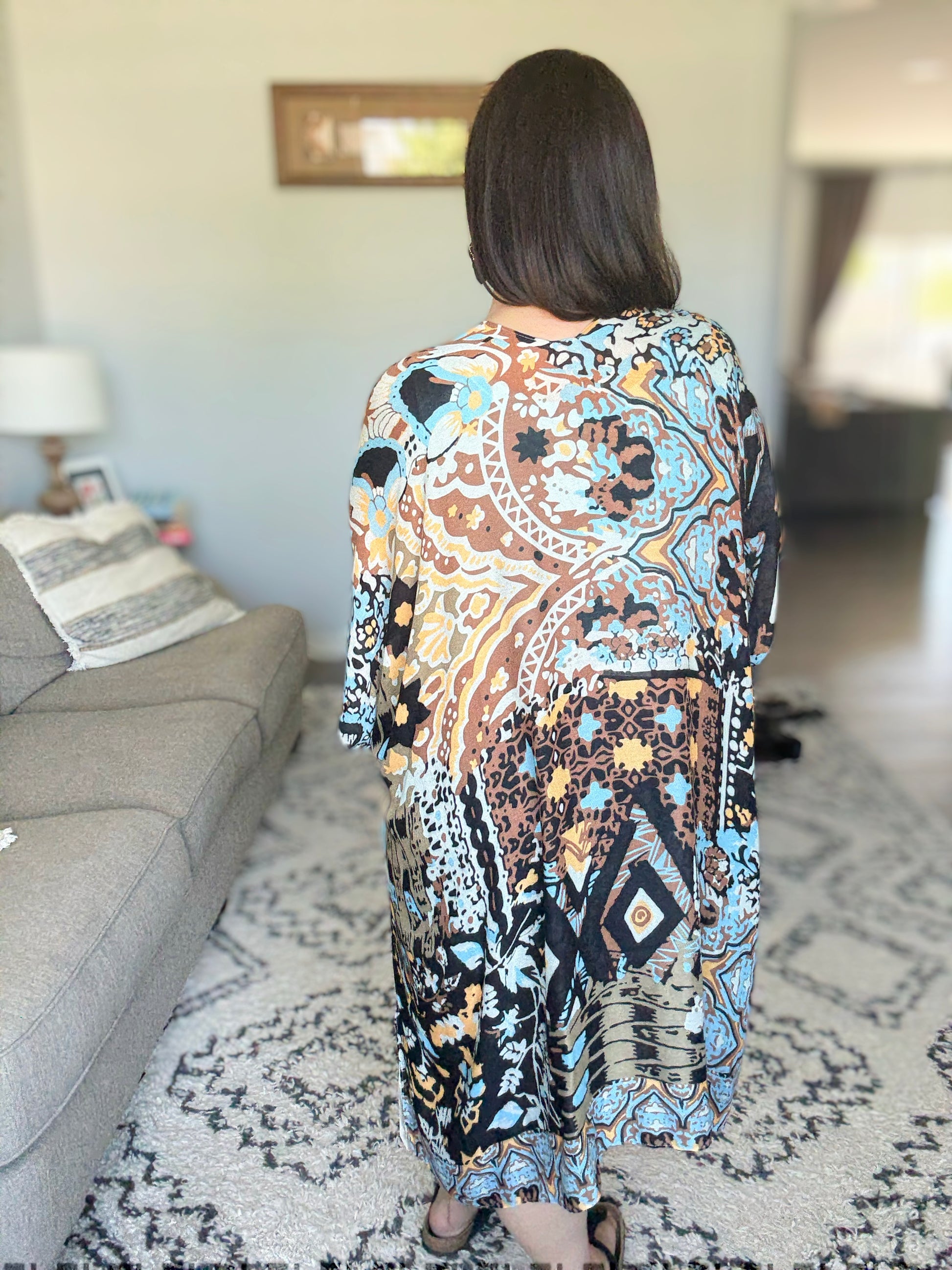 Breezy and effortless, this kimono is the perfect lightweight layer for sun-drenched days and summer evenings. Adorned with a captivating blend of ethnic and distinctive prints in elegantly subdued tones. Made from a slightly sheer modal woven viscose fabric, it features an easy open front, relaxed angel sleeves, and side slits for a fluid, airy feel. Whether you're layering it over a swimsuit or styling it with denim, this kimono brings a laid-back vibe to any look.