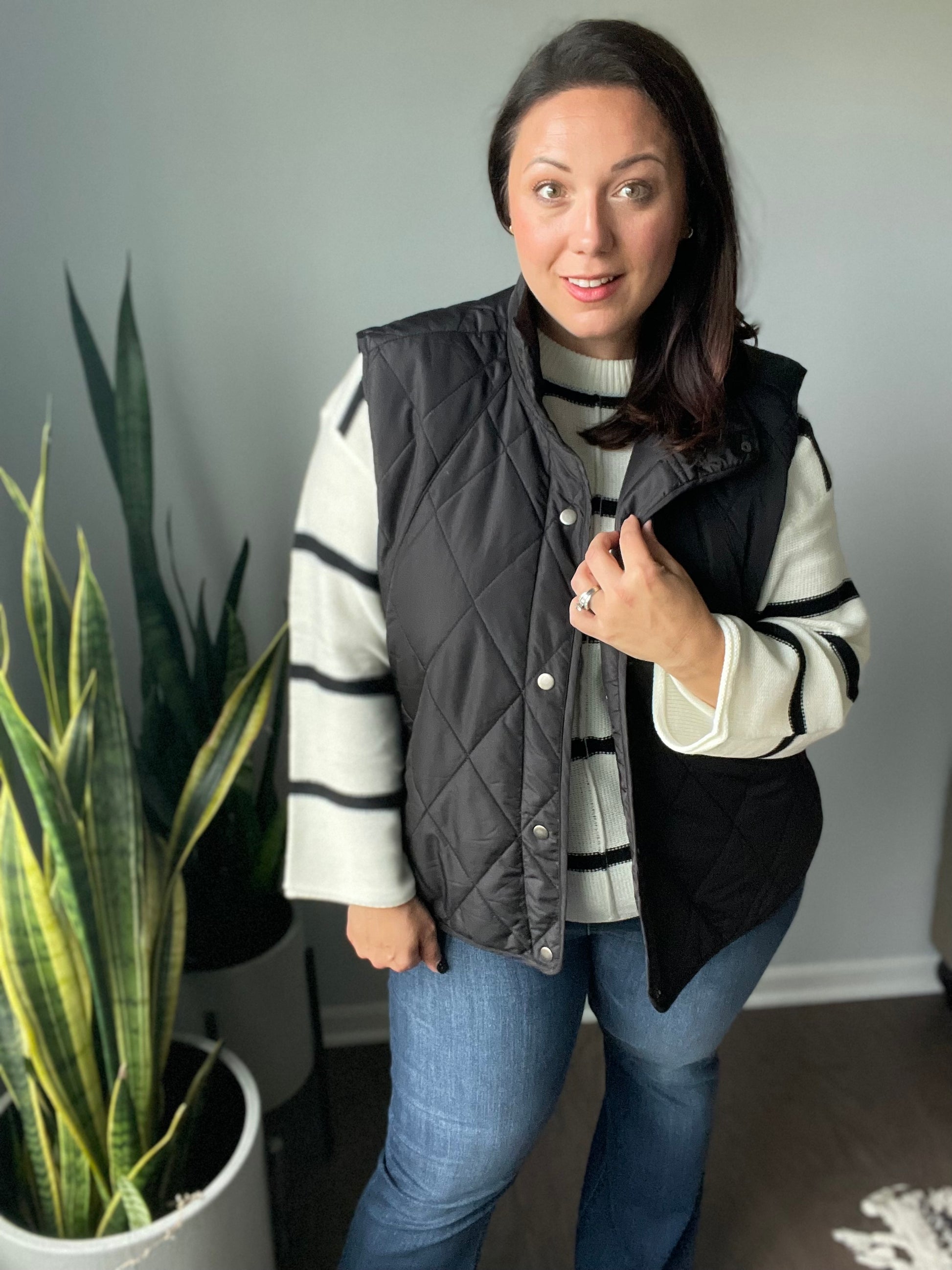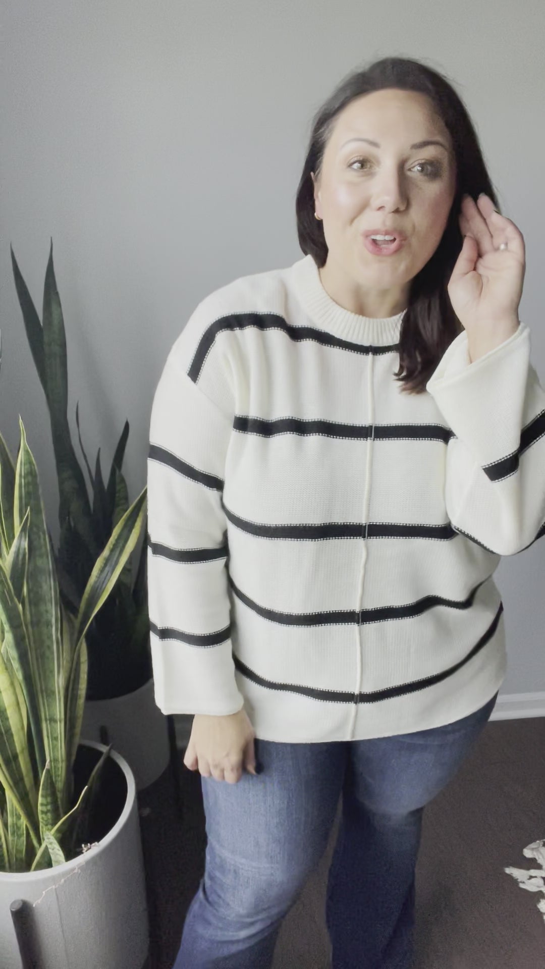 More or less the perfect transitional layer is the Always a Classic Striped Sweater. This lightweight sweater knit is designed with contemporary stripes, giving a modern sensibility to this timeless wardrobe staple. Featuring a round neckline, dropped shoulder, long sleeves and classic black stripe with a center front seam detail, this stylish piece is sure to enhance any casual or semi-formal look.
