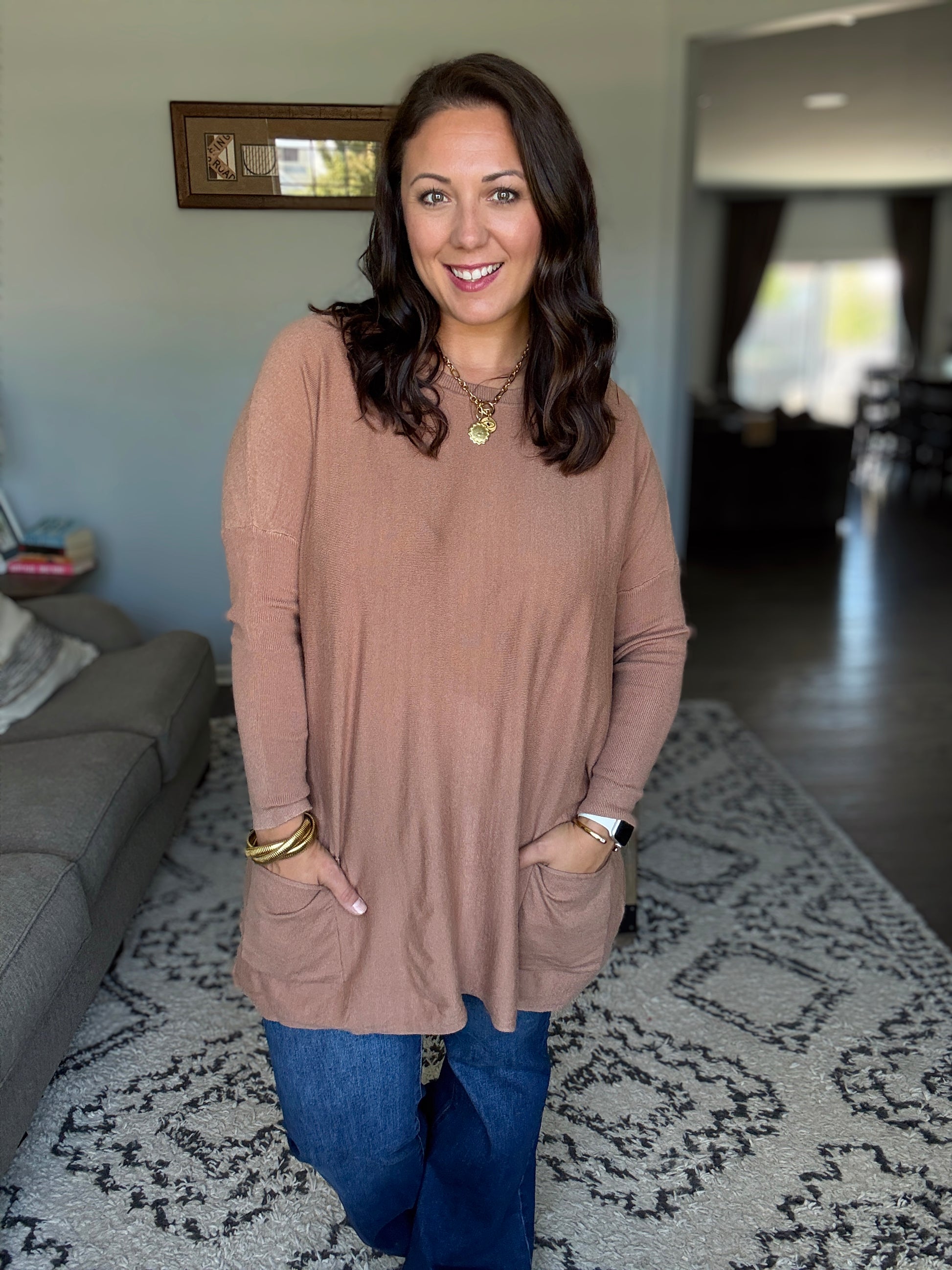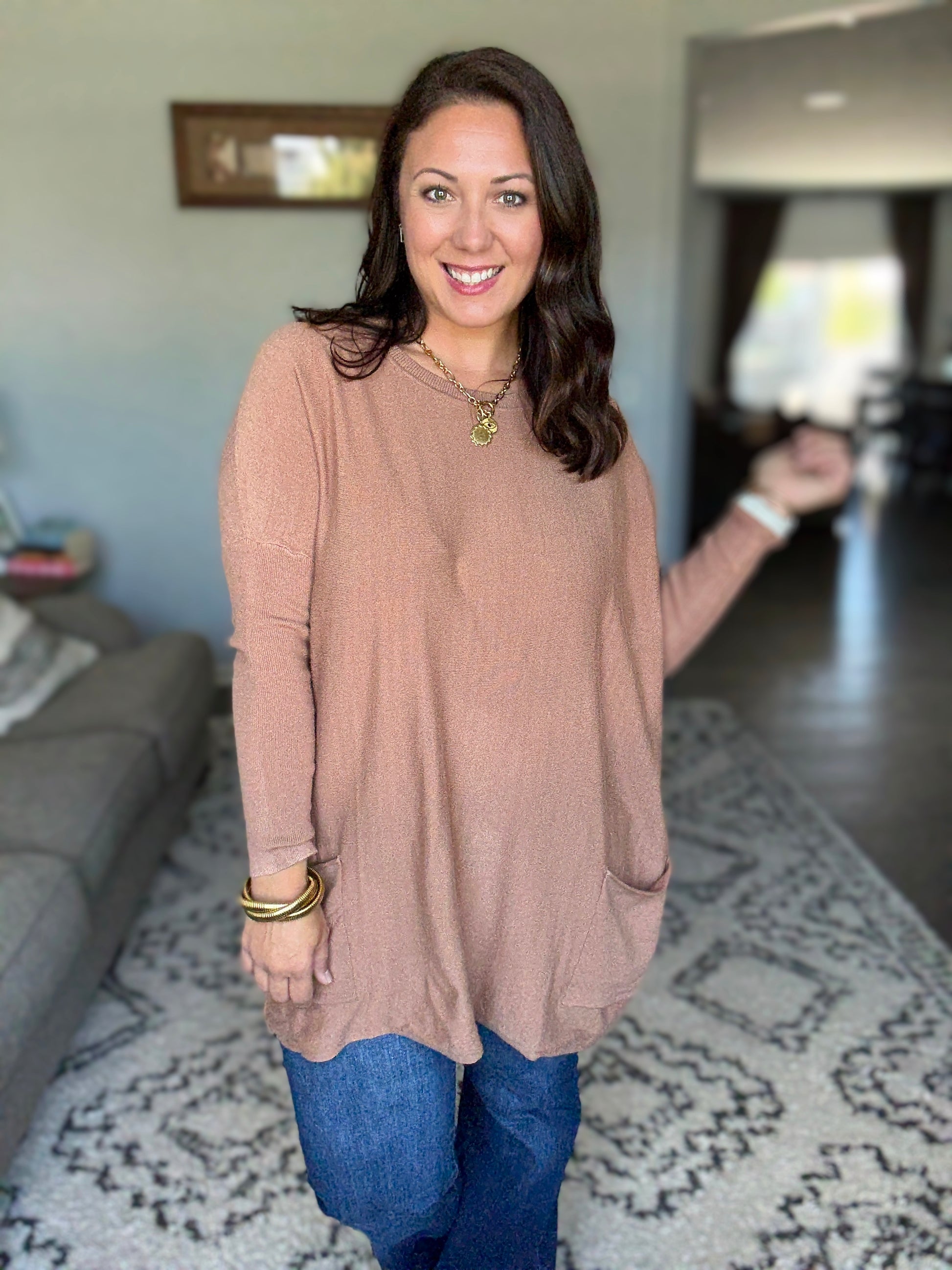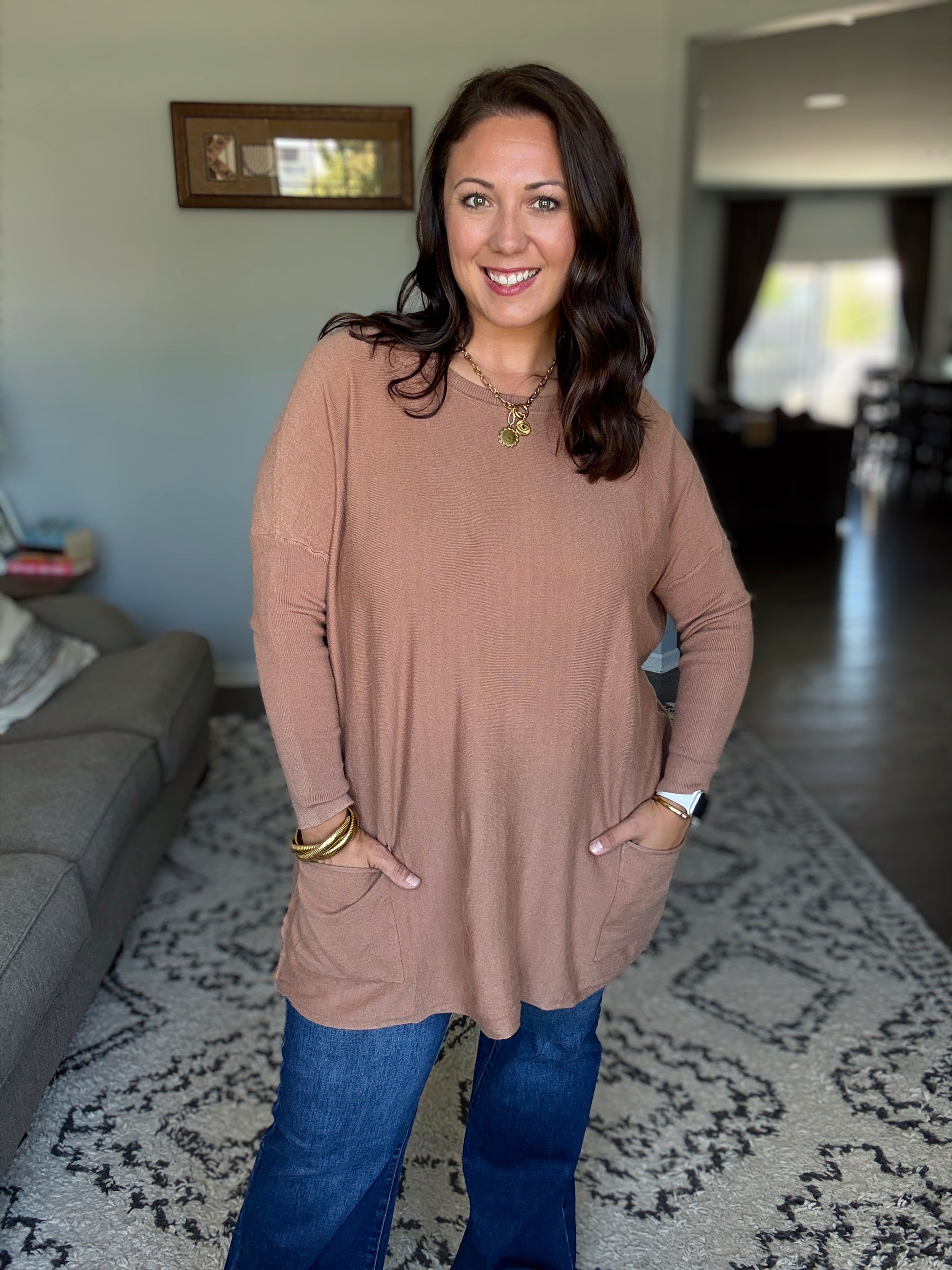 Take on the fall with confidence in our Naomi Pocket Sweater. This bold sweater tunic features a scoop neck and fitted sleeves for a flattering fit, while the flowy body and pockets add a touch of adventure.