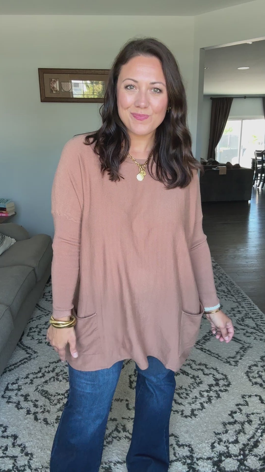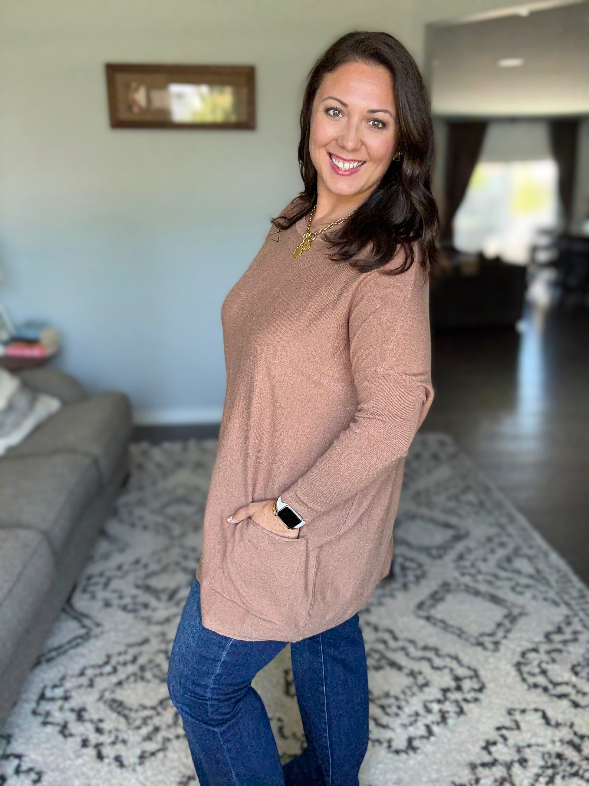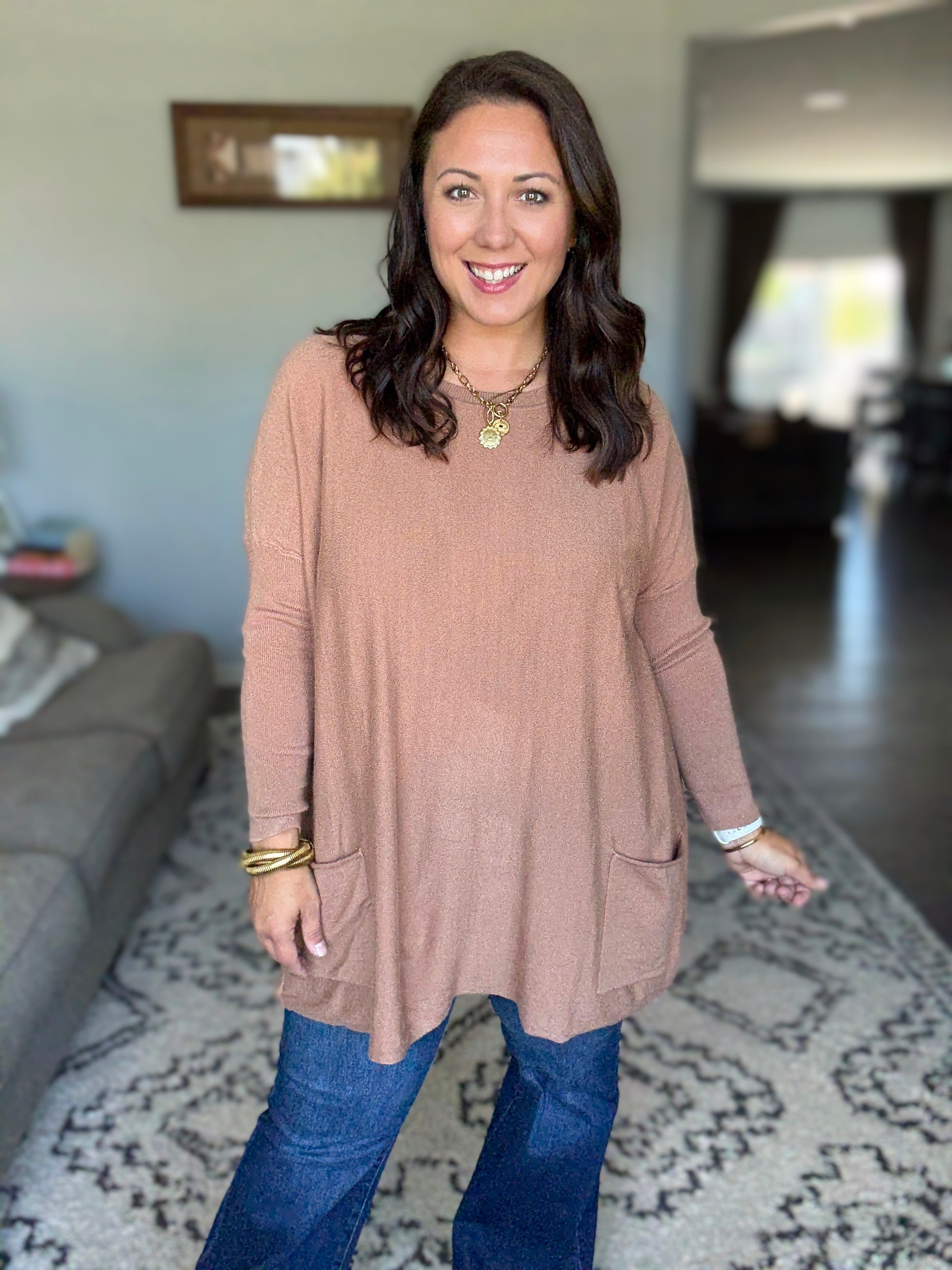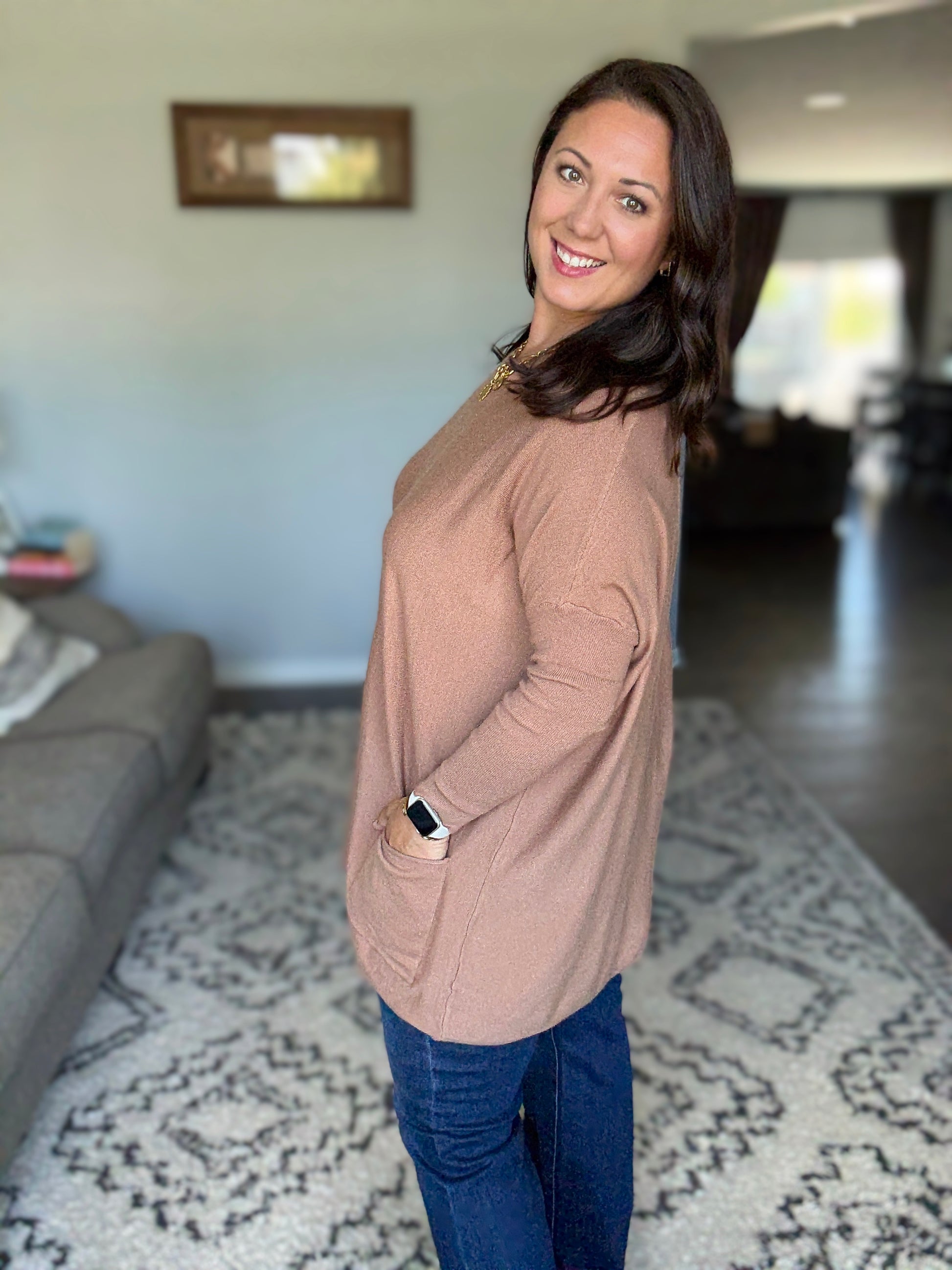 Take on the fall with confidence in our Naomi Pocket Sweater. This bold sweater tunic features a scoop neck and fitted sleeves for a flattering fit, while the flowy body and pockets add a touch of adventure.