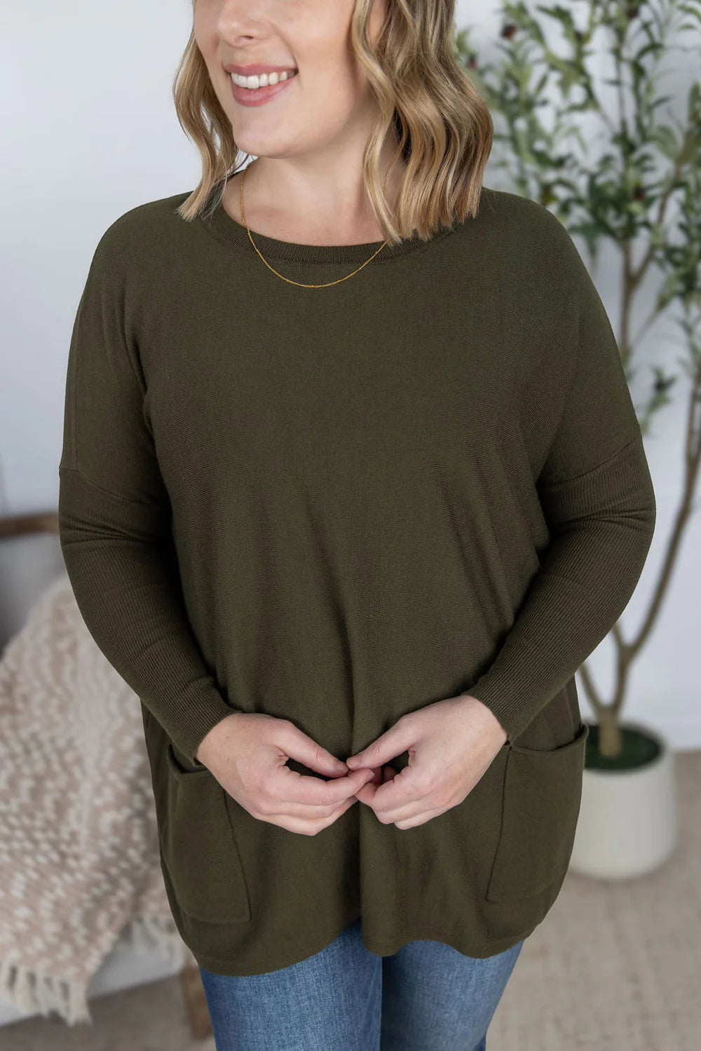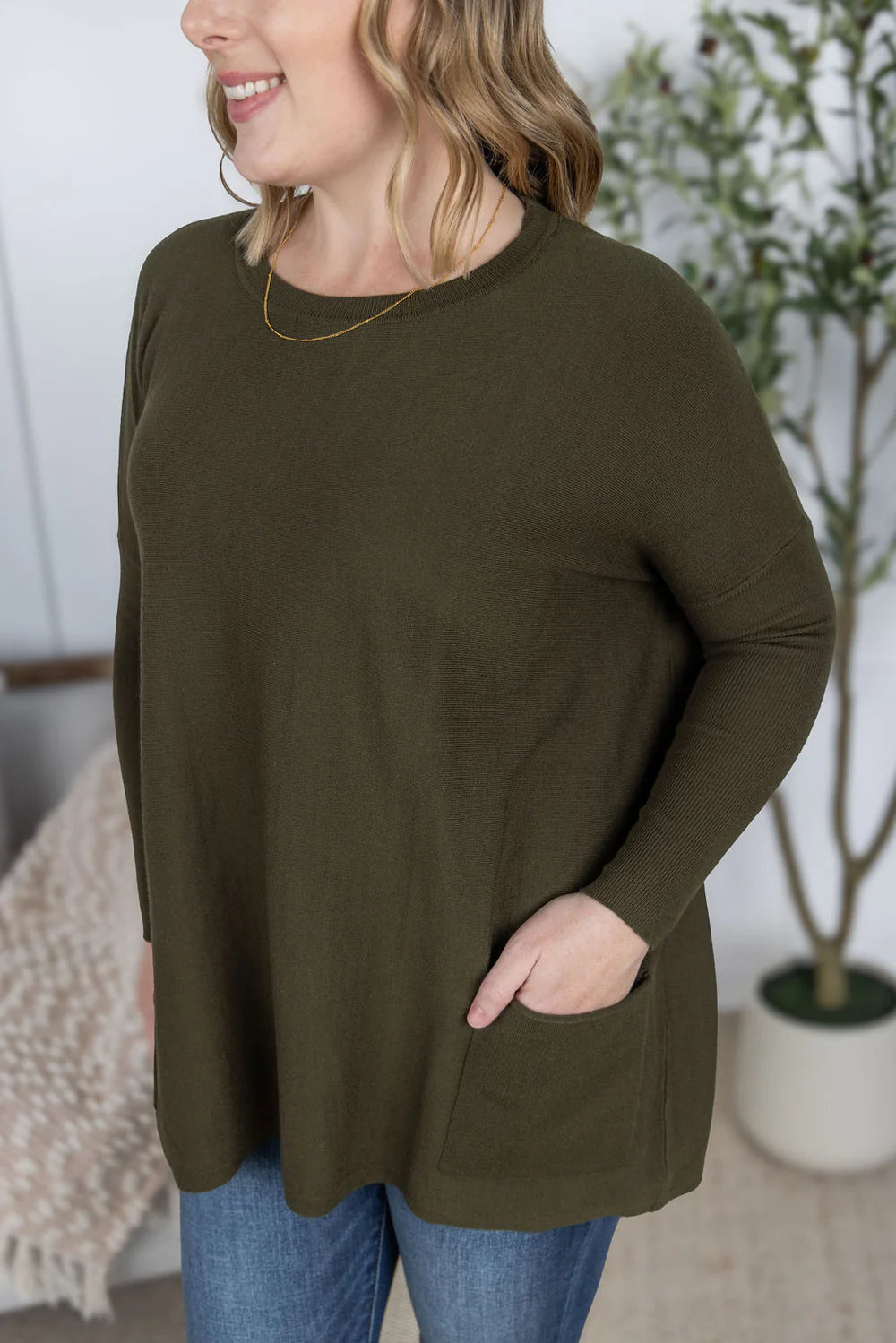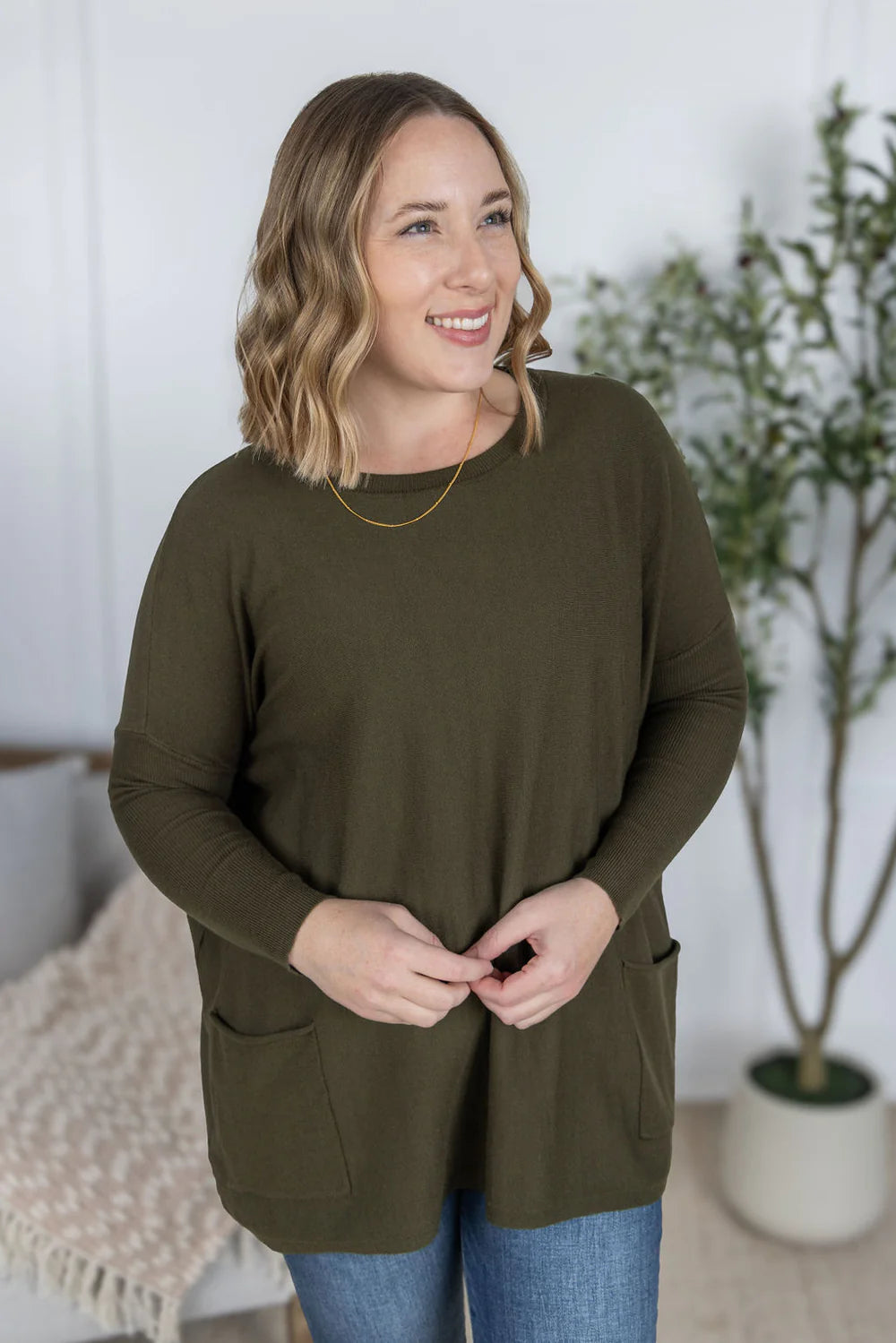 Take on the fall with confidence in our Naomi Pocket Sweater. This bold sweater tunic features a scoop neck and fitted sleeves for a flattering fit, while the flowy body and pockets add a touch of adventure. Stay cozy and stylish all season long in Olive.