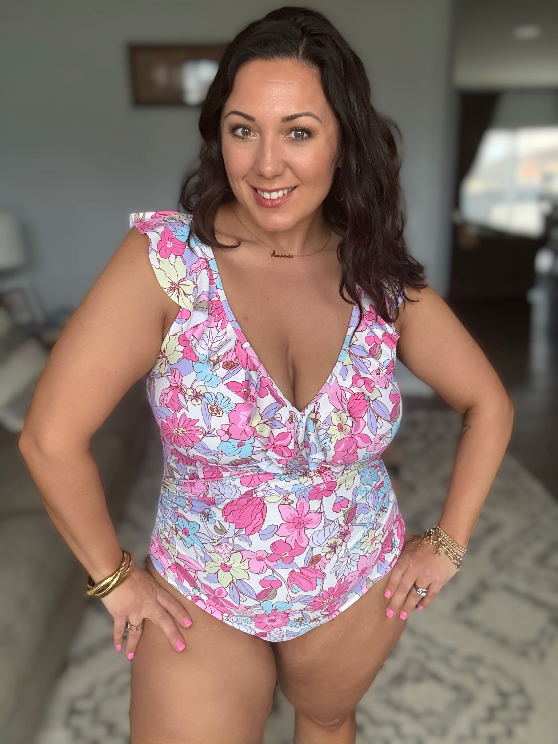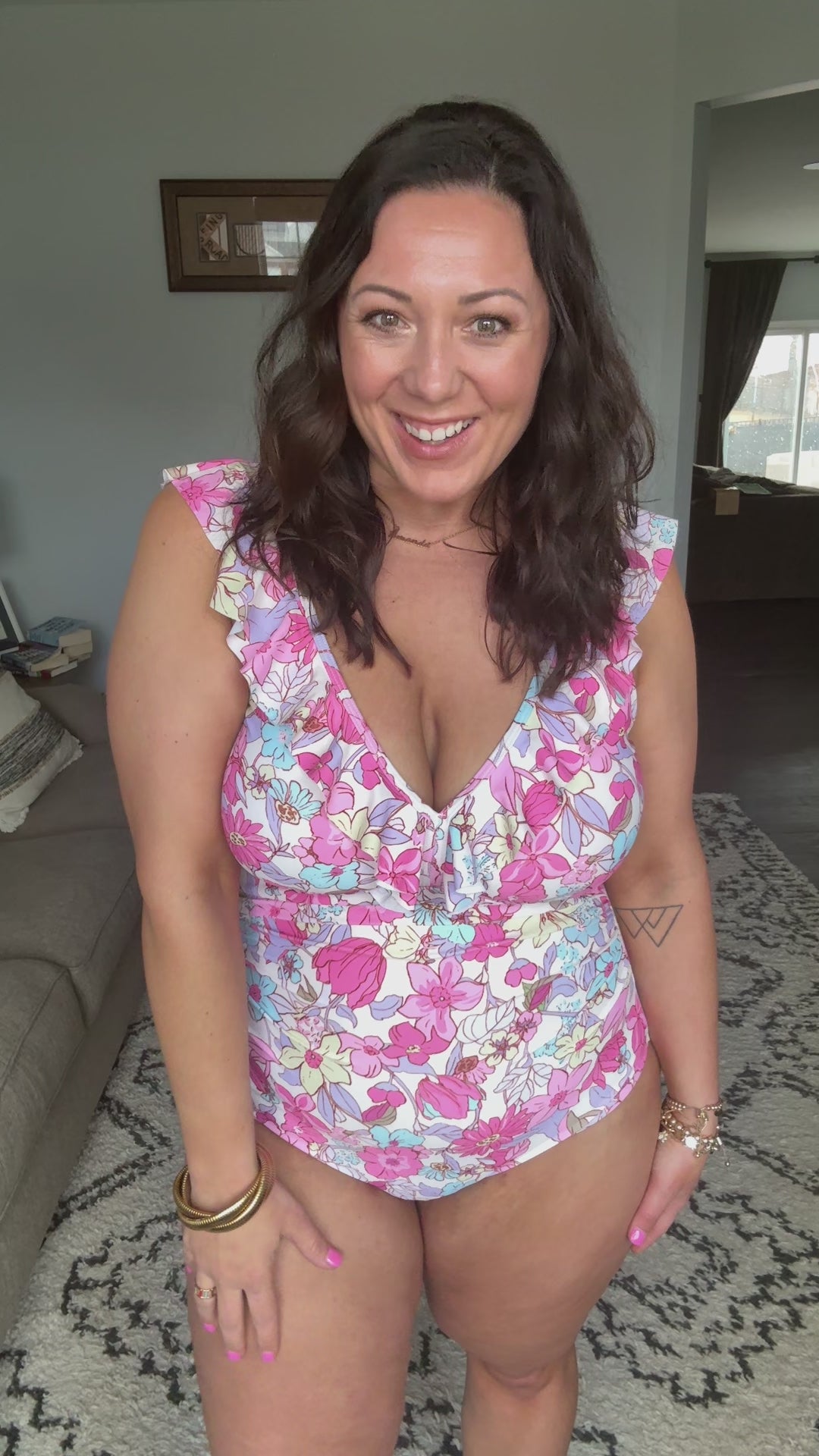 Make waves in the playful Naples Floral Ruched Swimsuit! The ruffle V-neckline adds a flirty touch, while the ruched sides provide a slimming effect. Featuring a gorgeous floral print and a lace-up back, this swimsuit is perfect for your next beach day. (Sassy and stylish, it's a must-have for your swimwear collection!)