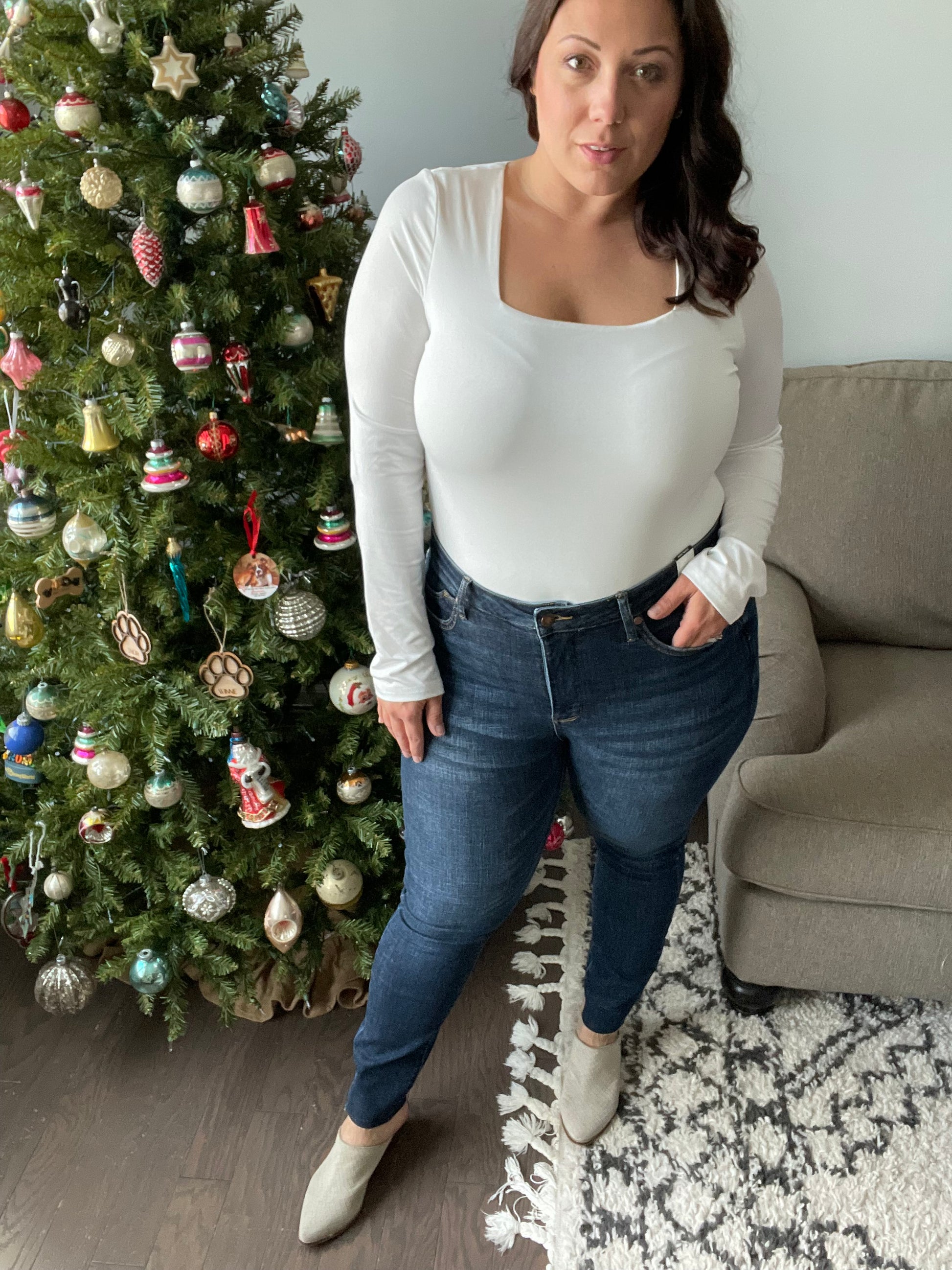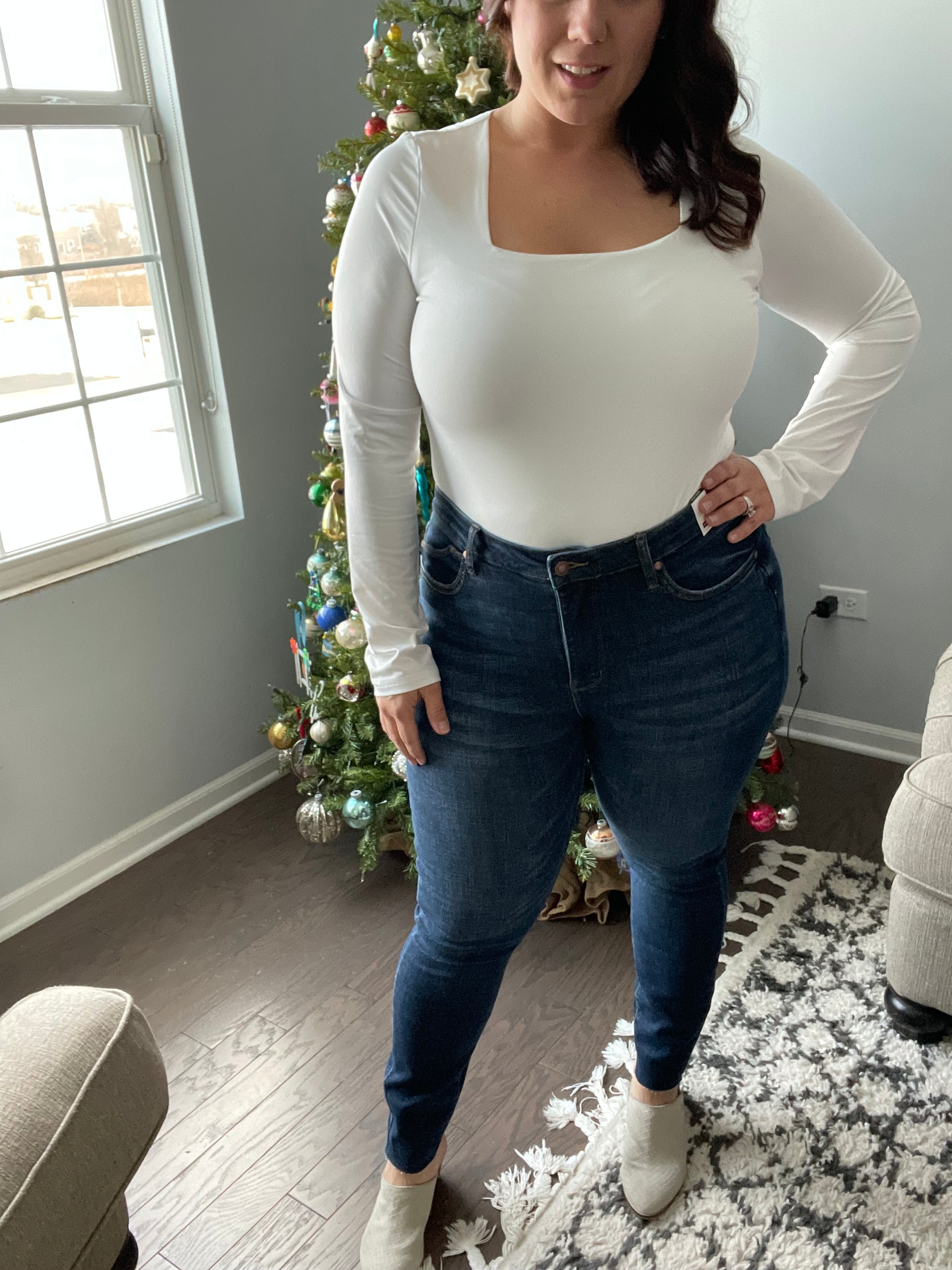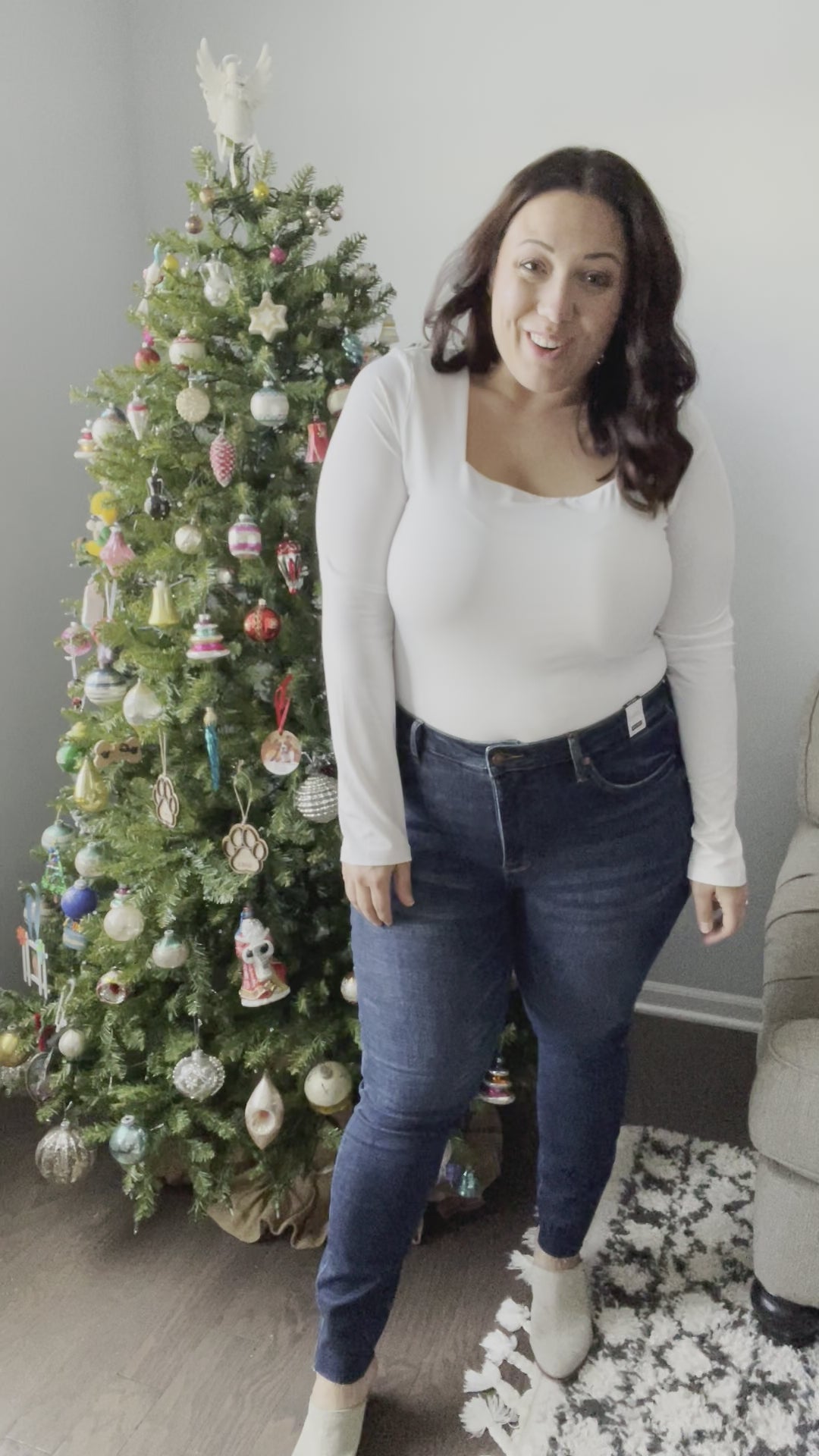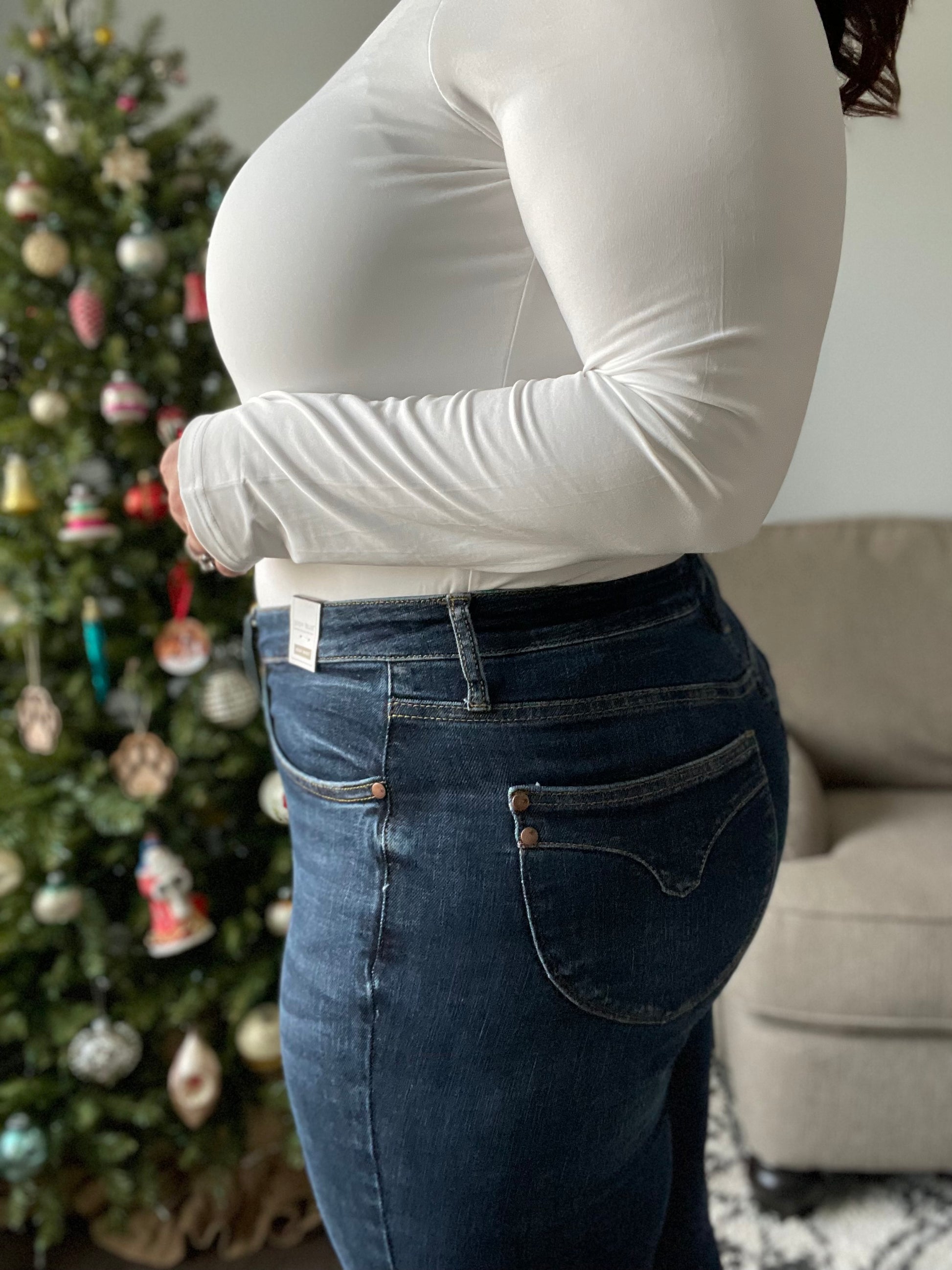 Experience an immediate confidence boost the second you slip on the Georgia Peach Tummy Control Skinny Jeans from Judy Blue! A dark wash stretch denim shapes an ultra flattering hi-waist with extra reinforcement creating a fan fav tummy control! A zipper fly tops a skinny leg that features worn-in fading and the round pocket cut with decorative stitching gives that booty a lift and somehow look more full