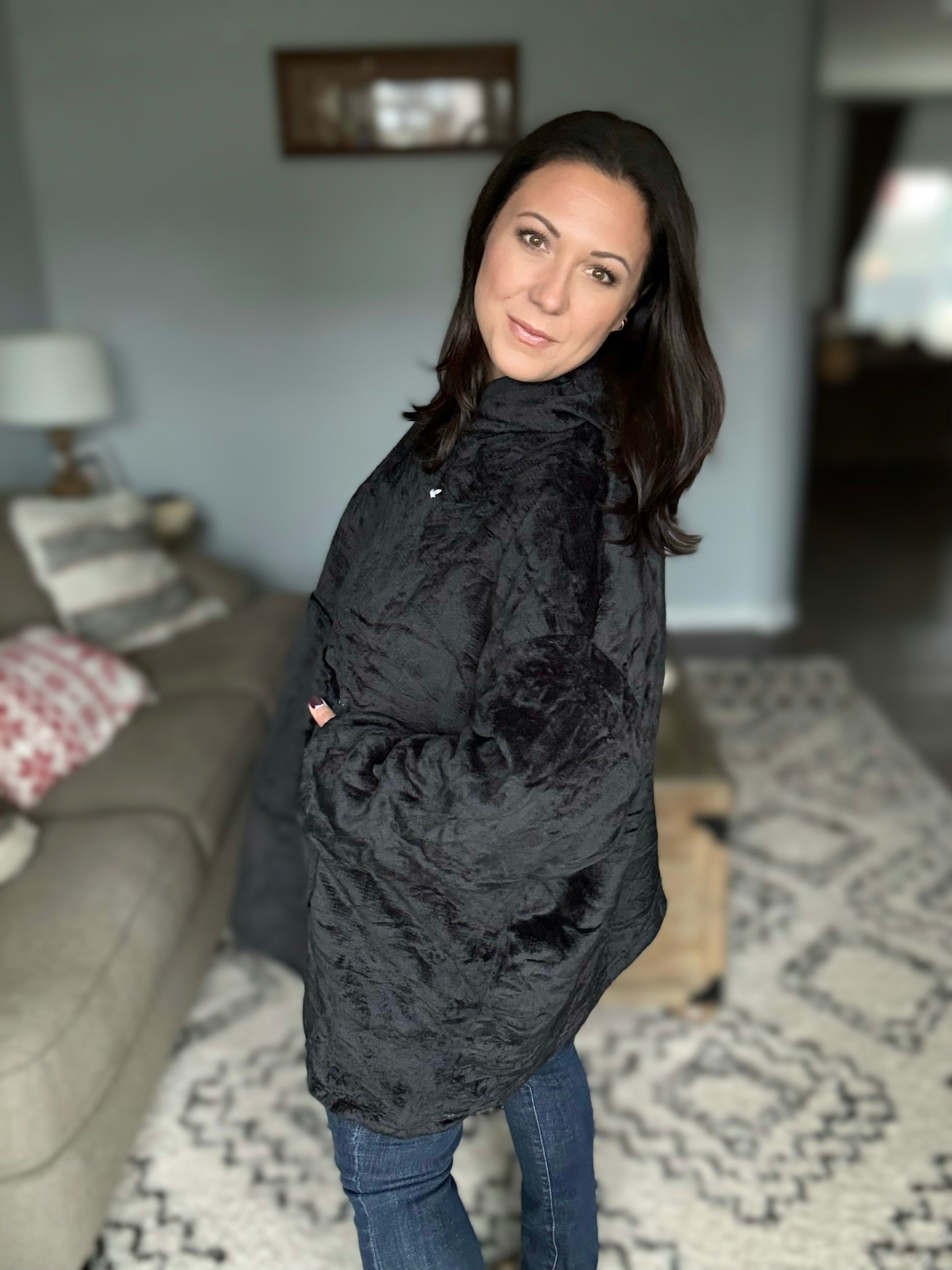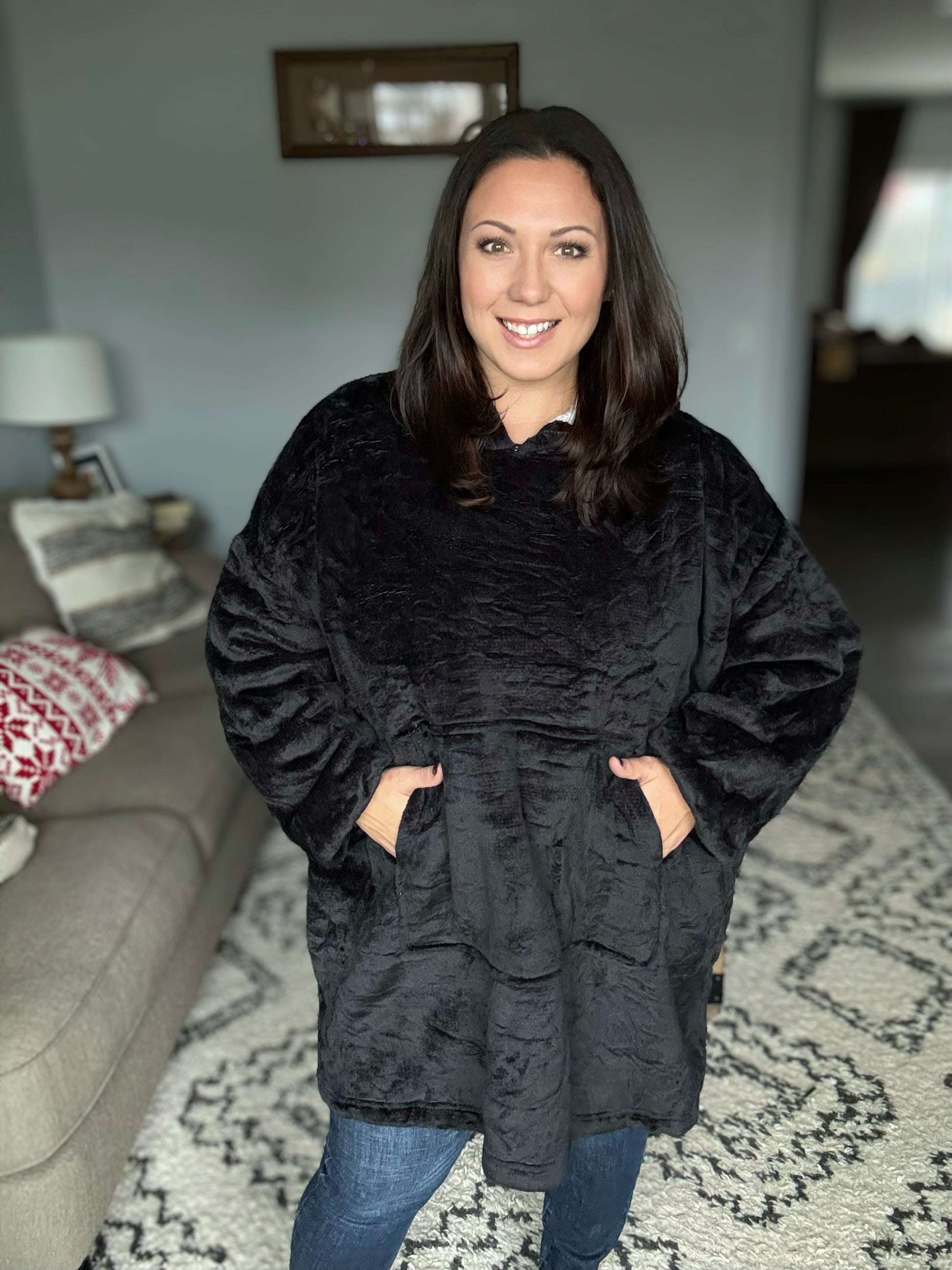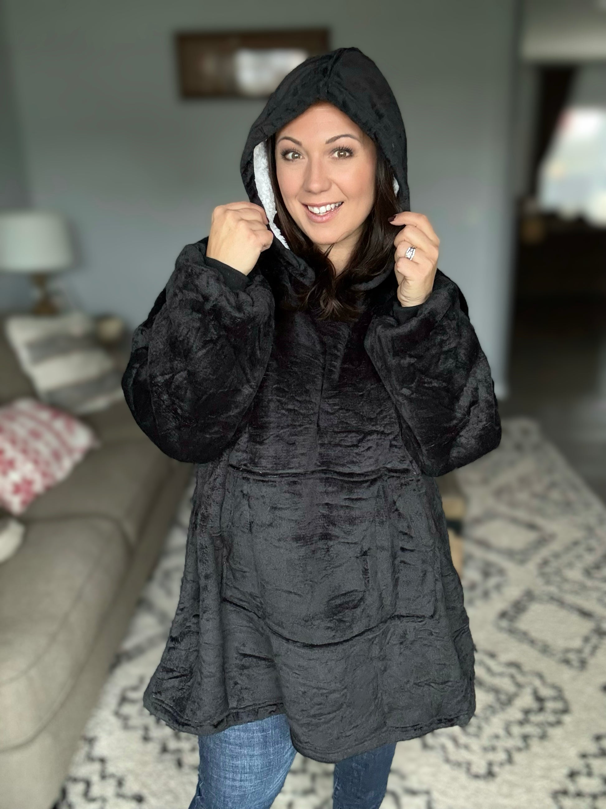 Wrap yourself in comfort and style with this Oversized Velour Blanket Hoodie! Featuring a luxuriously soft sherpa lining, spacious kangaroo pocket and hood, it's a cozy and fashionable addition to your wardrobe. Enjoy the oversized fit and the feeling of being enveloped in warmth and relaxation.