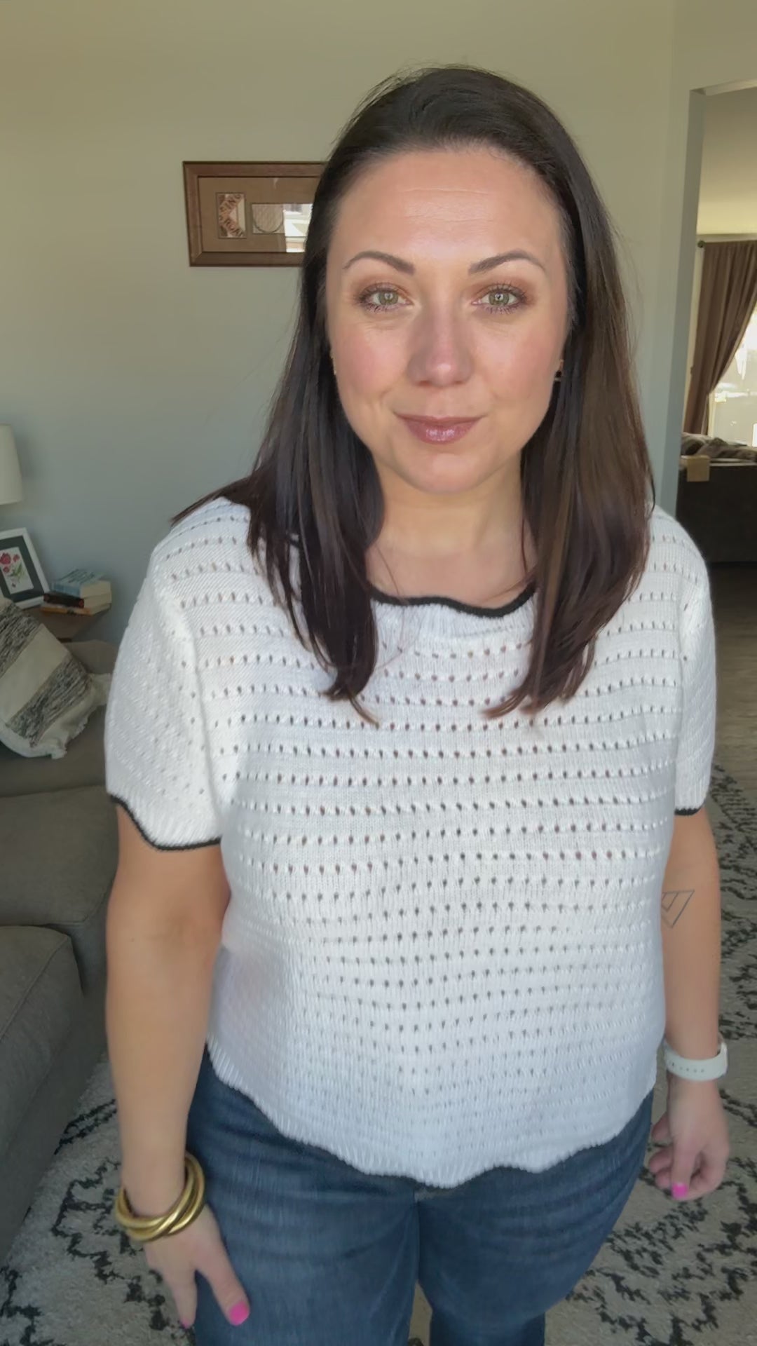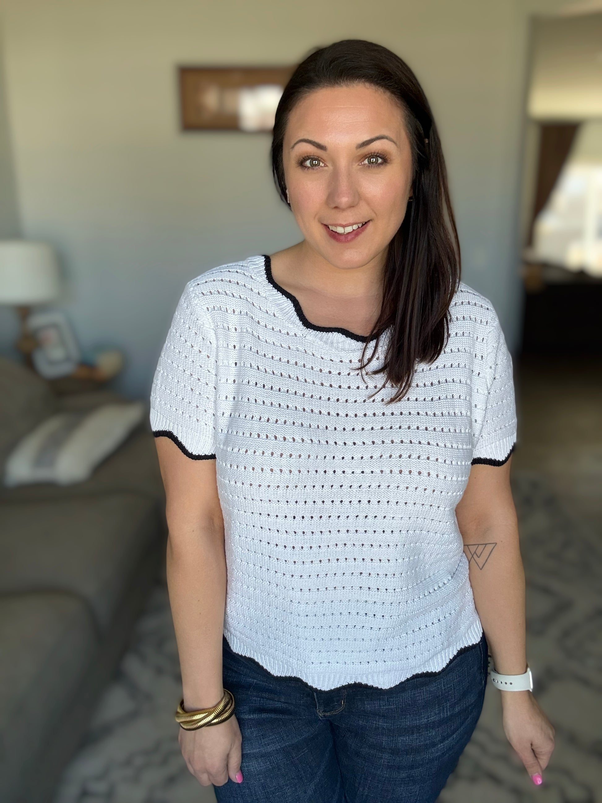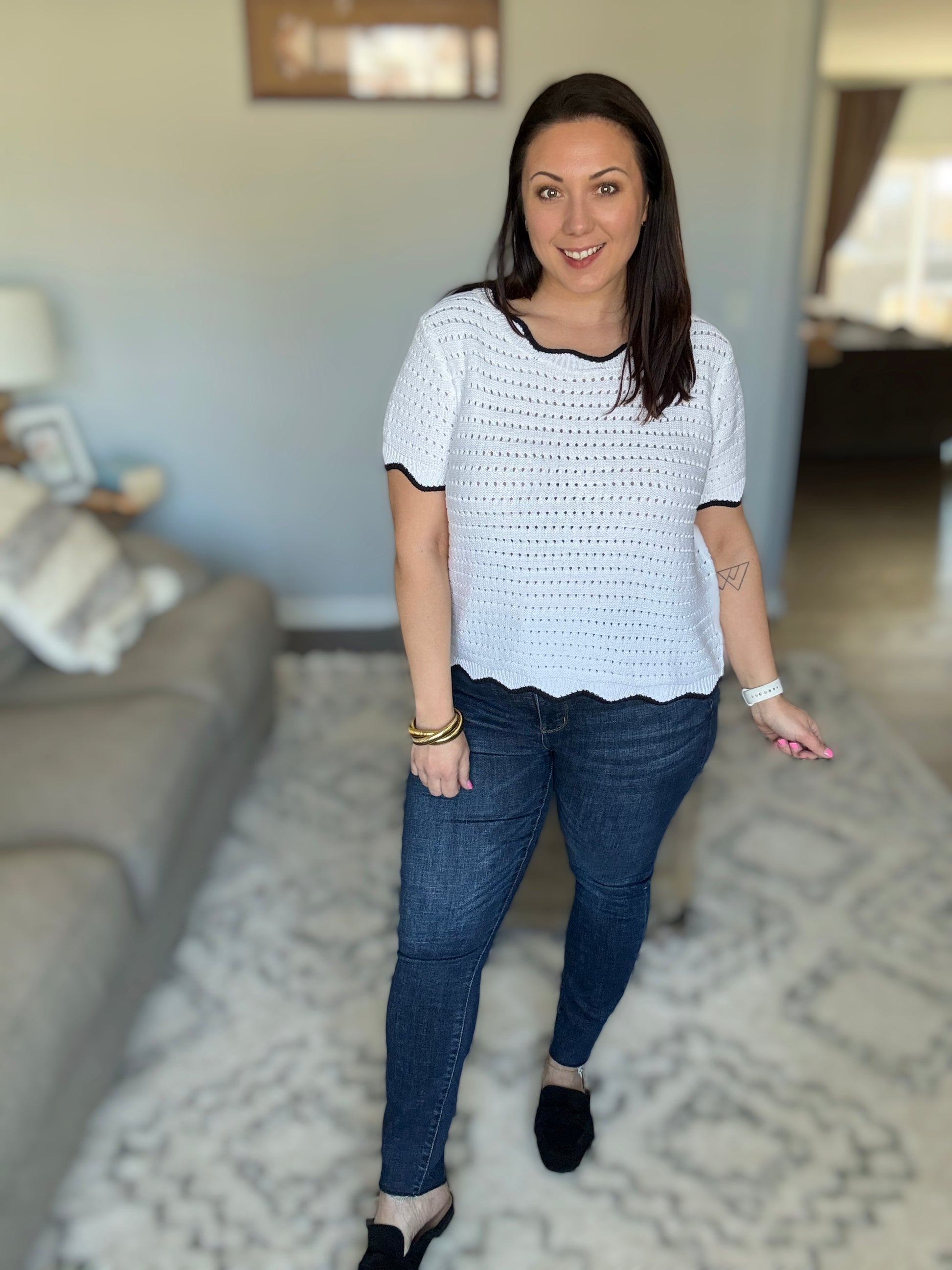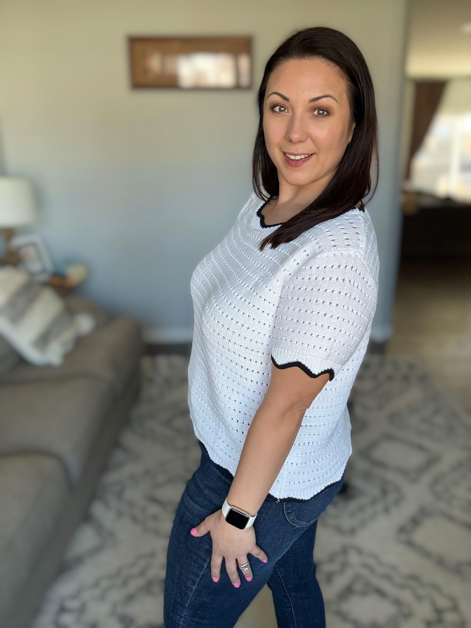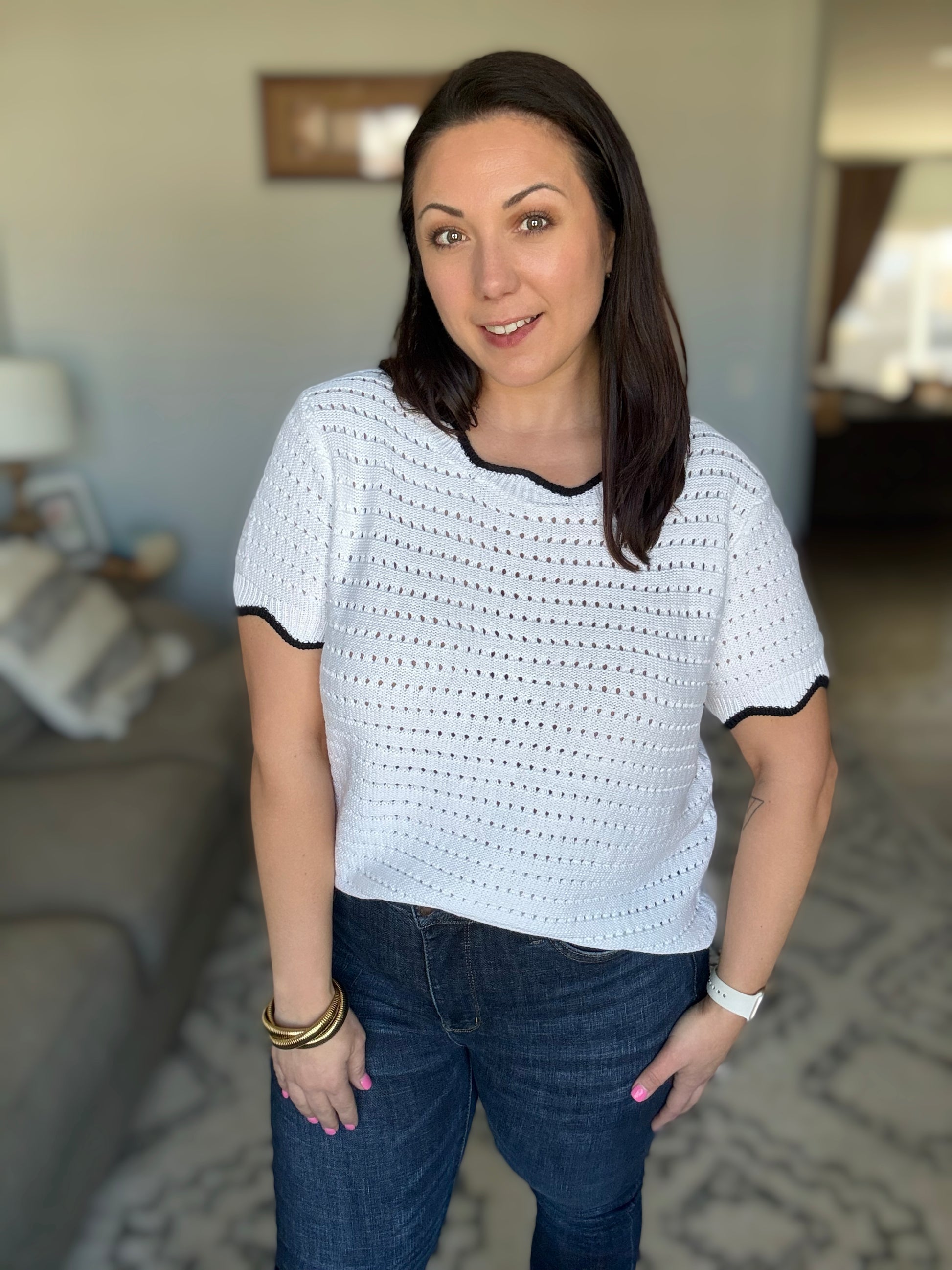 Elevate your style with our Pinkies Up Knit Top. The eyelet knit adds a touch of elegance, while the wavy contrast details on the neckline, sleeve cuff, and hemline bring a playful twist. Perfect for any occasion, this top will have you saying "Pinkies up!"