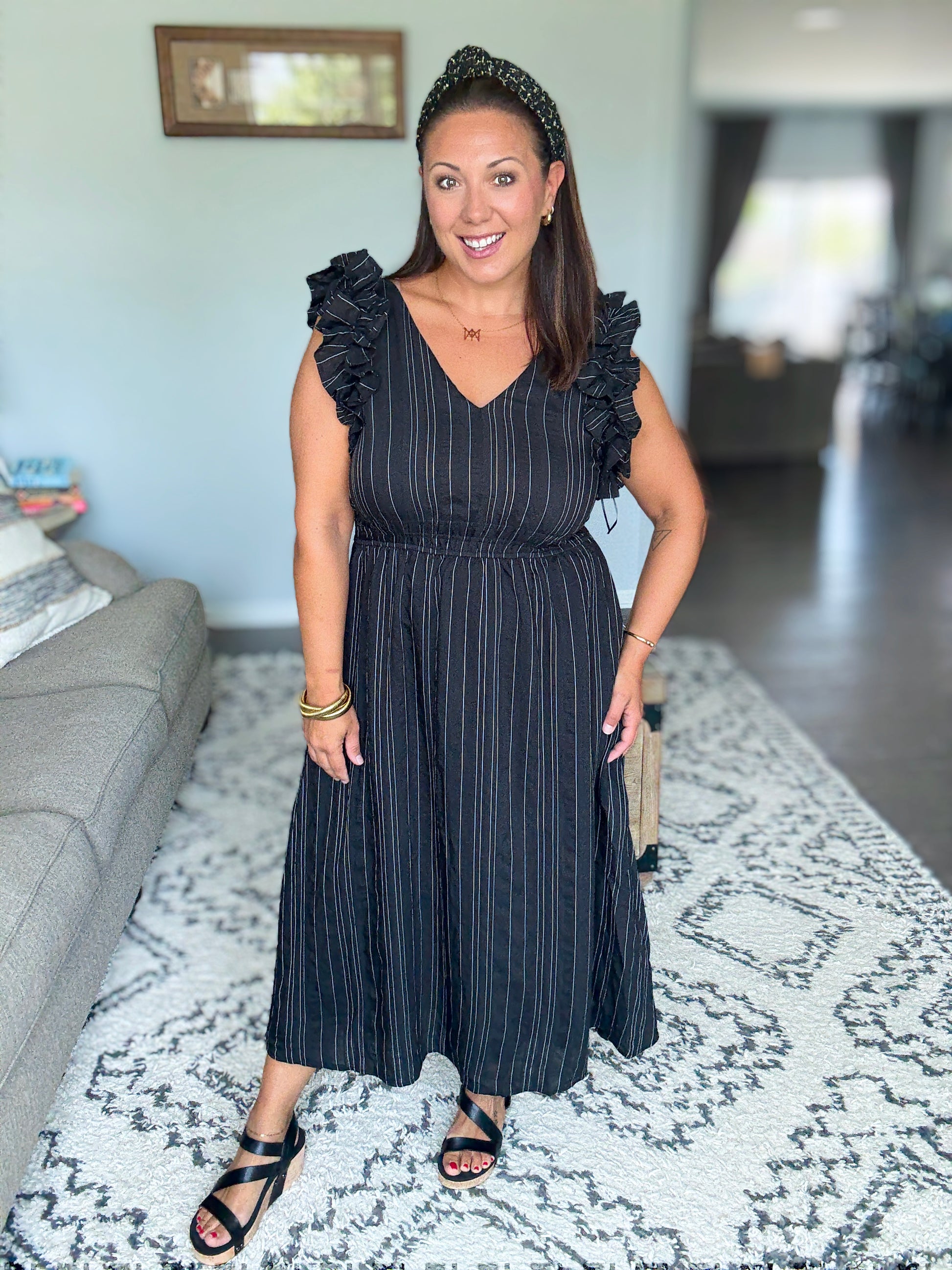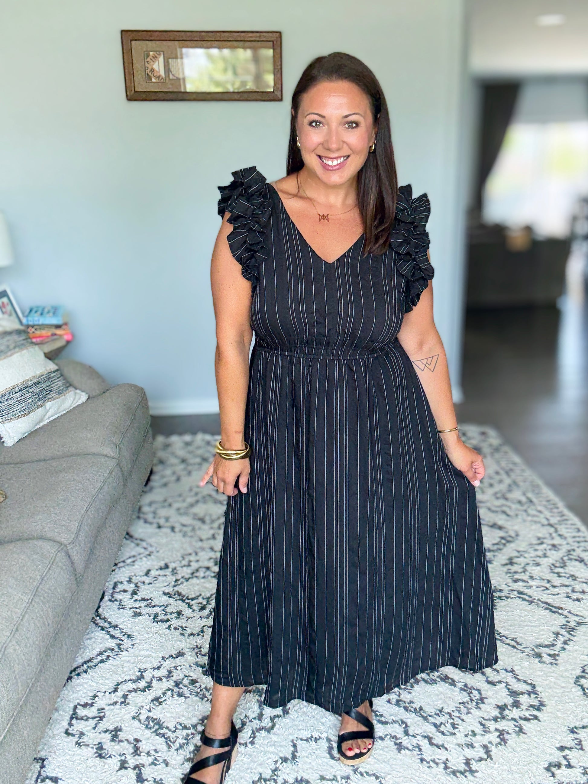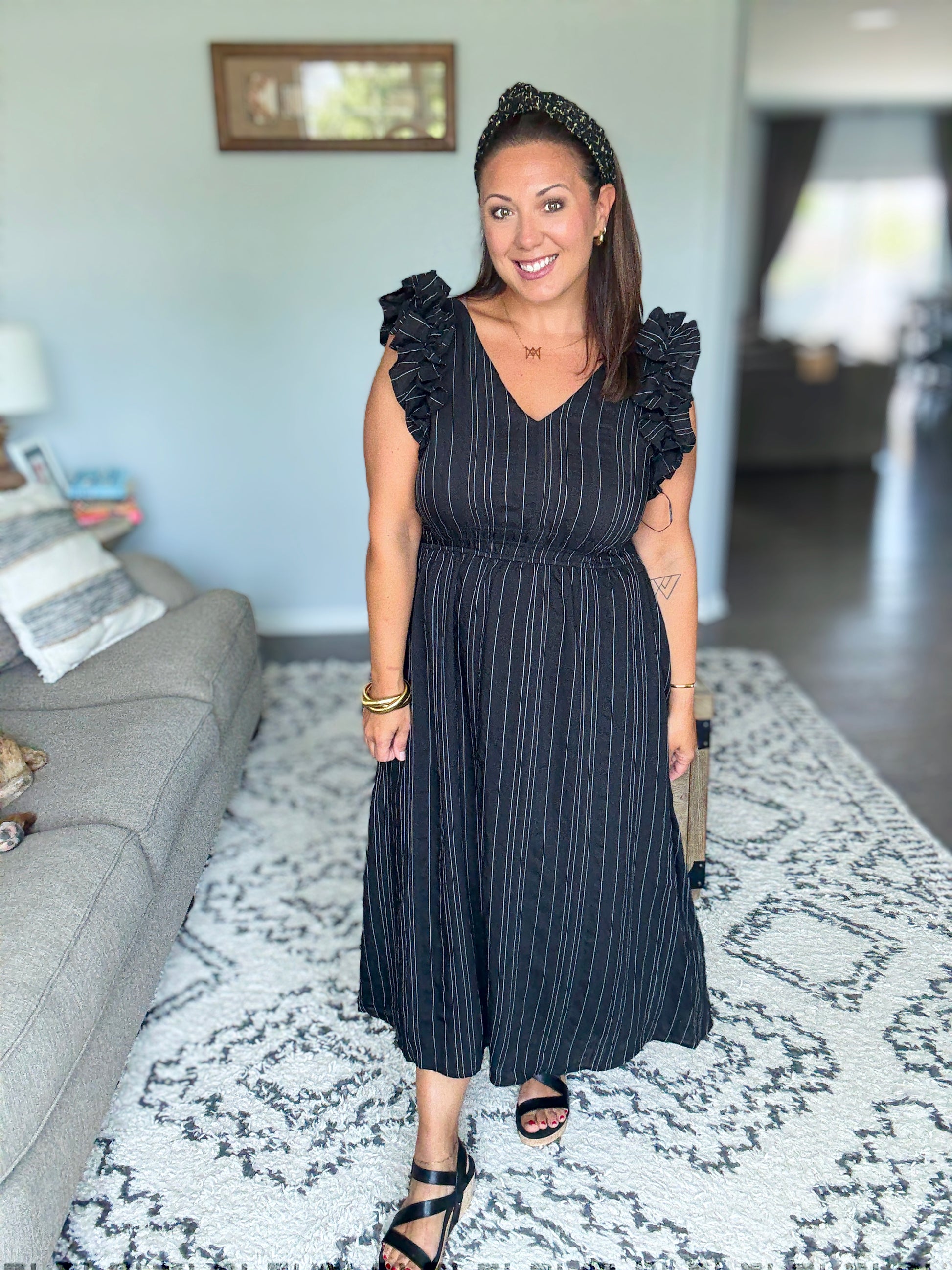 Pinstripe Romance V-Neck Ruffle Sleeve Dress in Black