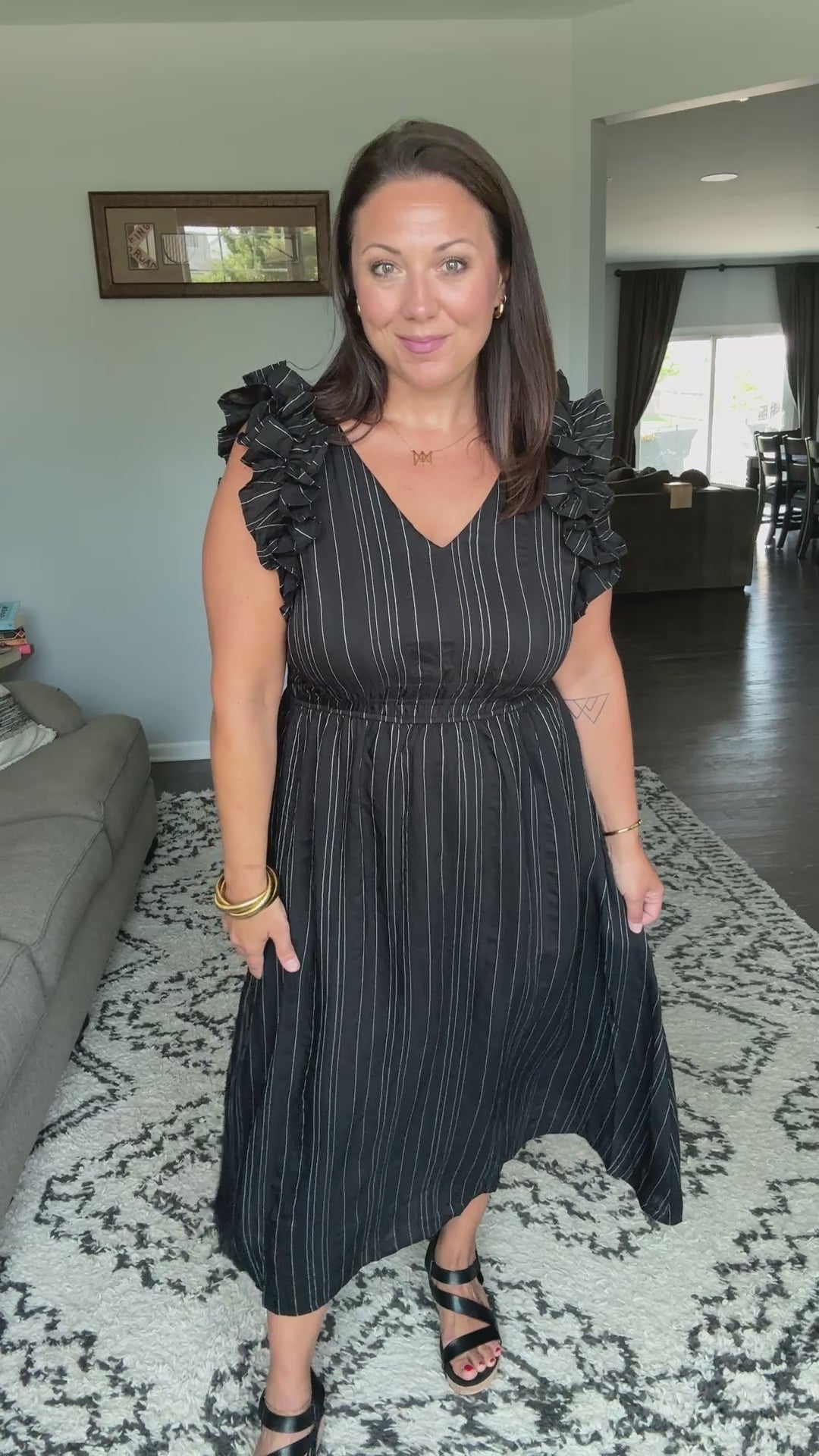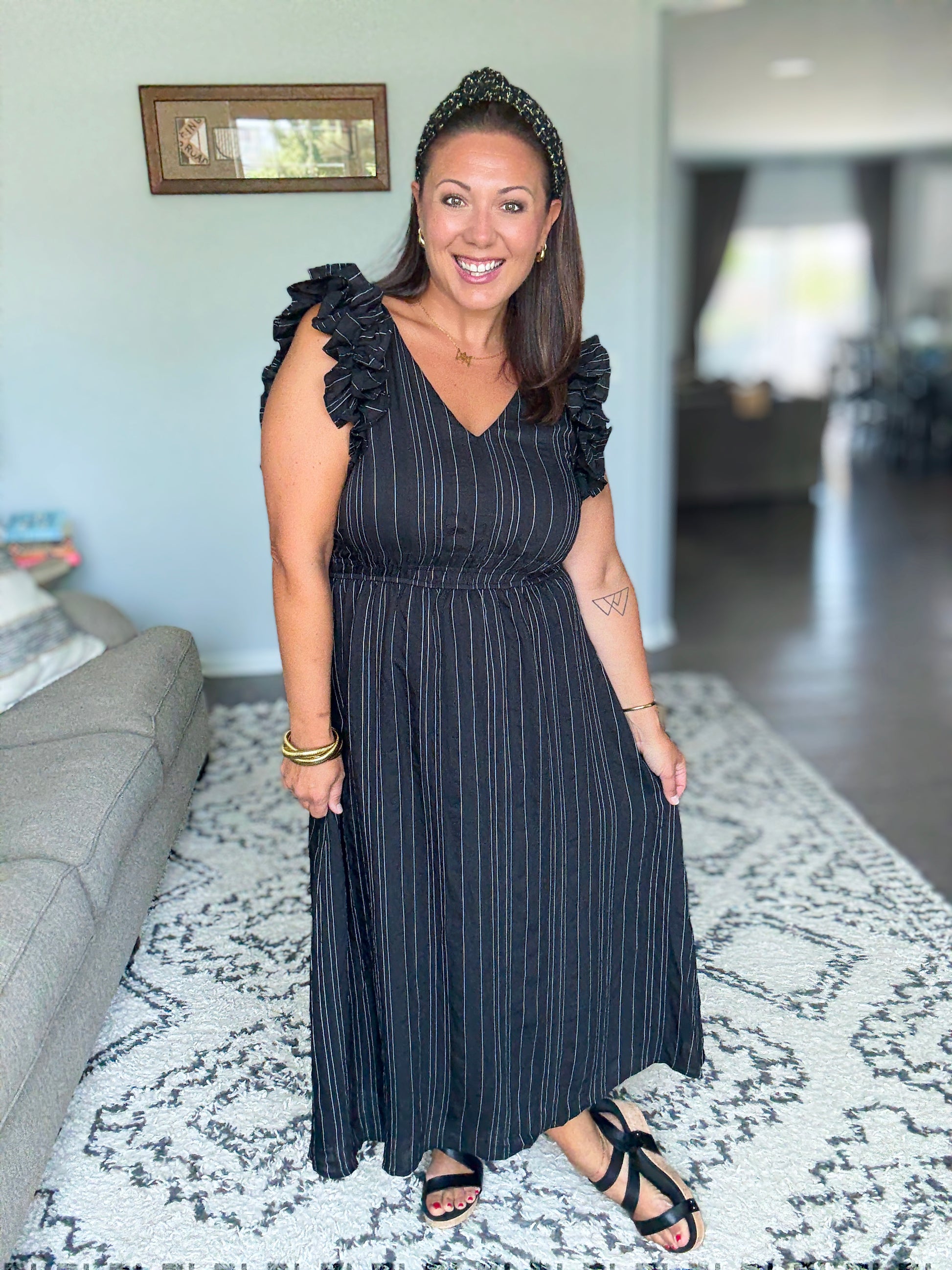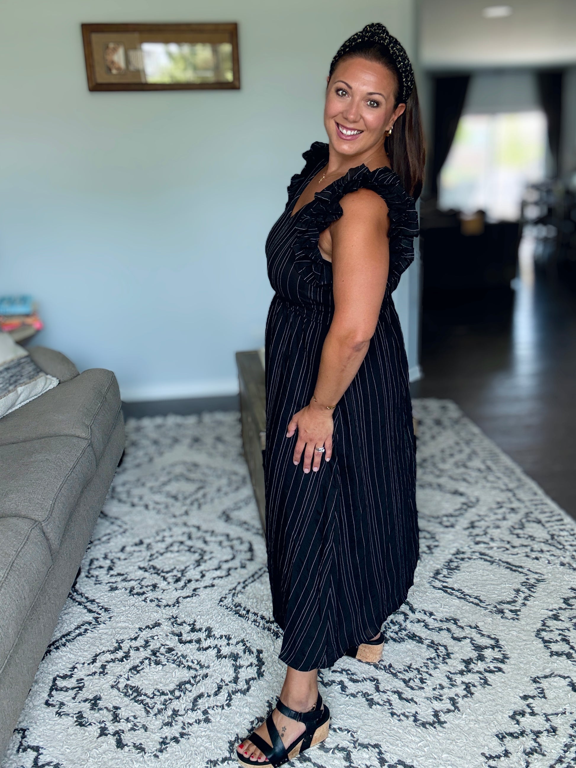 Pinstripe Romance V-Neck Ruffle Sleeve Dress in Black