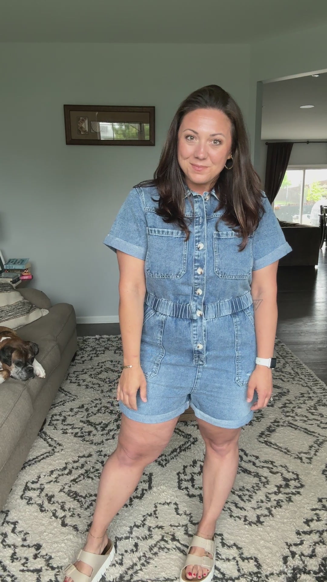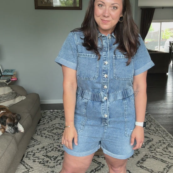 Be effortlessly cool in our Pleasant and Relevant Denim Romper! Made with mid-weight, no-stretch denim, this romper features a classic collar and half button down design, plus convenient patch pockets. The cased elastic waistband ensures a comfortable fit, while the cuffed and tacked hem adds a touch of style. Perfect for any casual occasion, this romper is a must-have for your wardrobe.