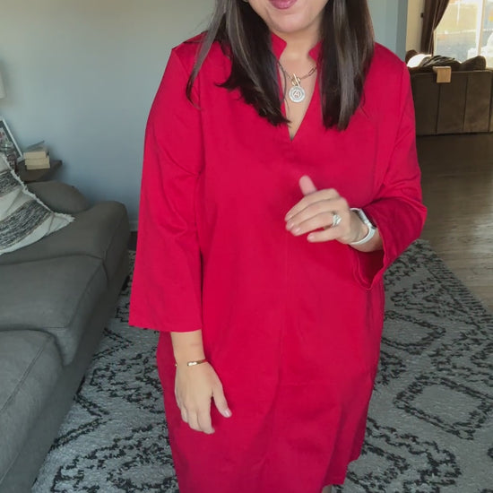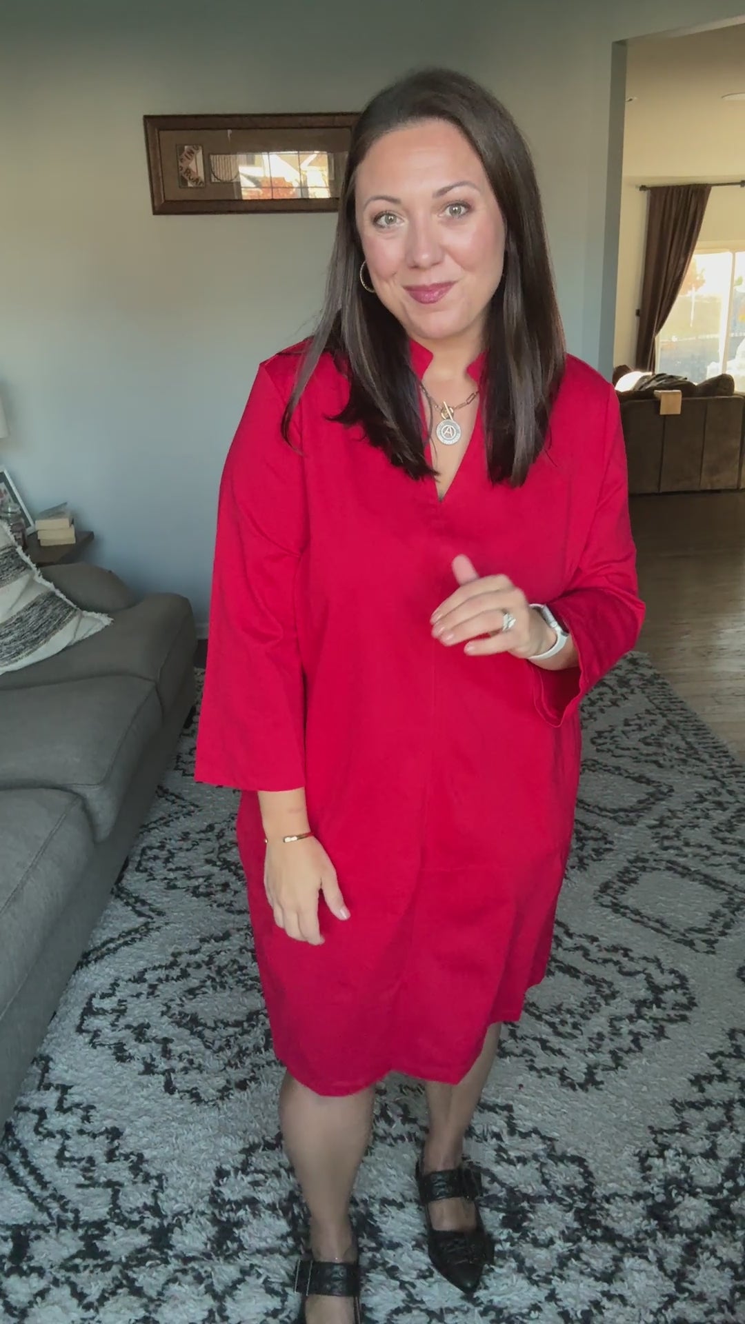 Make a bold statement in the Portfolio Quarter Sleeve Dress! Crafted from mid-heavy weight ponte knit, this dress offers structure and sophistication with serious stretch for all-day comfort. The flattering V-neckline draws the eye upward, while three-quarter sleeves strike the perfect balance between polished and relaxed. Functional side pockets keep your essentials close—because who doesn't love a dress that actually has pockets? Whether you're heading to the office or out for a night on the town, this versatile red dress is your secret weapon for looking put-together while feeling completely at ease.