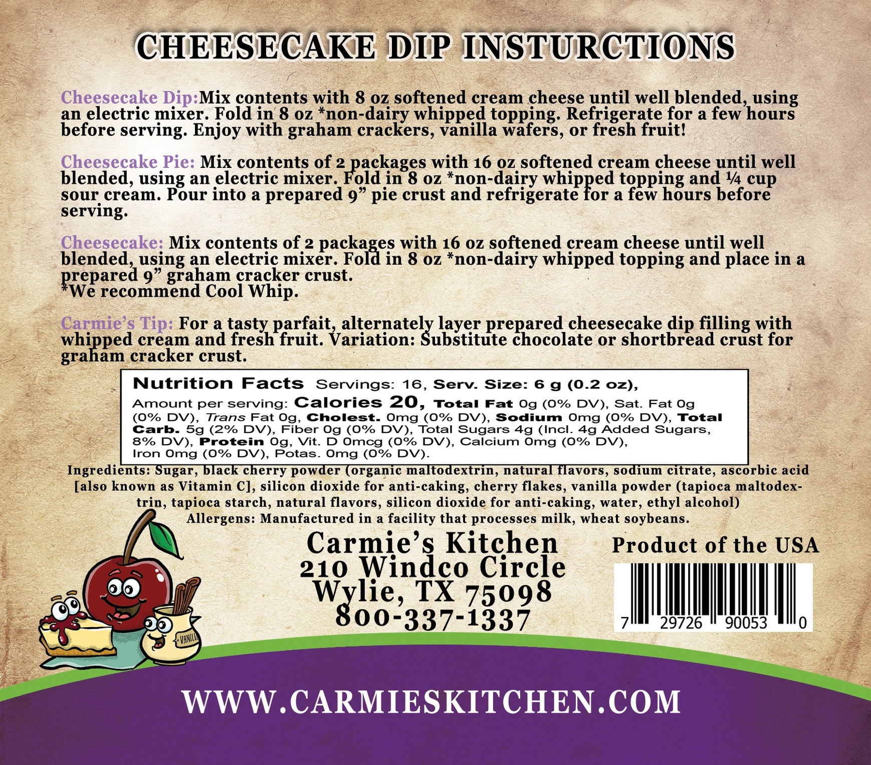 Classic cheesecake flavor made with black cherries and vanilla. Just add a few simple ingredients to make this cheesecake dip mix into a cheesecake dip, pie, or traditional cheesecake. It is all-natural and contains no MSG or preservatives. Carmie's dip mixes make the perfect stocking stuffer, hostess gift, holiday gift, or holiday party addition!