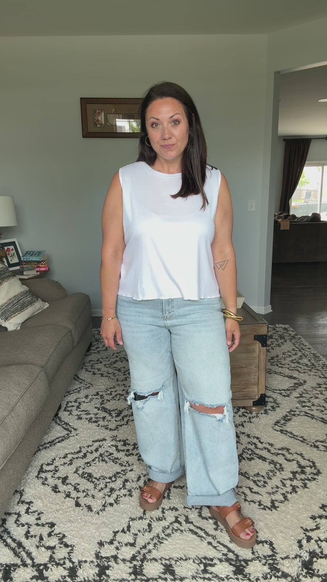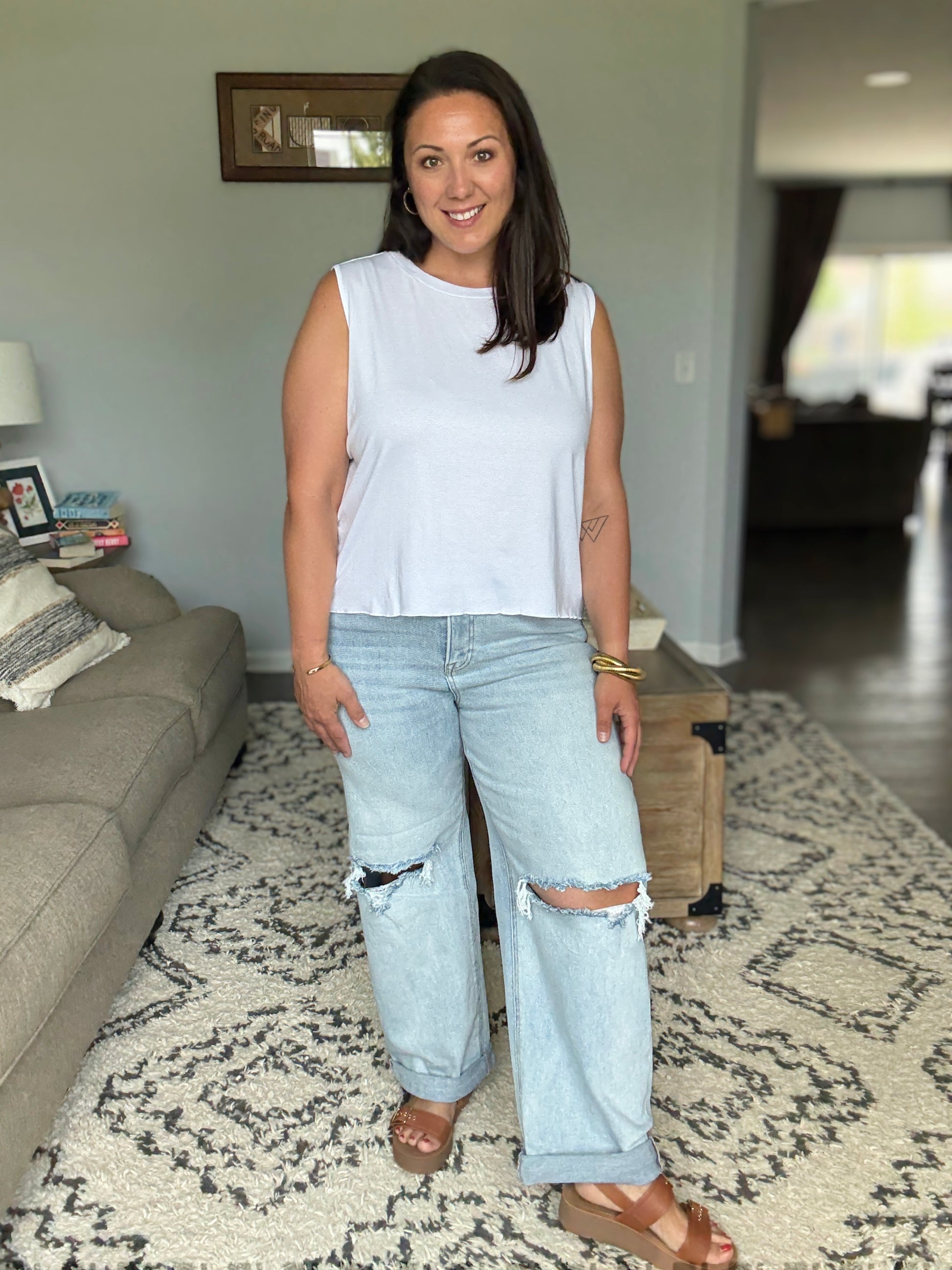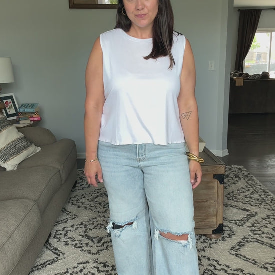 These wide-leg boyfriend jeans feature a contemporary light wash denim construction with strategic distressing at the knees. Made from quality cotton blend denim fabric that offers both comfort and durability. The relaxed silhouette and cropped length with roll-up cuffs create a casual, laid-back aesthetic. Perfect for everyday wear with a mid-rise waist and classic 5-pocket design. The distressed details add an edgy, lived-in look while maintaining versatile styling options.