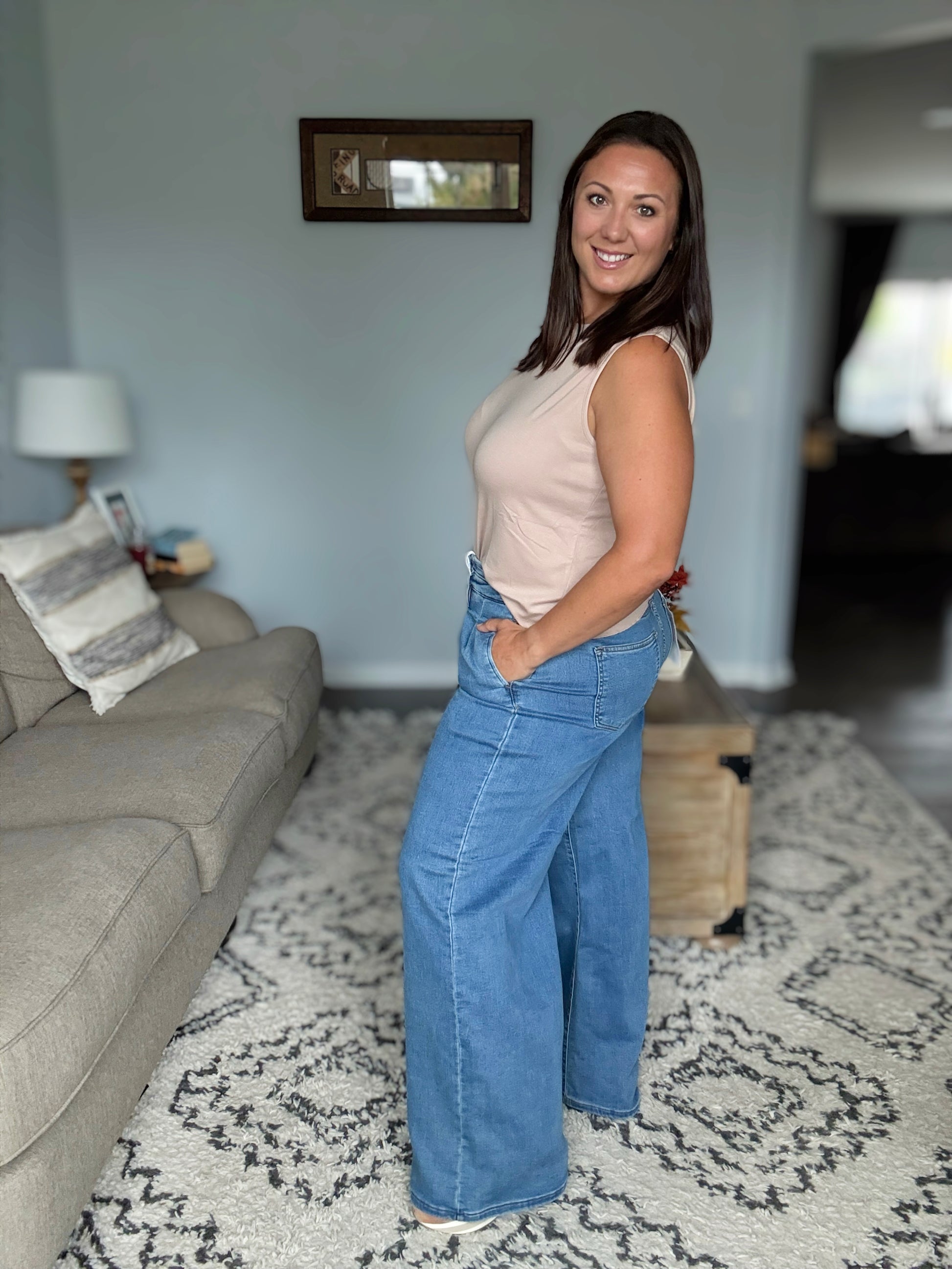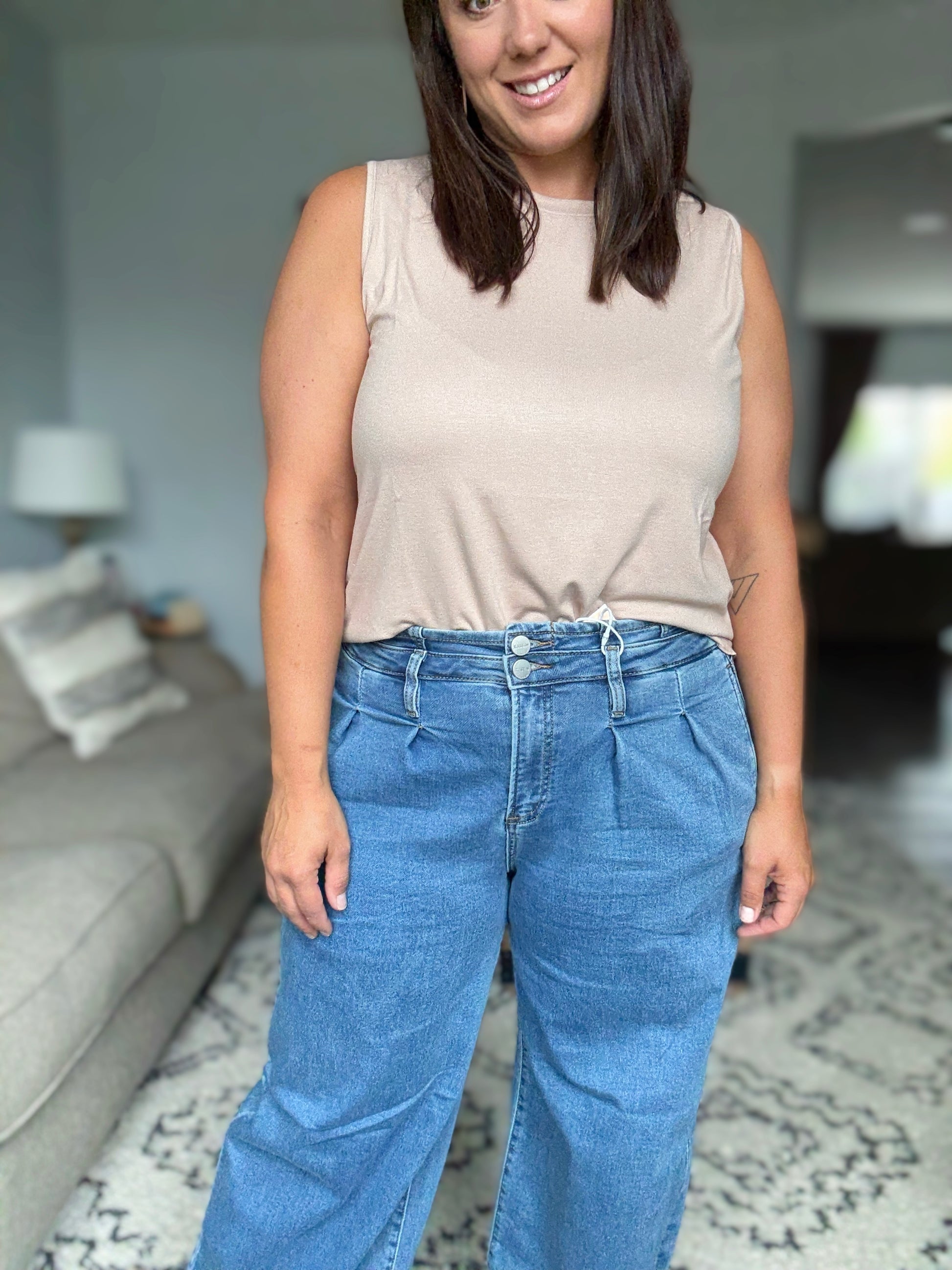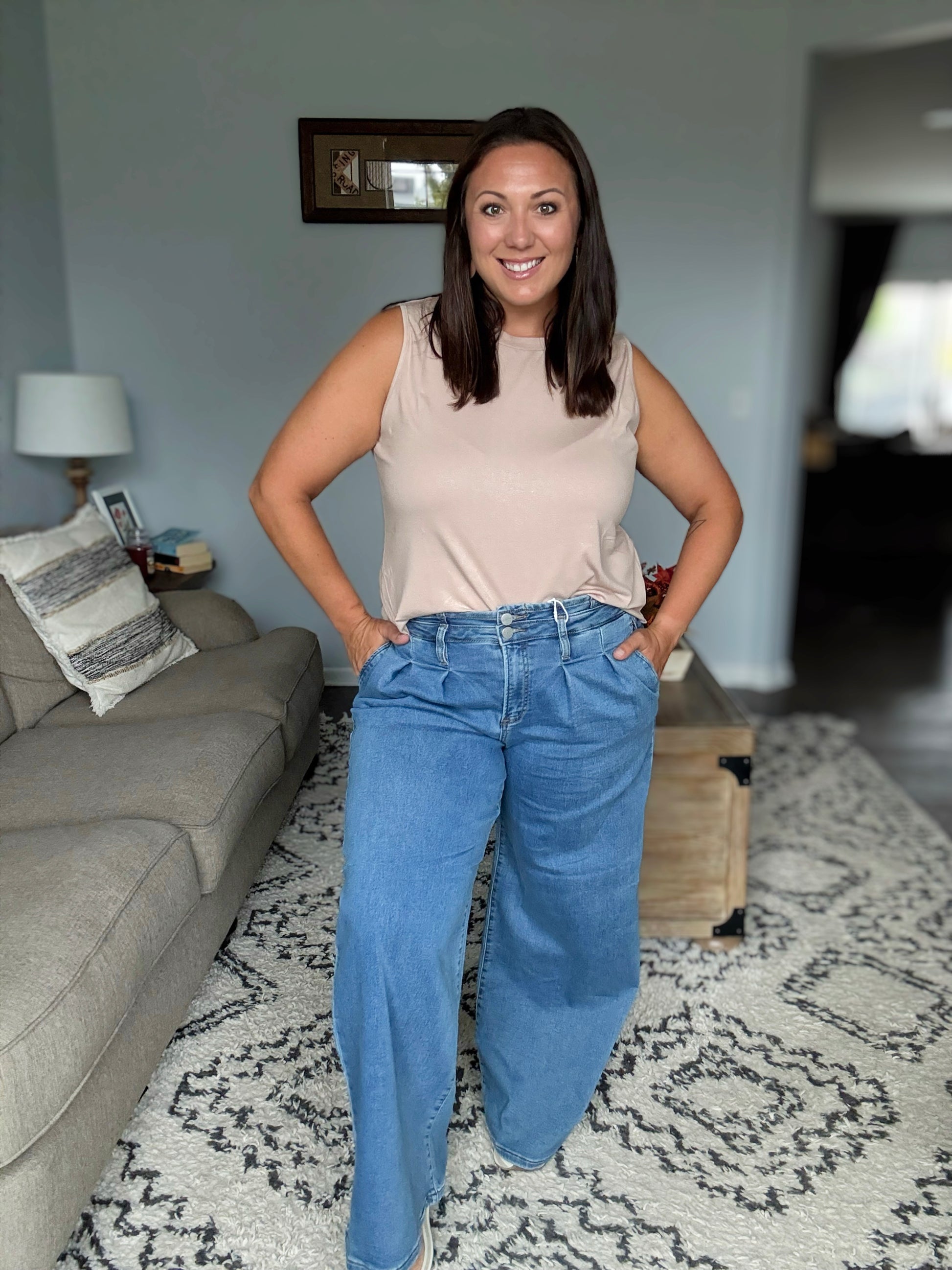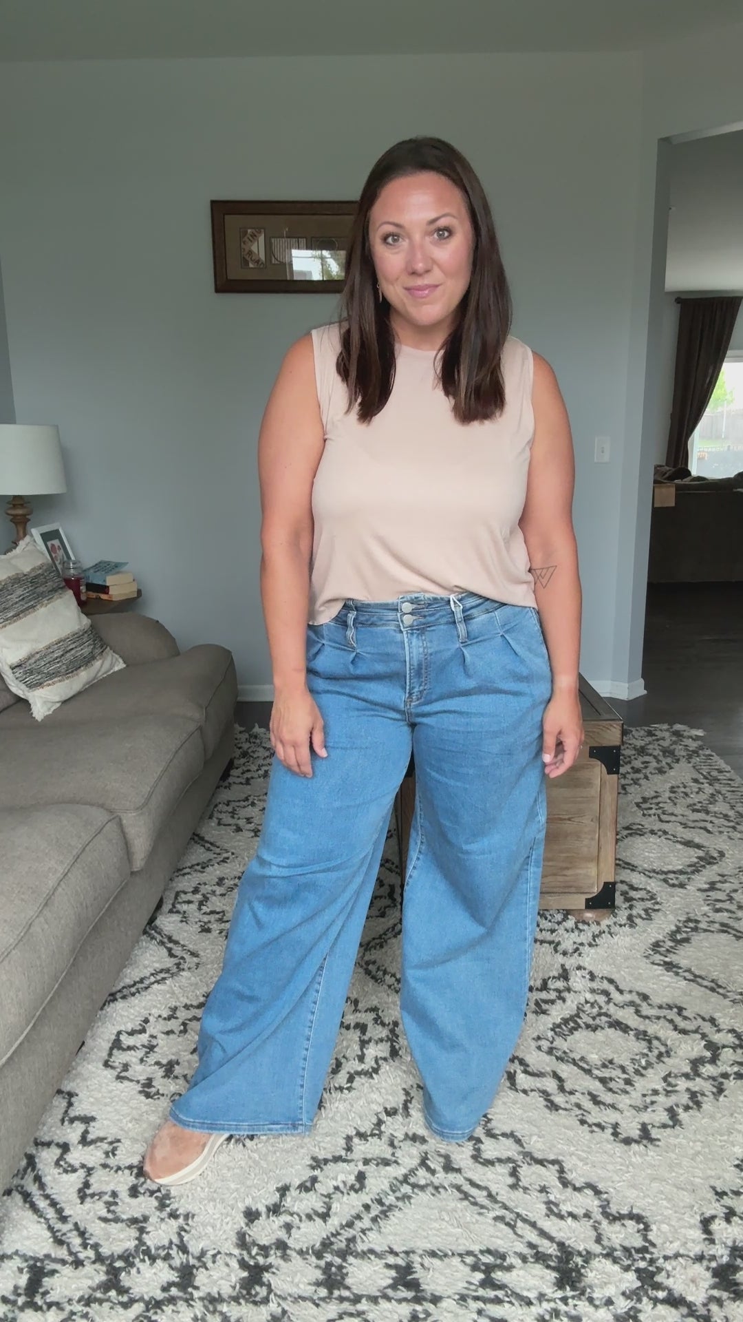 These new Wide Leg Pleated Jeans offer a stylish and sophisticated take on classic denim. With their mid-rise waist, they provide a comfortable and flattering fit that is easy to wear all day. (Seriously -check out the fit video to see stretch in the fabric!) The wide leg silhouette with pleated details adds a modern trend to your outfit. These jeans are perfect for creating a fashion-forward look that can be dressed up or down depending on the occasion. Adding a belt transforms these jeans! Elevate your wardrobe with these chic and versatile jeans that are sure to make a statement wherever you go.