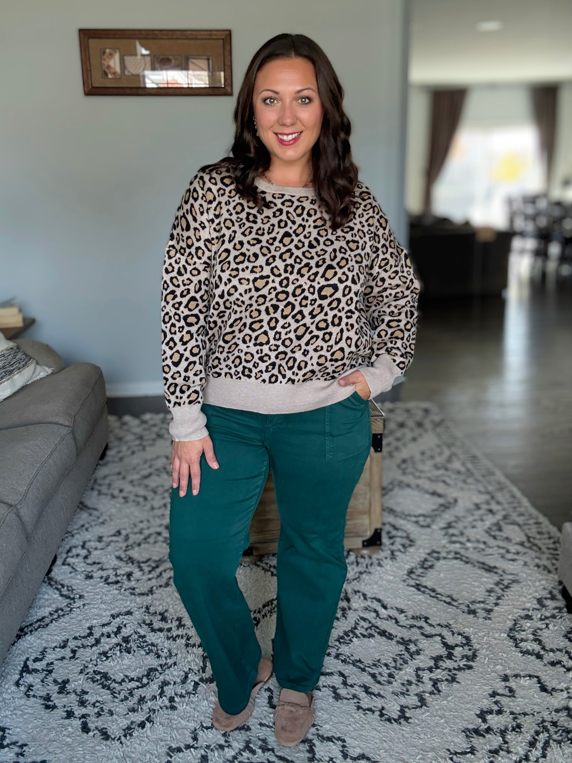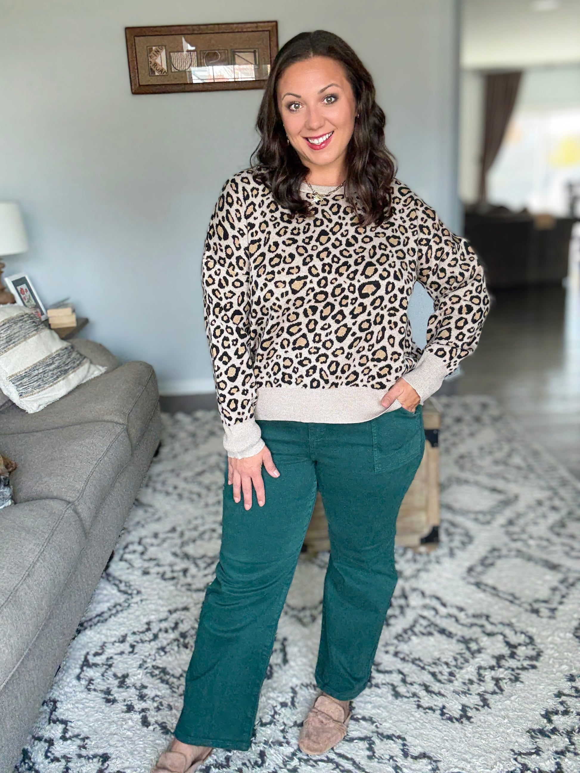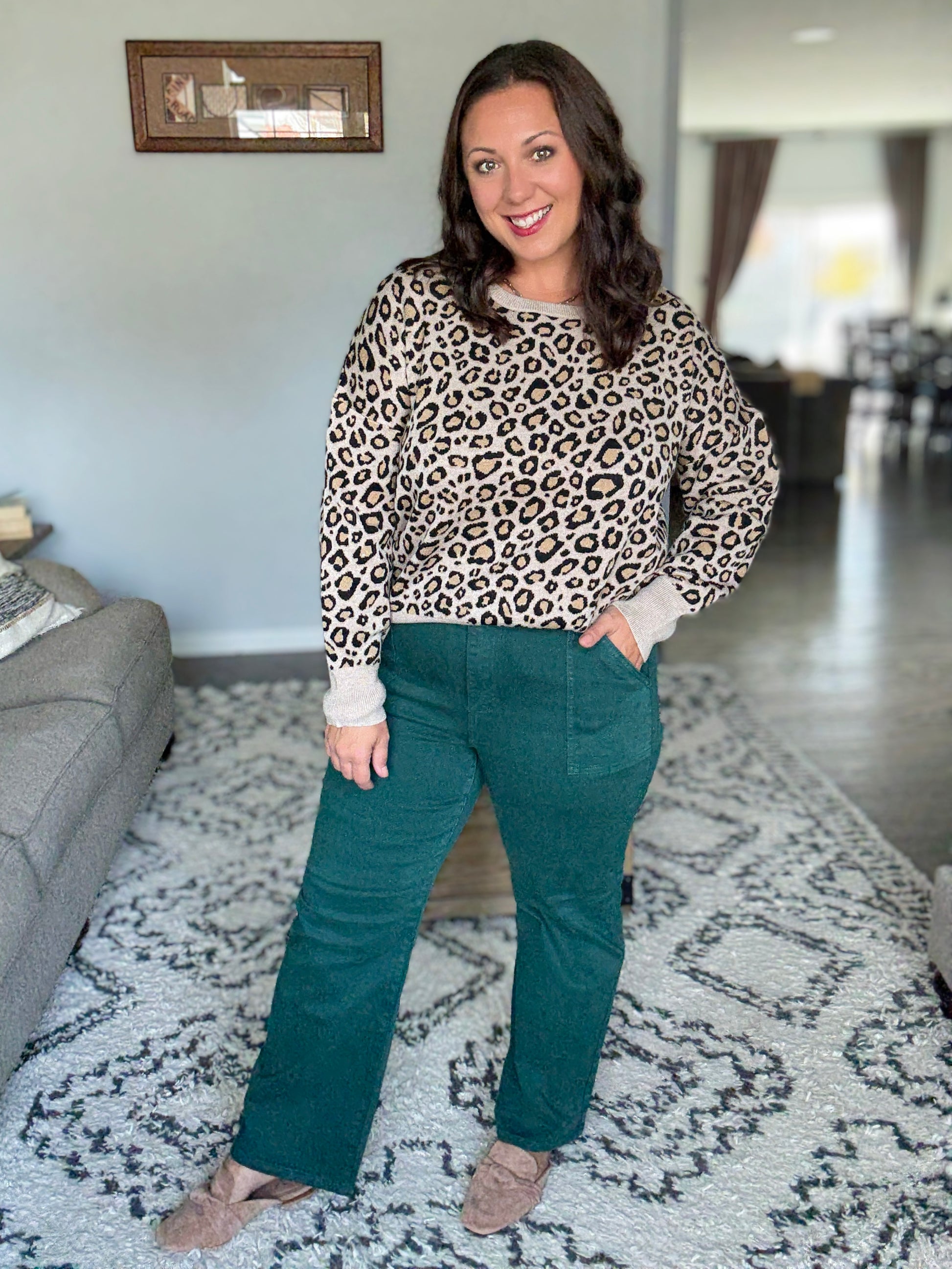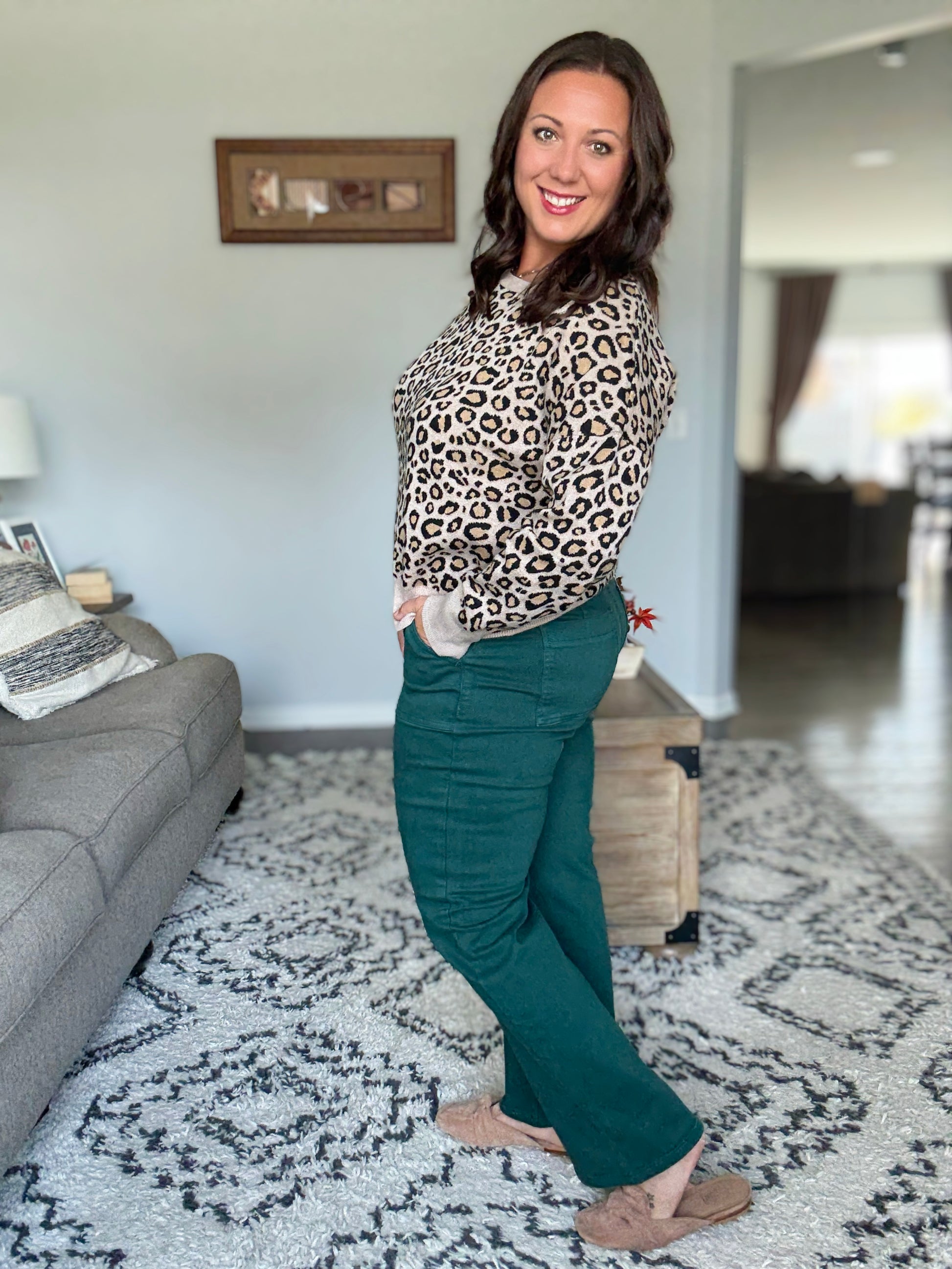 These high rise ankle flare patch pocket jeans in Hunter Green are a stylish and contemporary addition to your wardrobe. The high-rise waist provides a flattering silhouette while the ankle flare design adds a modern touch. Featuring patch pockets for a utilitarian look, these jeans offer both style and functionality. Pair them with a tucked-in blouse or a crop top for a trendy and chic ensemble. The Hunter Green adds a pop of color and a great for holiday styling.