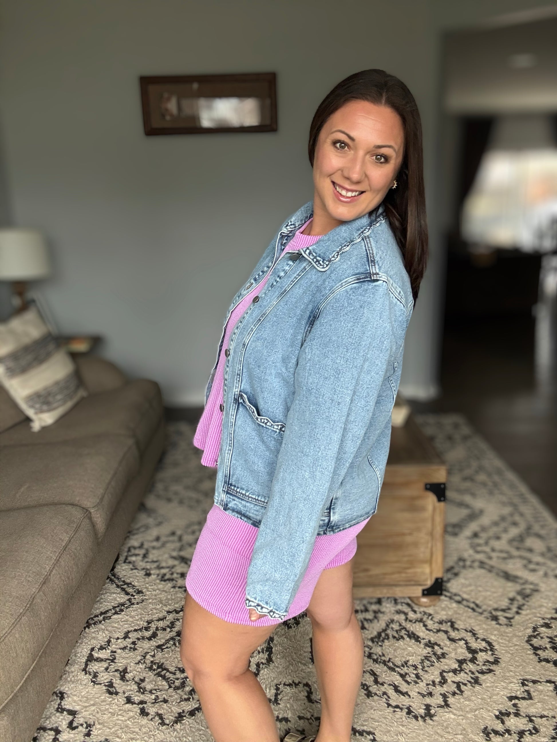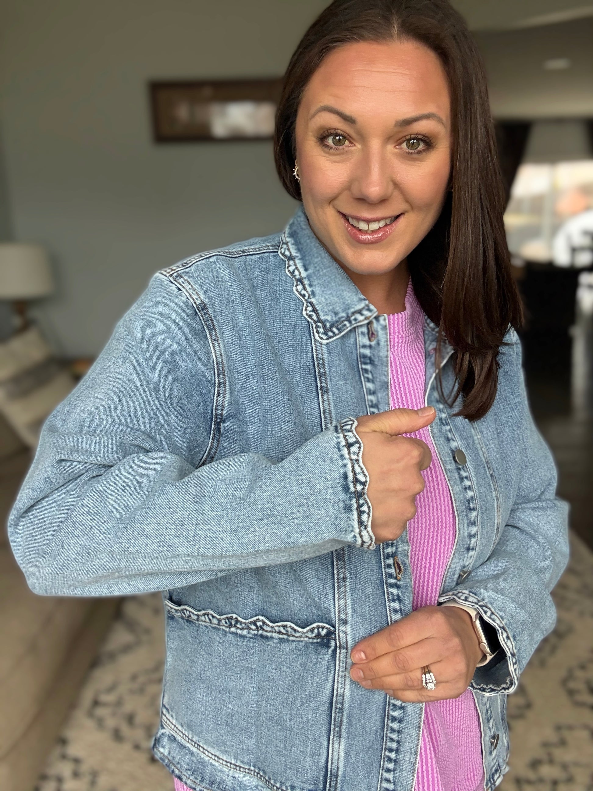 This denim jacket is the perfect twist on a classic wardrobe staple. The soft, lived-in denim gives it that comfortable feel right from the start, while the scalloped detailing adds such a fun and feminine touch.