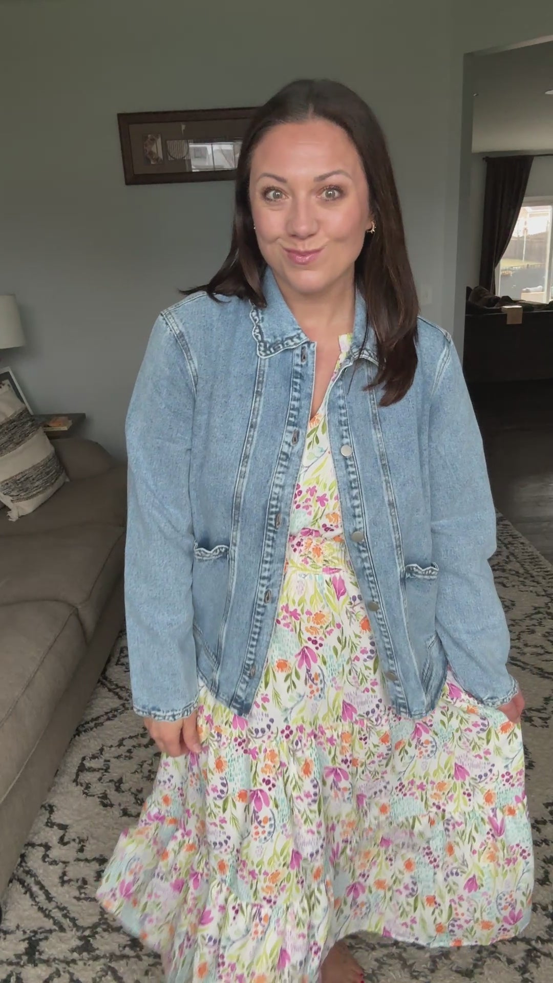 The light wash makes it especially perfect for spring and summer outfits, and the functional buttons allow you to wear it open as a layer or closed as a top.