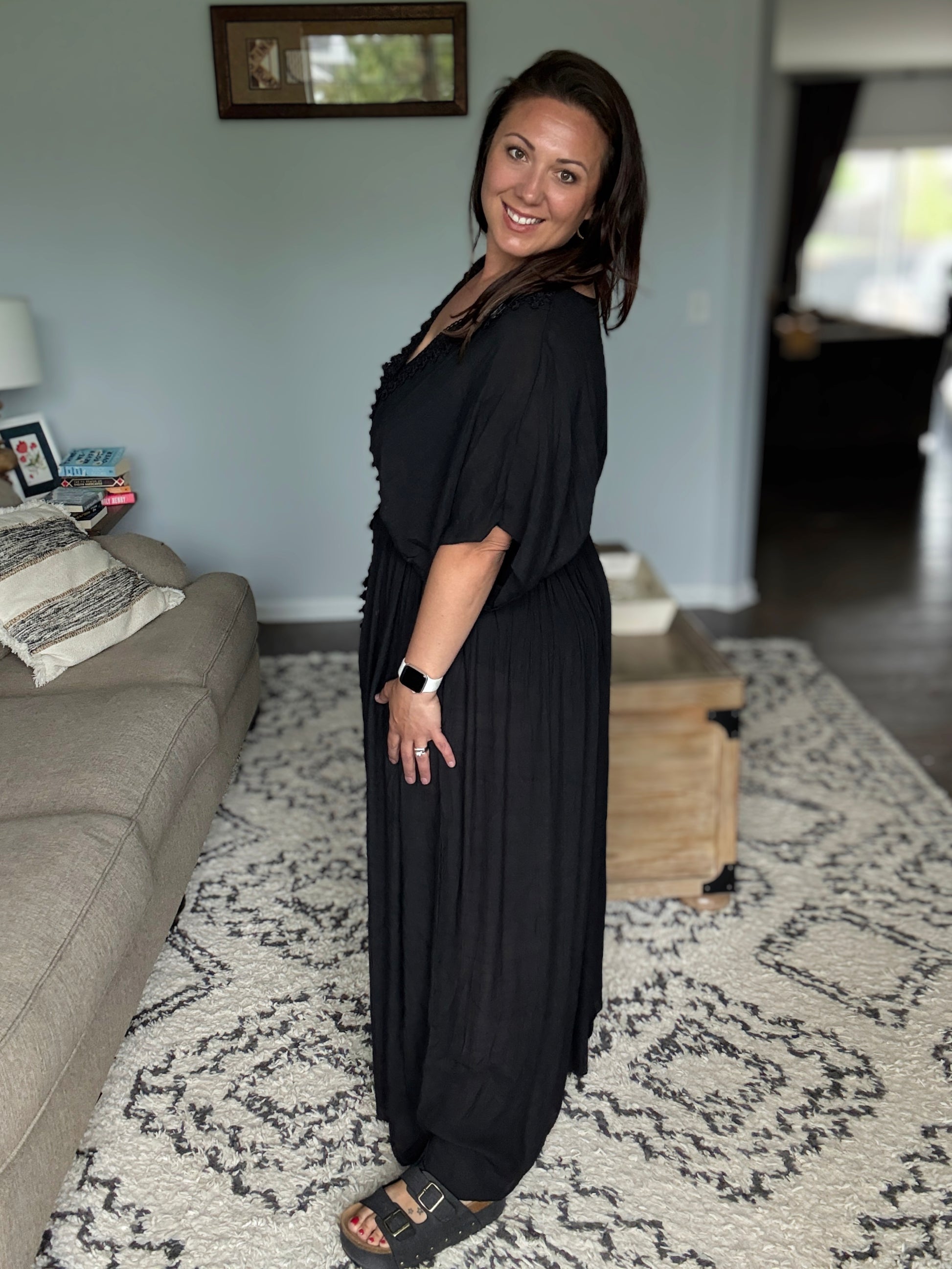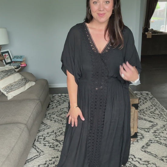 Get ready to hit the beach in style with our Serena Sands Swim Cover Up! Made from a textured, sheer woven fabric, this cover up adds a touch of elegance to your beach look. The V-neckline and batwing sleeves provide a relaxed yet chic fit, while the cased elastic waistline offers comfort and a flattering silhouette. With crocheted front detail, this cover up is a must-have for your next beach vacation.