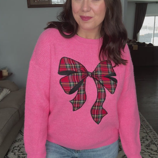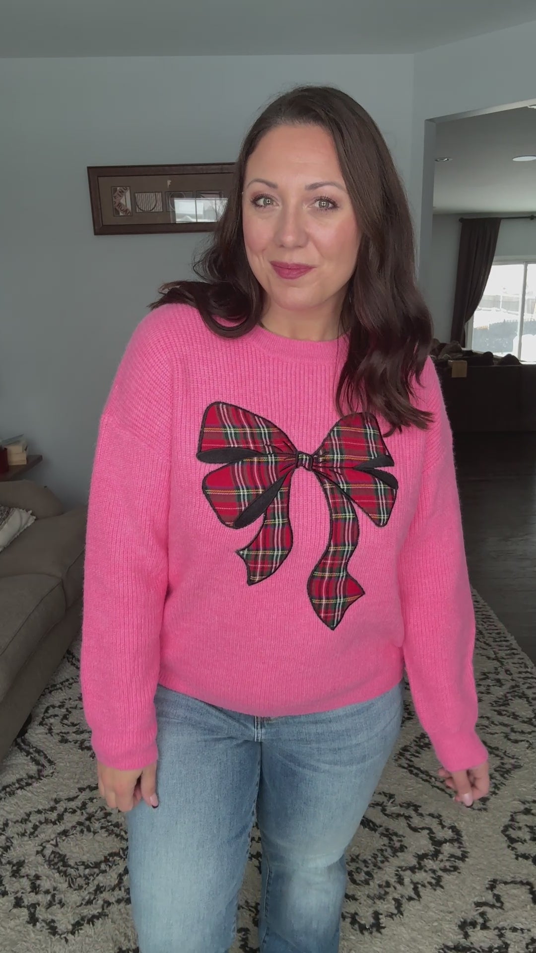 Make the season merry and stylish with the Pink Tartan Bow Sweater — the cutest pop of holiday cheer without feeling over-the-top. This soft, cozy knit features a bold pink base paired with an oversized tartan bow appliqué that steals the show in the best way.