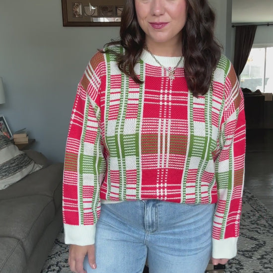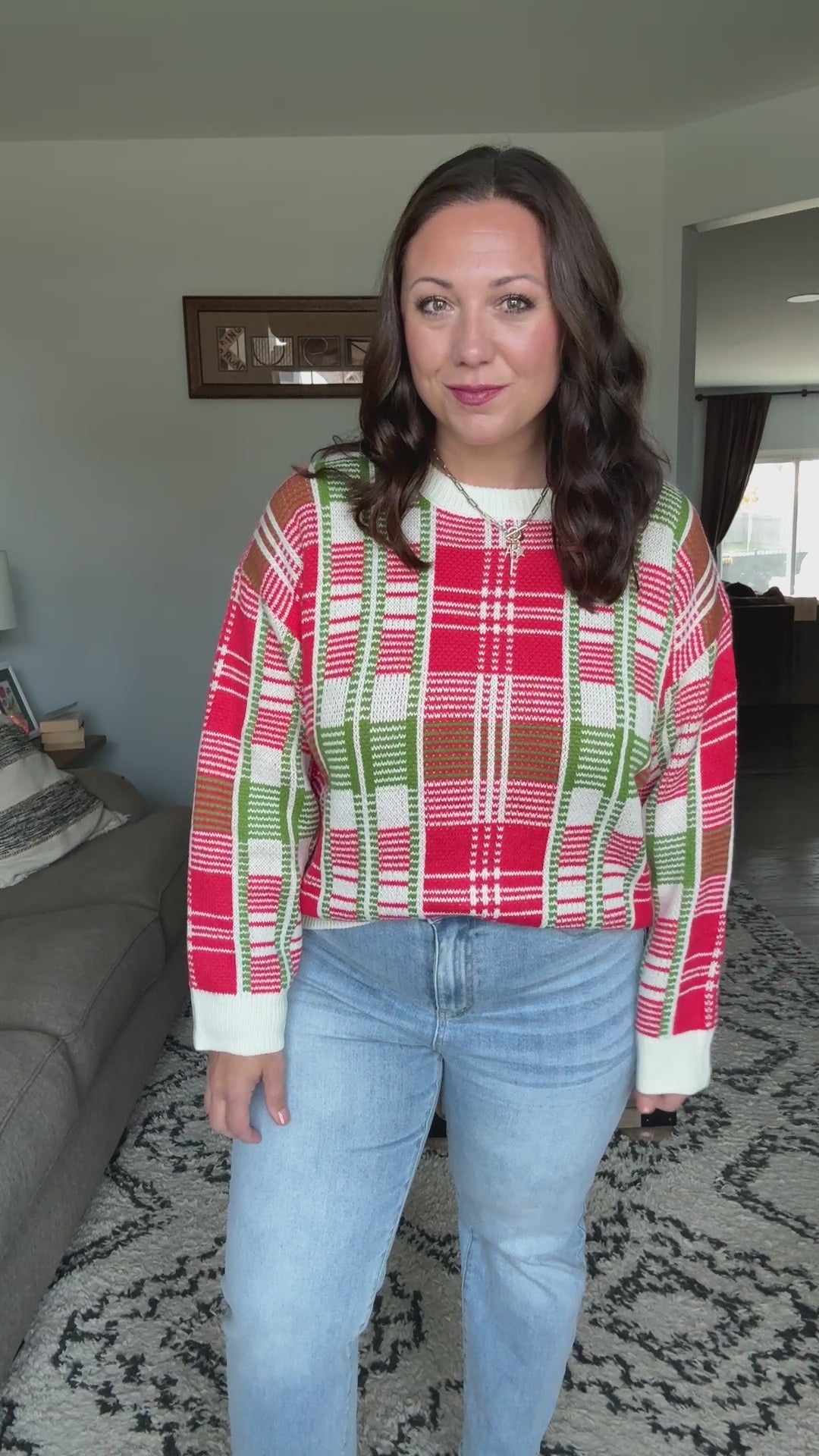 This Christmas colored plaid crew neck sweater is a festive and stylish choice for the holiday season. This sweater captures the spirit of the season. The crew neck design offers a versatile and timeless silhouette, perfect for festive gatherings or casual outings. Stay cozy and warm with the soft and comfortable fabric of this sweater. Embrace the holiday cheer with this Christmas color checkered plaid crew neck sweater that combines style and festive spirit effortlessly.