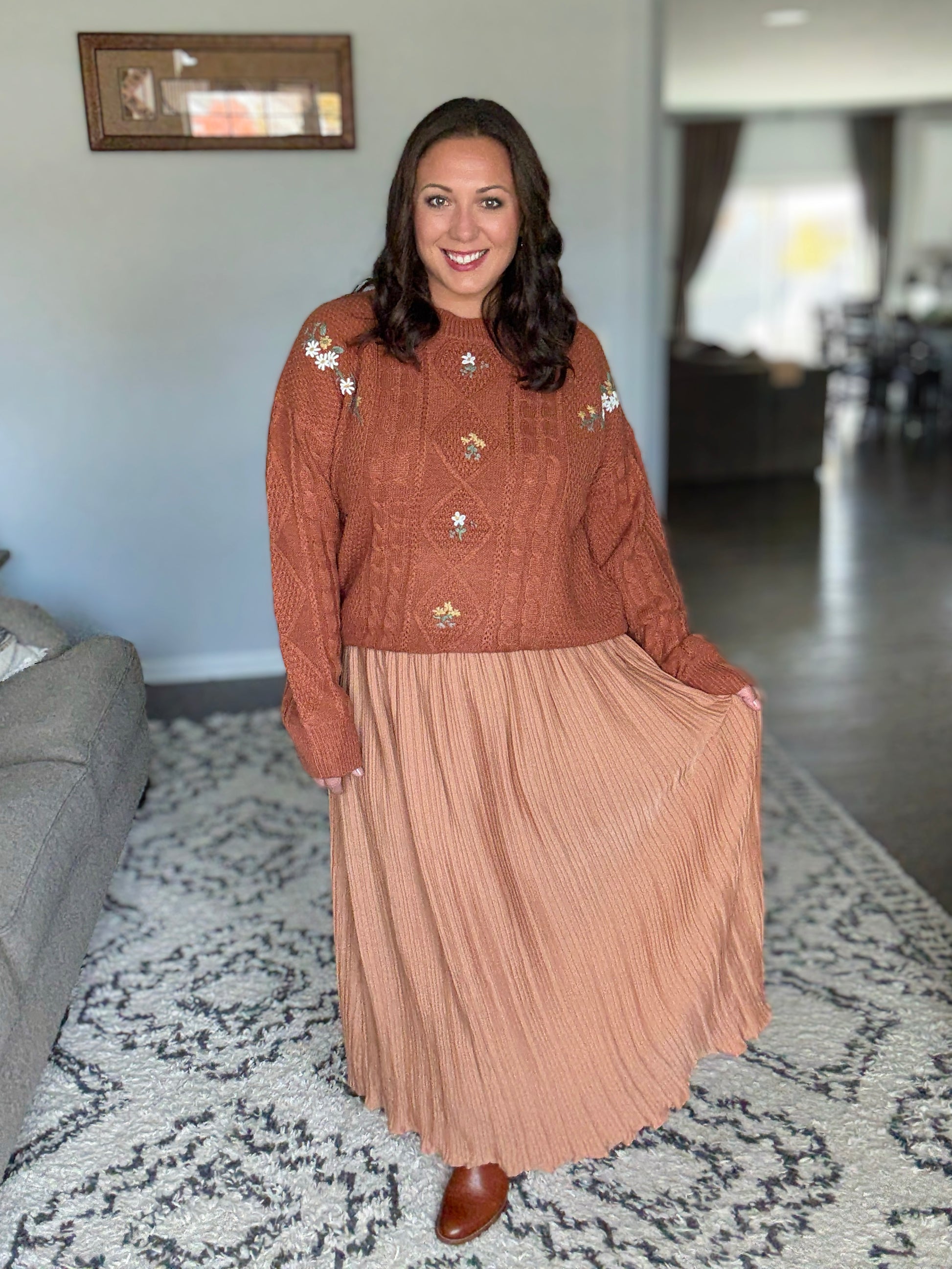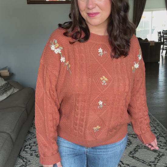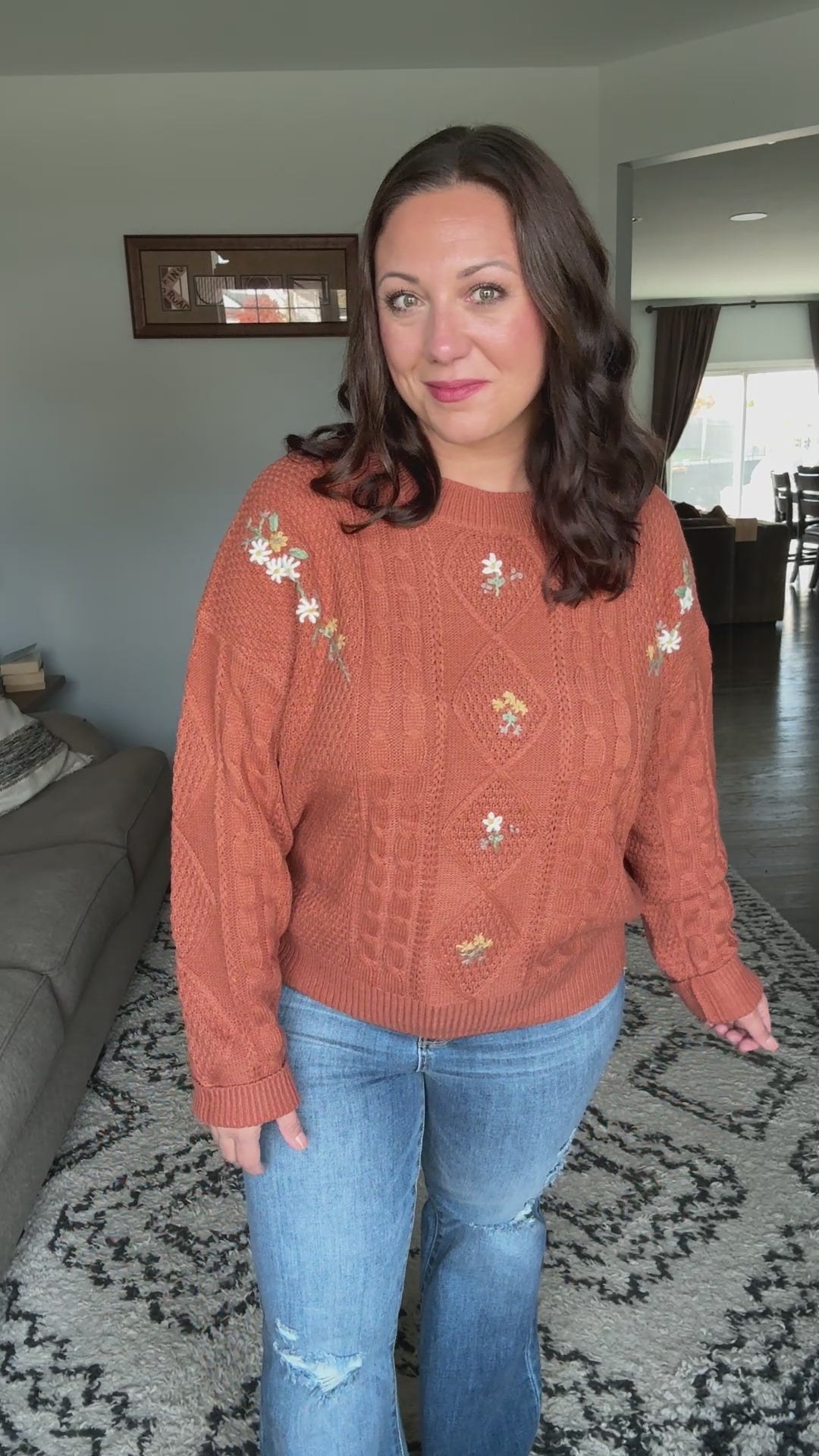 Elevate your wardrobe with this charming embroidered flower cable knitted sweater. The intricate floral embroidery adds a delicate and feminine touch to the classic cable knit design. This cozy sweater features a crew neck and long sleeves, perfect for keeping you warm and stylish during the colder months. The textured cable knit pattern adds depth and interest to the sweater, making it a standout piece in your closet. Pair this sweater with jeans or a skirt for a versatile and on-trend look that is sure to make a statement.