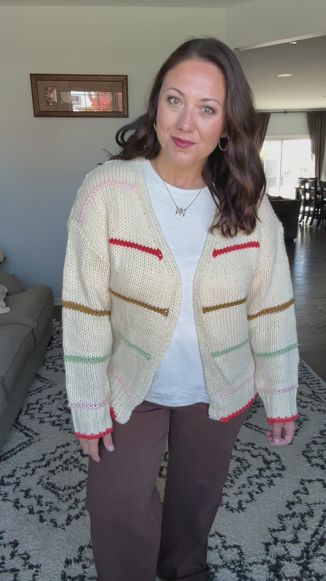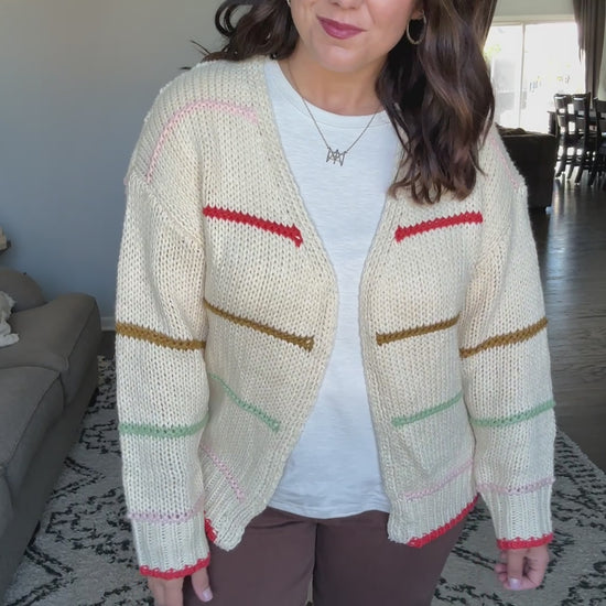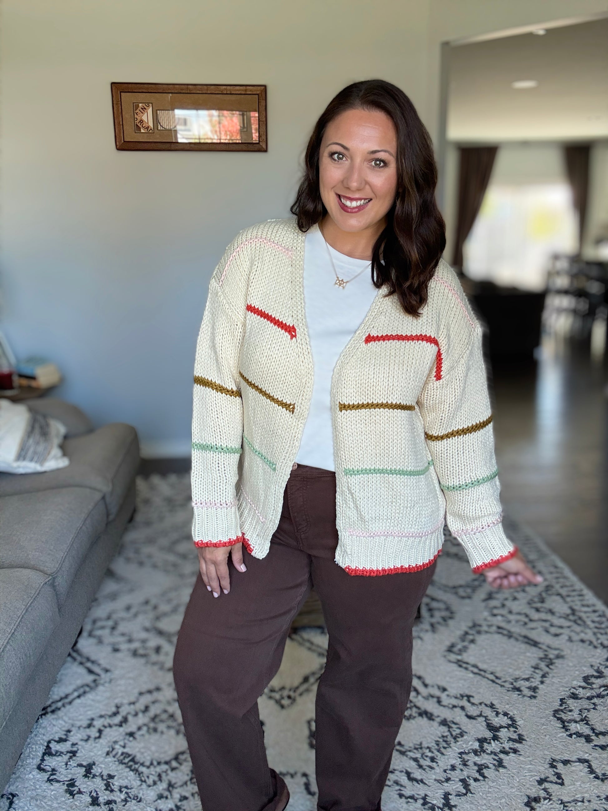 Stay cozy in this Chunky Knit Multi Stripe Open Front Cardigan. The multi-stripe design adds a playful touch and pop of color to this cardigan. The open front design makes it versatile for layering. Pair it with jeans or leggings for a relaxed yet chic look that will keep you warm and on-trend this cozy season.