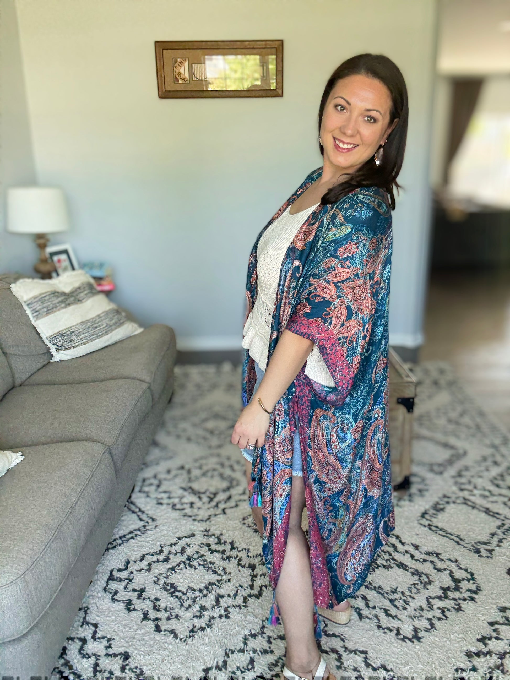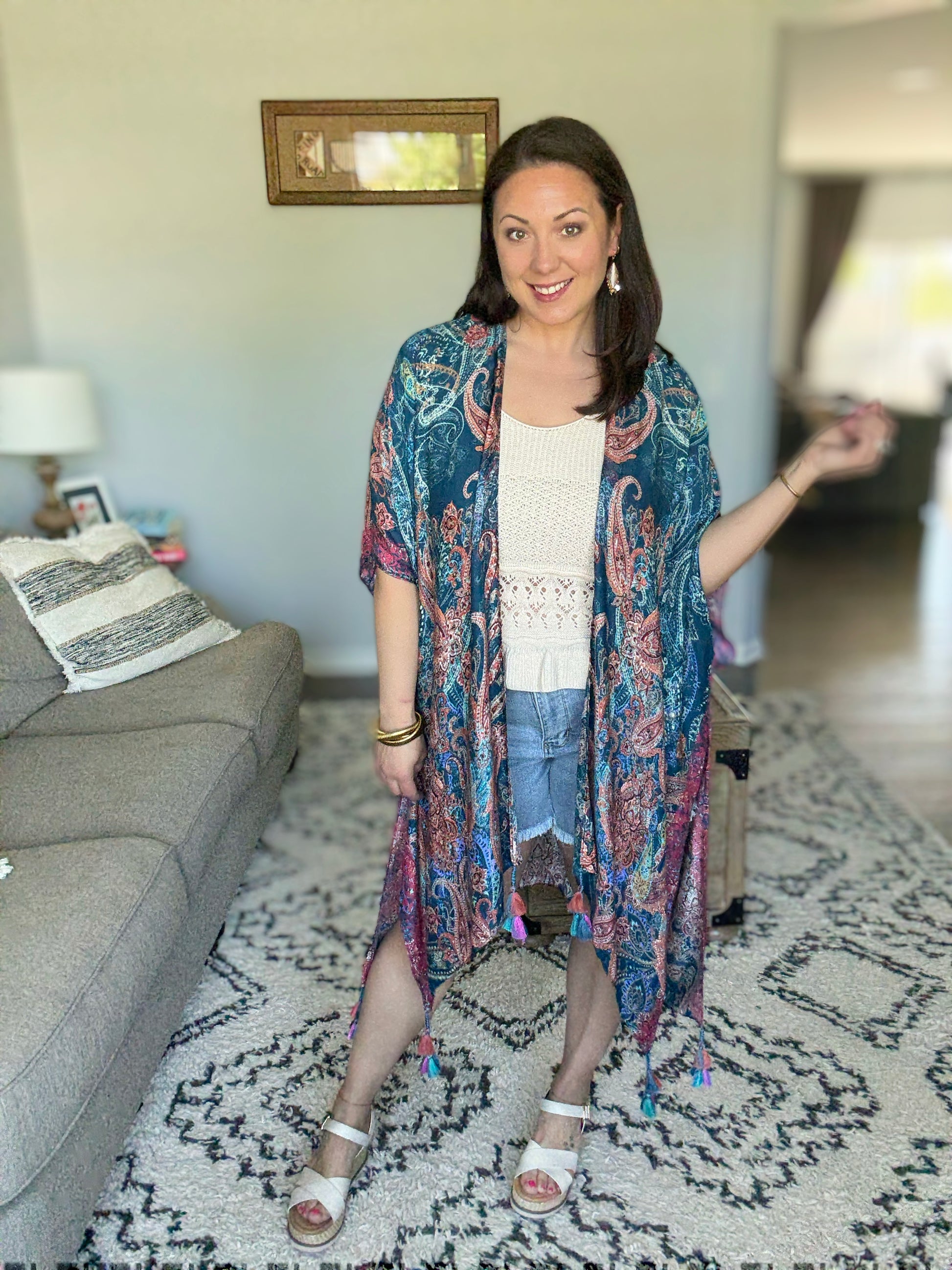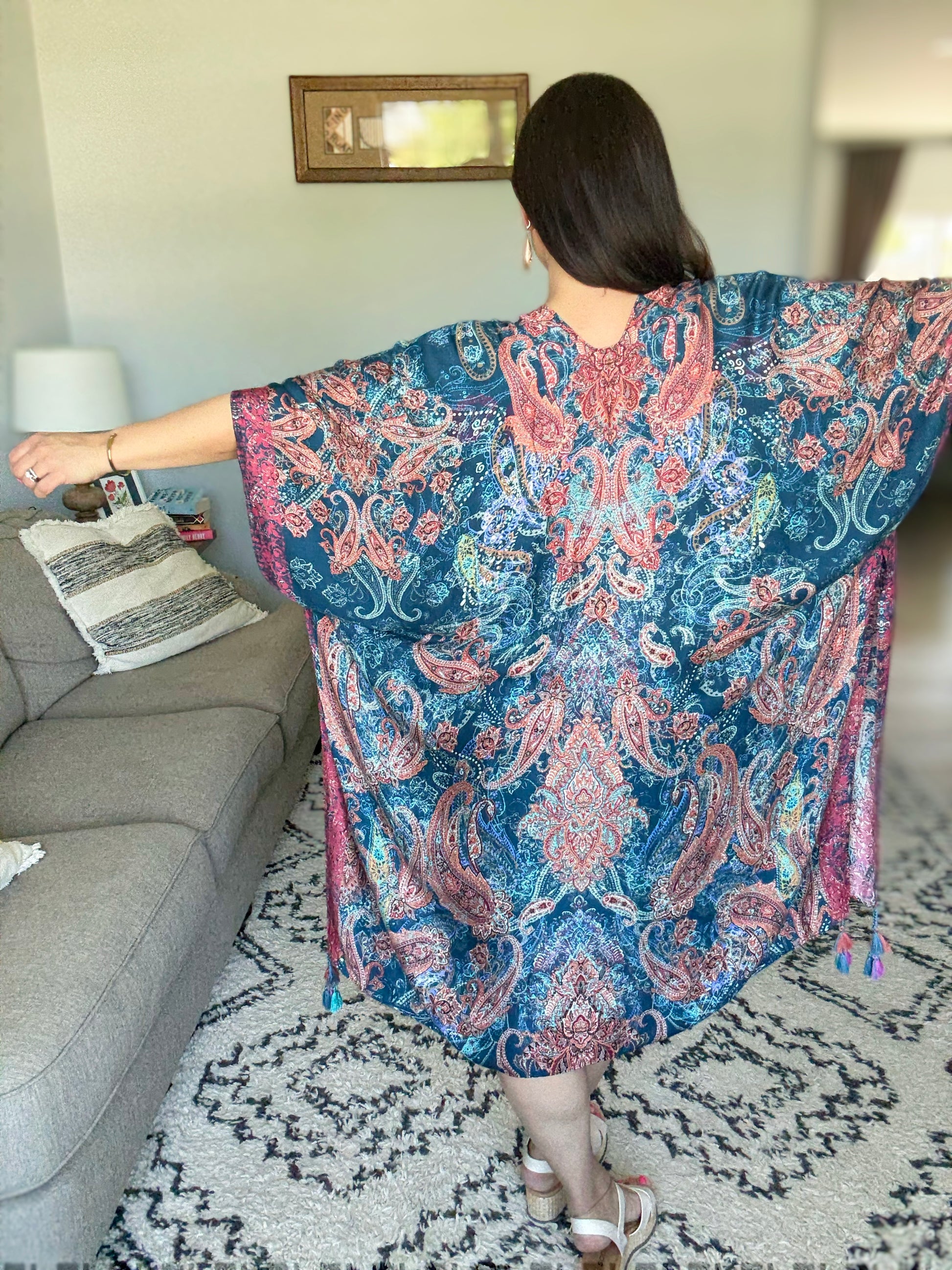 Breezy and effortless, this kimono is the perfect lightweight layer for sun-drenched days and summer evenings. Adorned with a shadow effect print that gracefully mingles with a timeless paisley print. The meticulous arrangement and corner braided tassels create an exquisite piece, truly one of a kind. She’s a true beauty!