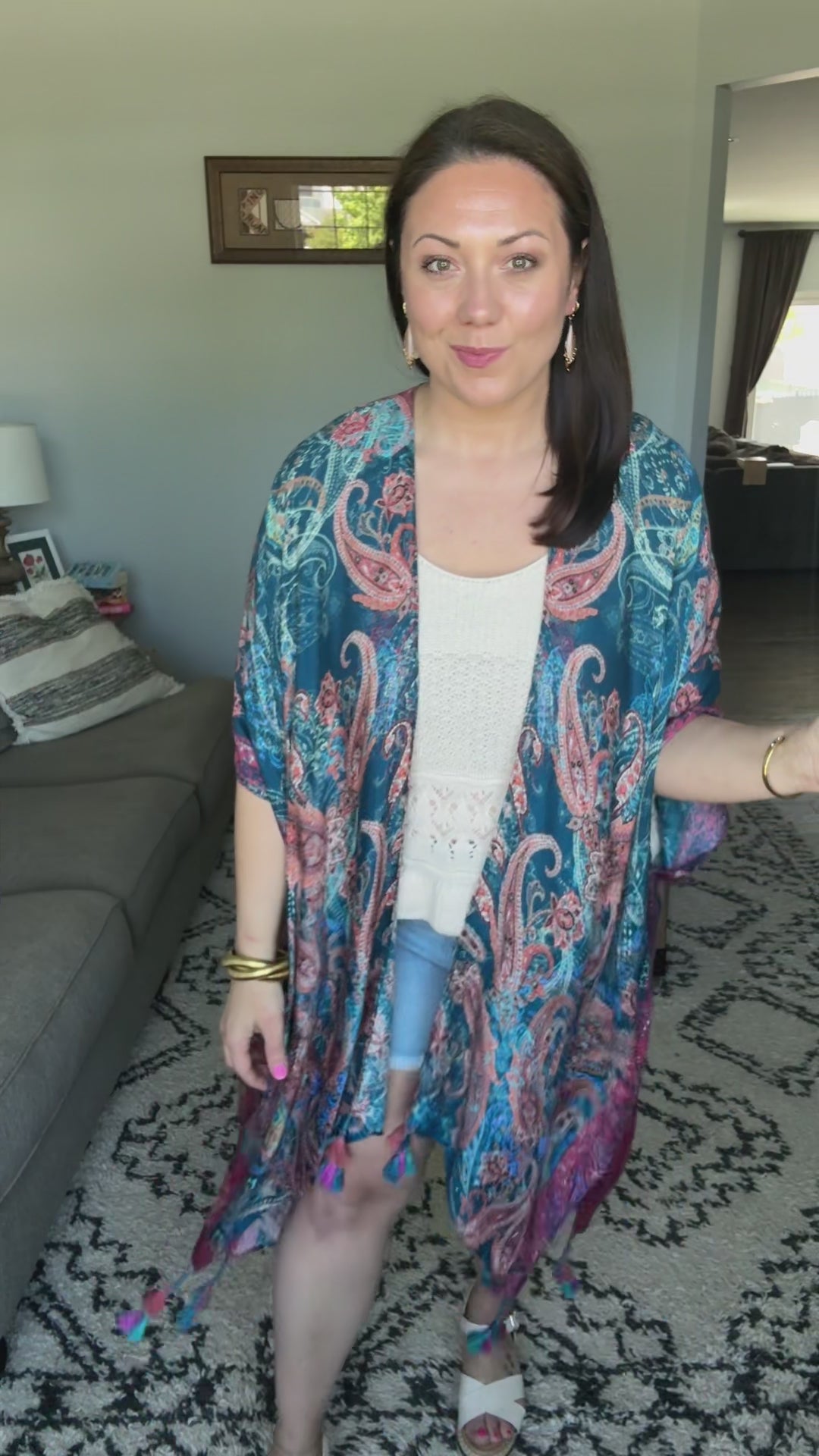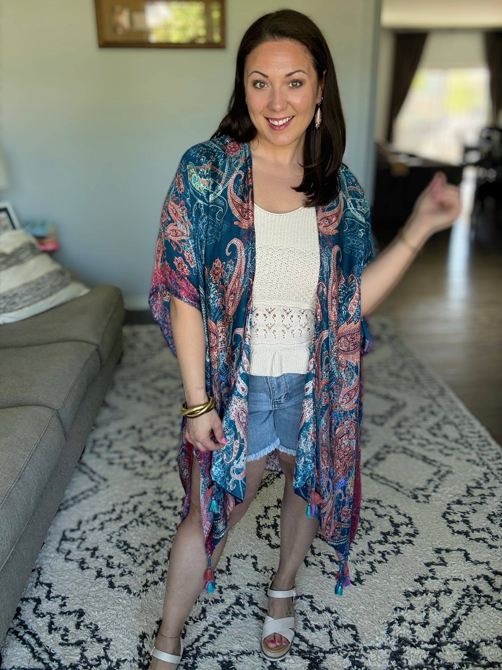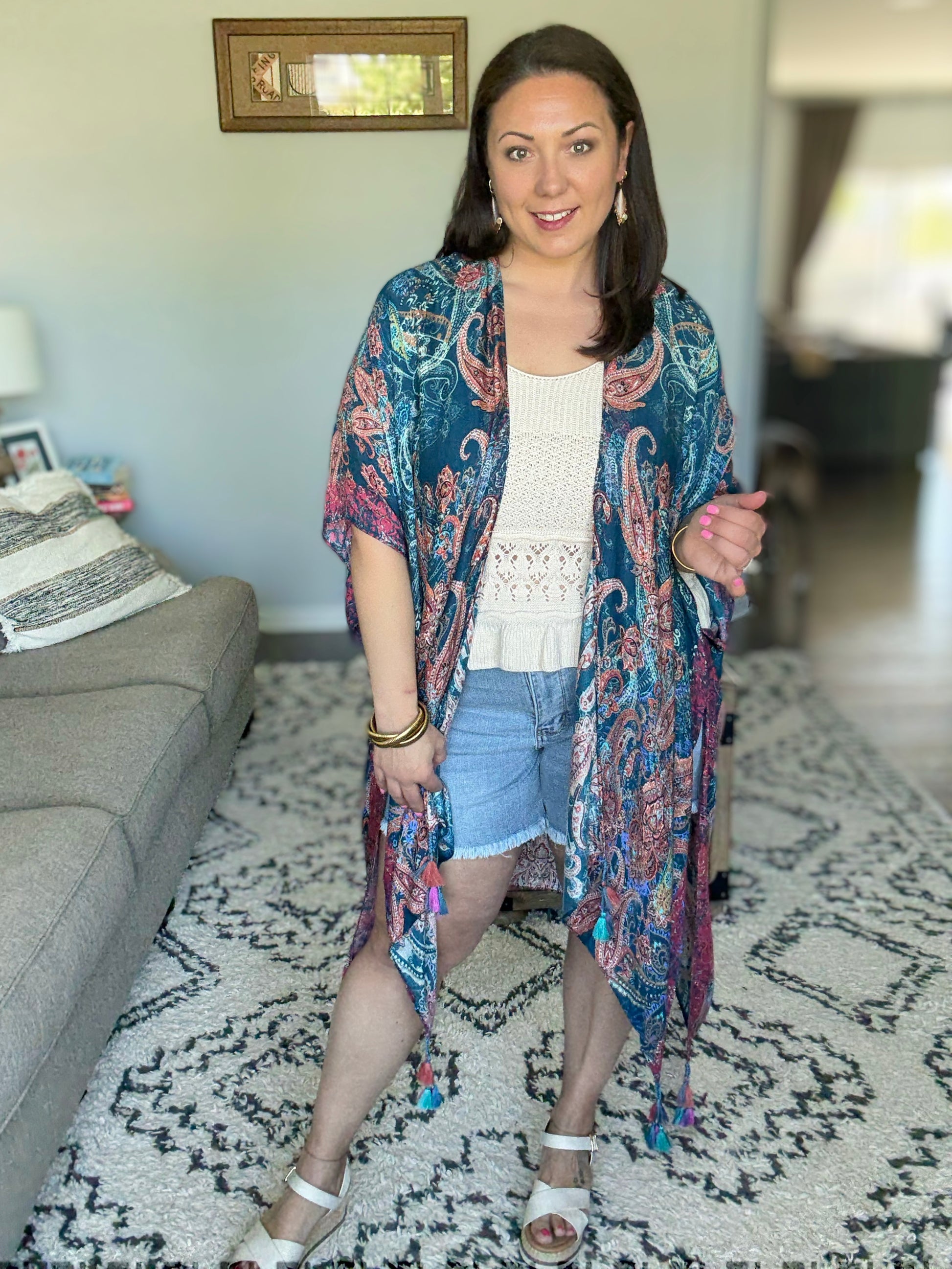 Breezy and effortless, this kimono is the perfect lightweight layer for sun-drenched days and summer evenings. Adorned with a shadow effect print that gracefully mingles with a timeless paisley print. The meticulous arrangement and corner braided tassels create an exquisite piece, truly one of a kind. She’s a true beauty!
