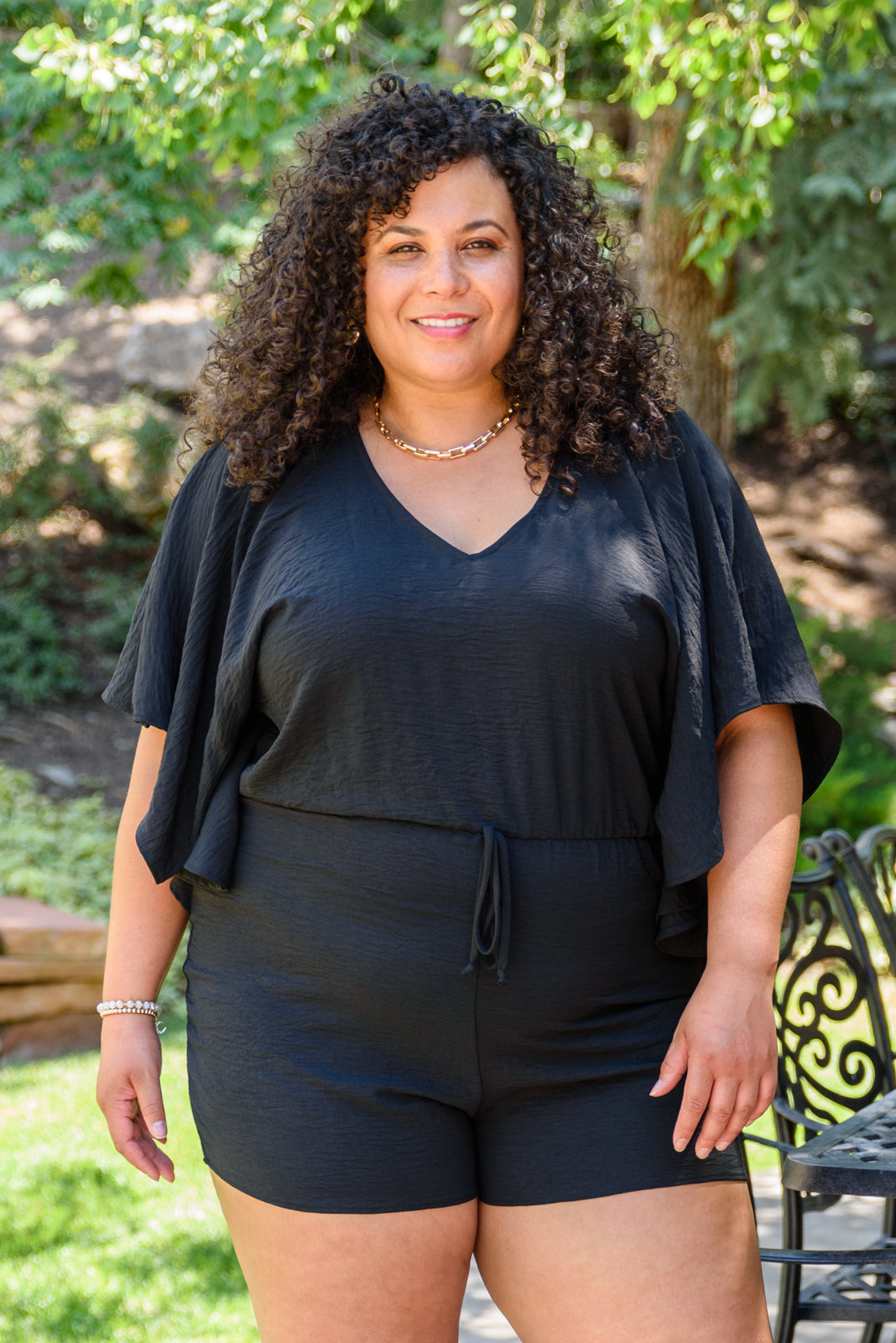 Create a look that can take you anywhere you want to go in the Sunset Blvd Romper! A lightweight, breezy fabric shapes a v-neckline that falls into flowy, kimono style sleeves. The elasticated drawstring waist creates a flattering silhouette, topping flowy black shorts! Pair with heels and a shoulder bag for your next night out!