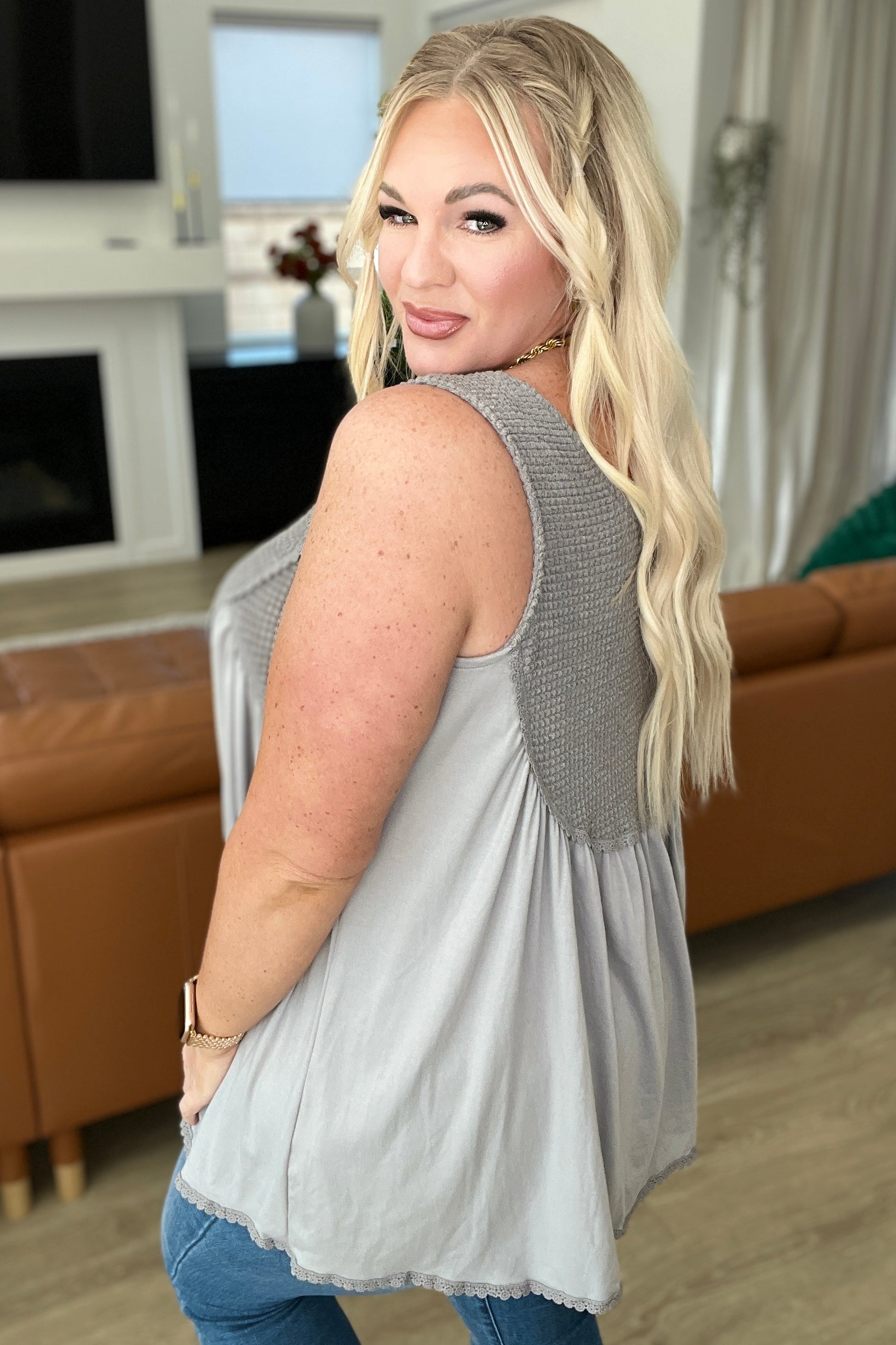This Waffle Knit Swing Tank offers an oversized fit with a soft jersey knit bottom and textured waffle knit top. The faux buttons and trim detail add a touch of sophistication to this cozy tank. Perfect for lounging or dressing up for a casual occasion.